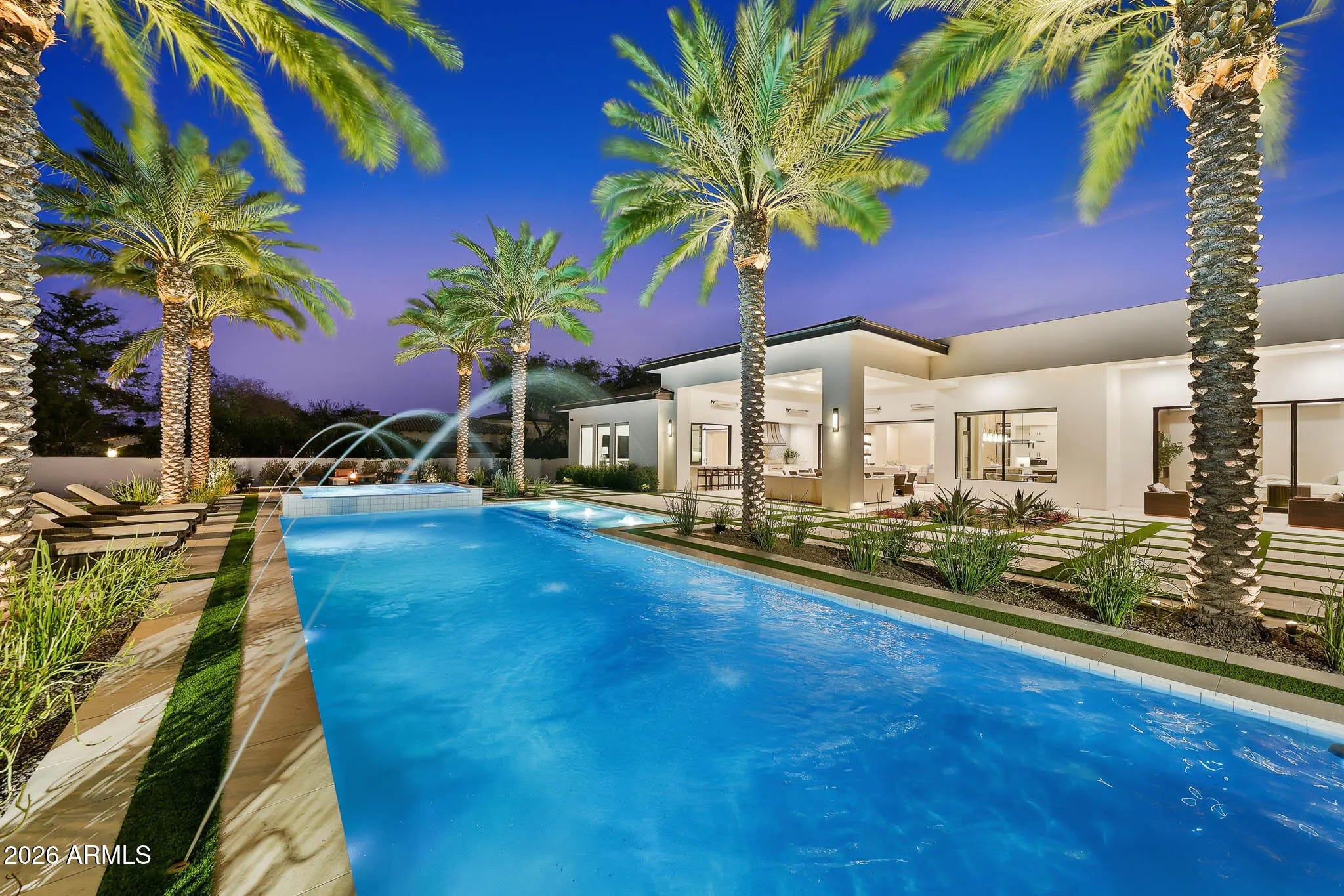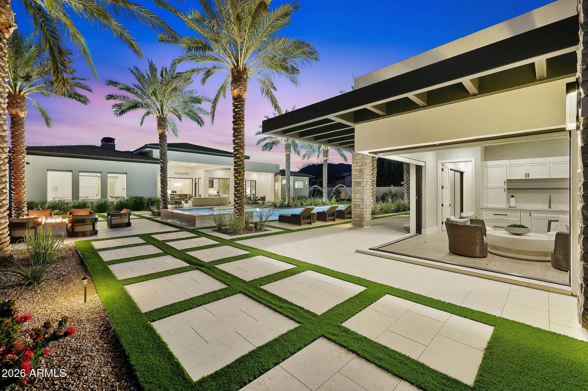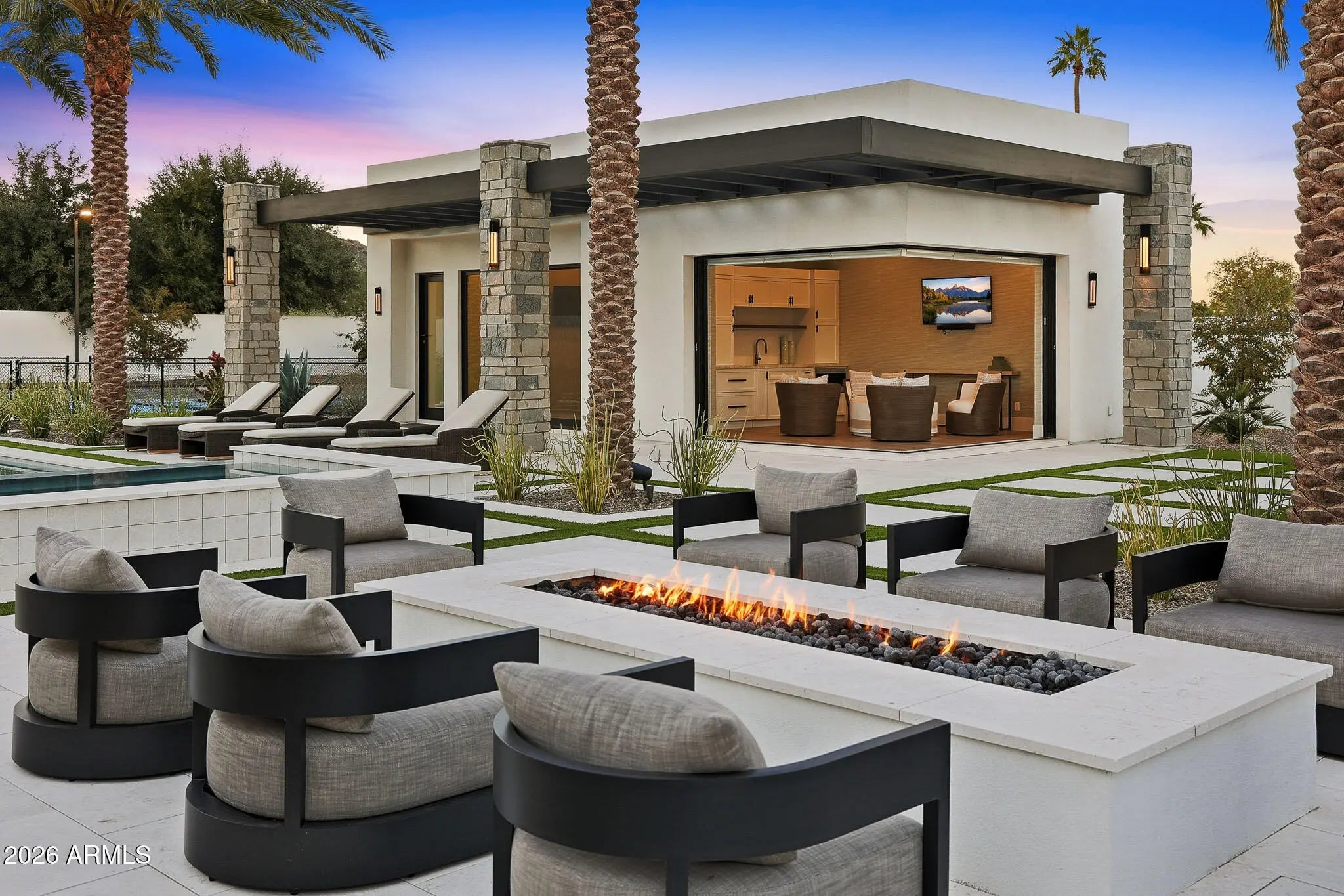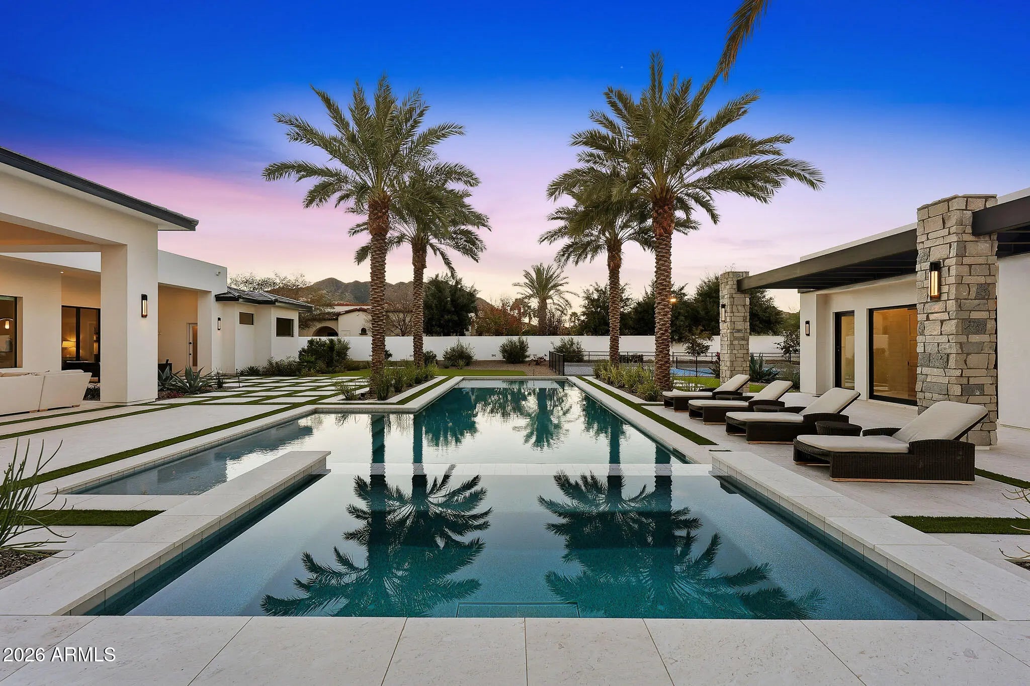 Premier Paradise Valley living with breathtaking Camelback Mountain views. This exceptional Forte Homes residence is ideally positioned in one of PV's most desirable locations and offers a rare blend of modern architecture, resort-style outdoor living, and elevated luxury finishes throughout. The main residence spans 6,509 sq ft and is complemented by a 575 sq ft detached guest house, creating a total of 6 bedrooms and 6.5 bathrooms. Designed with a desirable split floor plan, the home features an expansive great room with soaring ceilings and dramatic wood beam details in both the living and dining areas. Walls of glass seamlessly connect indoor and outdoor living spaces, perfect for entertaining. The chef's kitchen is equipped with Sub-Zero and Wolf appliances and opens to the great room, while additional interior highlights include a private office, formal dining room with a stunning climate-controlled wine room, and a versatile flex room with an indoor/outdoor bar. High-end wall coverings throughout, along with Rocky Mountain Hardware, Visual Comfort lighting, Control4 smart-home automation, Taj Mahal quartz throughout, and luxury engineered hardware at every turn. The resort-style backyard is a true showpiece, framed by rows of gorgeous, mature palm trees and designed for both relaxation and recreation. Outdoor amenities include a large heated pool and spa with water features, multiple covered patios, fire features, lush landscaping, and a full-size pickleball courtcreating a private oasis ideal for year-round enjoyment. The detached guest house offers full living accommodations, including a living area, kitchen, and bathroomperfect for guests, extended family, or a private retreat. Additional features include a gated driveway, four-car garage with 12' ceilings, premier neighborhood setting, and close proximity to top-rated schools. A rare opportunity to own a refined, move-in-ready luxury estate in the heart of Paradise Valley.