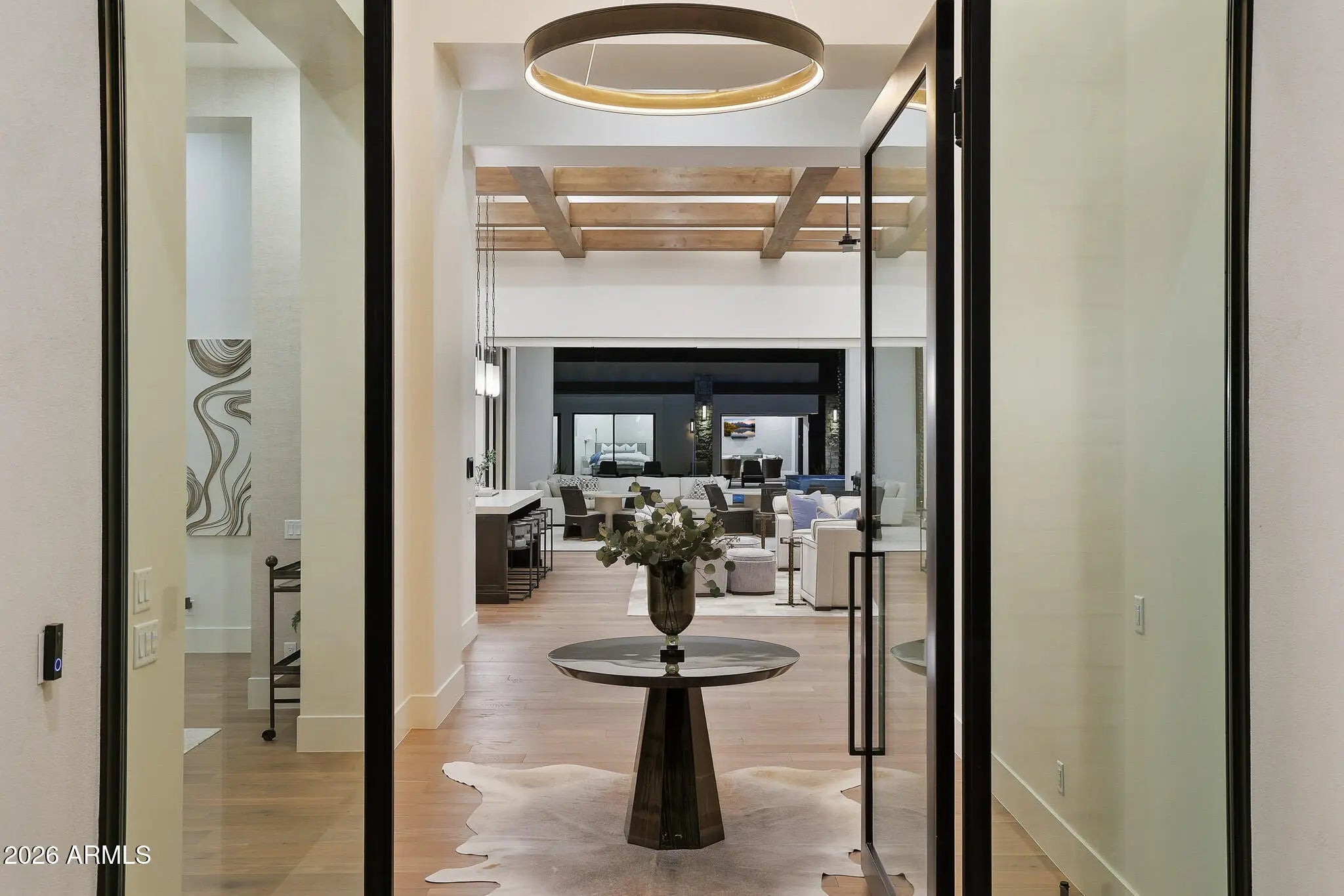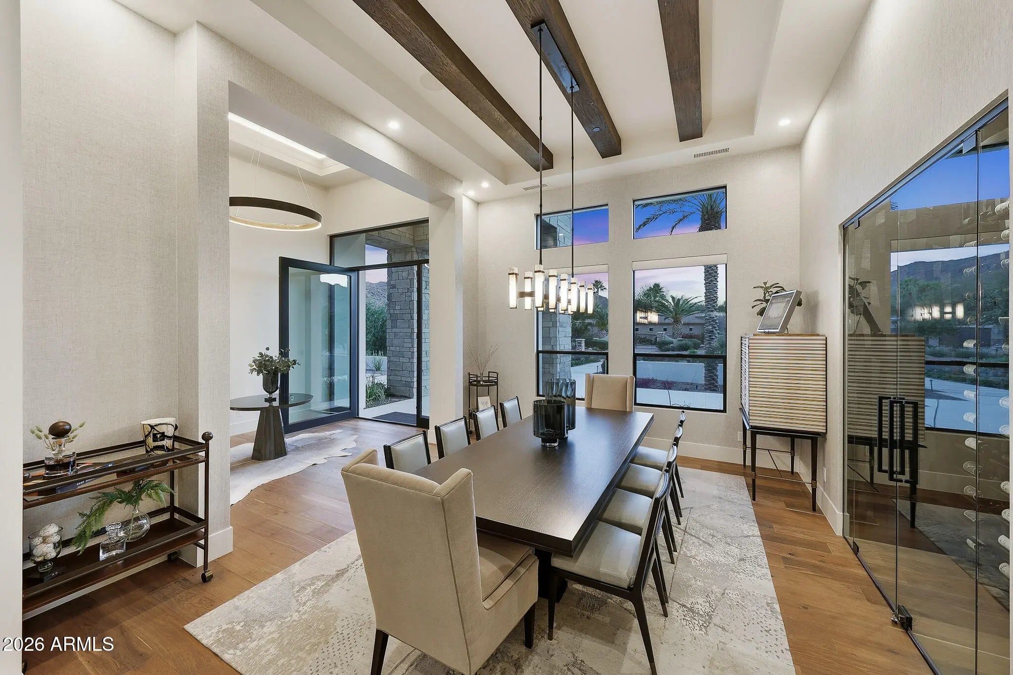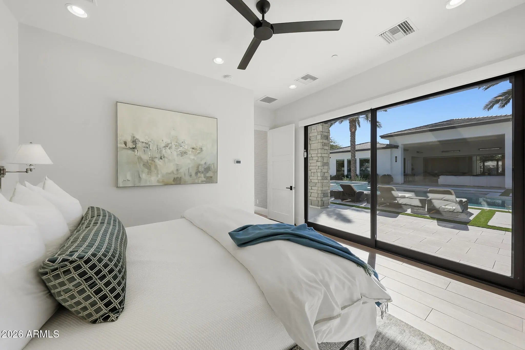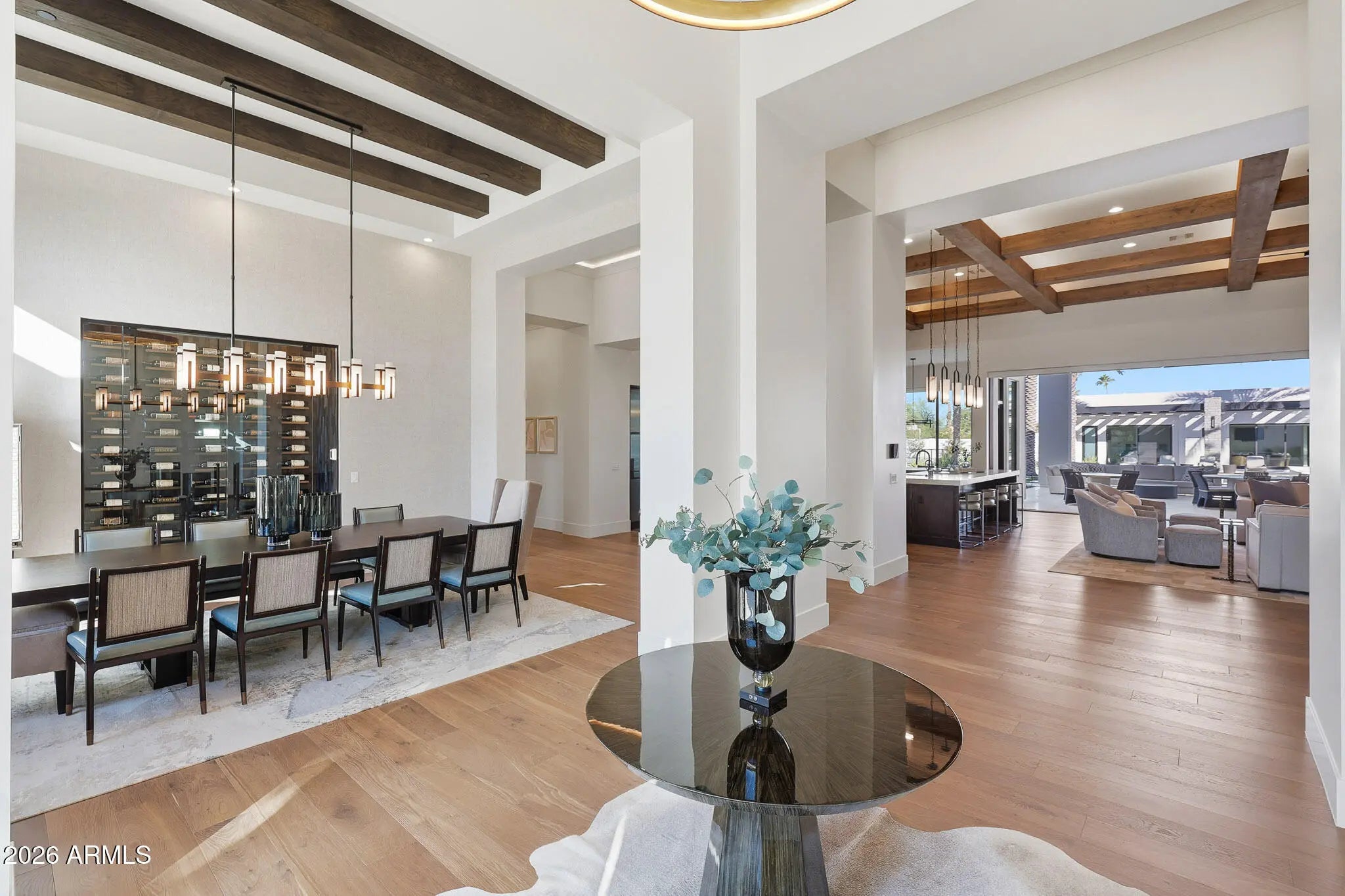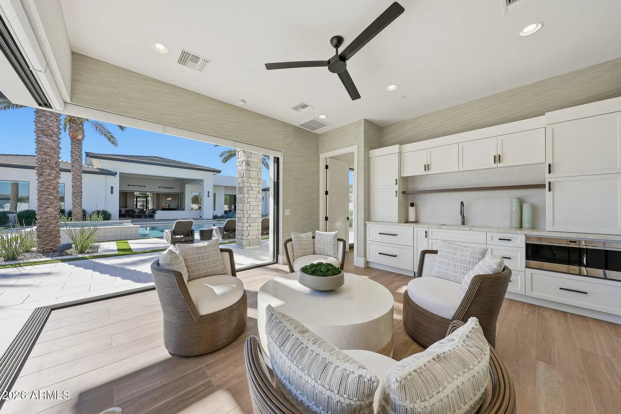 Premier Paradise Valley living with breathtaking Camelback Mountain views. This exceptional Forte Homes residence is ideally positioned in one of PV's most desirable locations and offers a rare blend of modern architecture, resort-style outdoor living, and elevated luxury finishes throughout. The main residence spans 6,509 sq ft and is complemented by a 575 sq ft detached guest house, creating a total of 6 bedrooms and 6.5 bathrooms. Designed with a desirable split floor plan, the home features an expansive great room with soaring ceilings and dramatic wood beam details in both the living and dining areas. Walls of glass seamlessly connect indoor and outdoor living spaces, perfect for entertaining. The chef's kitchen is equipped with Sub-Zero and Wolf appliances and opens to the great room, while additional interior highlights include a private office, formal dining room with a stunning climate-controlled wine room, and a versatile flex room with an indoor/outdoor bar. High-end wall coverings throughout, along with Rocky Mountain Hardware, Visual Comfort lighting, Control4 smart-home automation, Taj Mahal quartz throughout, and luxury engineered hardware at every turn. The resort-style backyard is a true showpiece, framed by rows of gorgeous, mature palm trees and designed for both relaxation and recreation. Outdoor amenities include a large heated pool and spa with water features, multiple covered patios, fire features, lush landscaping, and a full-size pickleball courtcreating a private oasis ideal for year-round enjoyment. The detached guest house offers full living accommodations, including a living area, kitchen, and bathroomperfect for guests, extended family, or a private retreat. Additional features include a gated driveway, four-car garage with 12' ceilings, premier neighborhood setting, and close proximity to top-rated schools. A rare opportunity to own a refined, move-in-ready luxury estate in the heart of Paradise Valley.