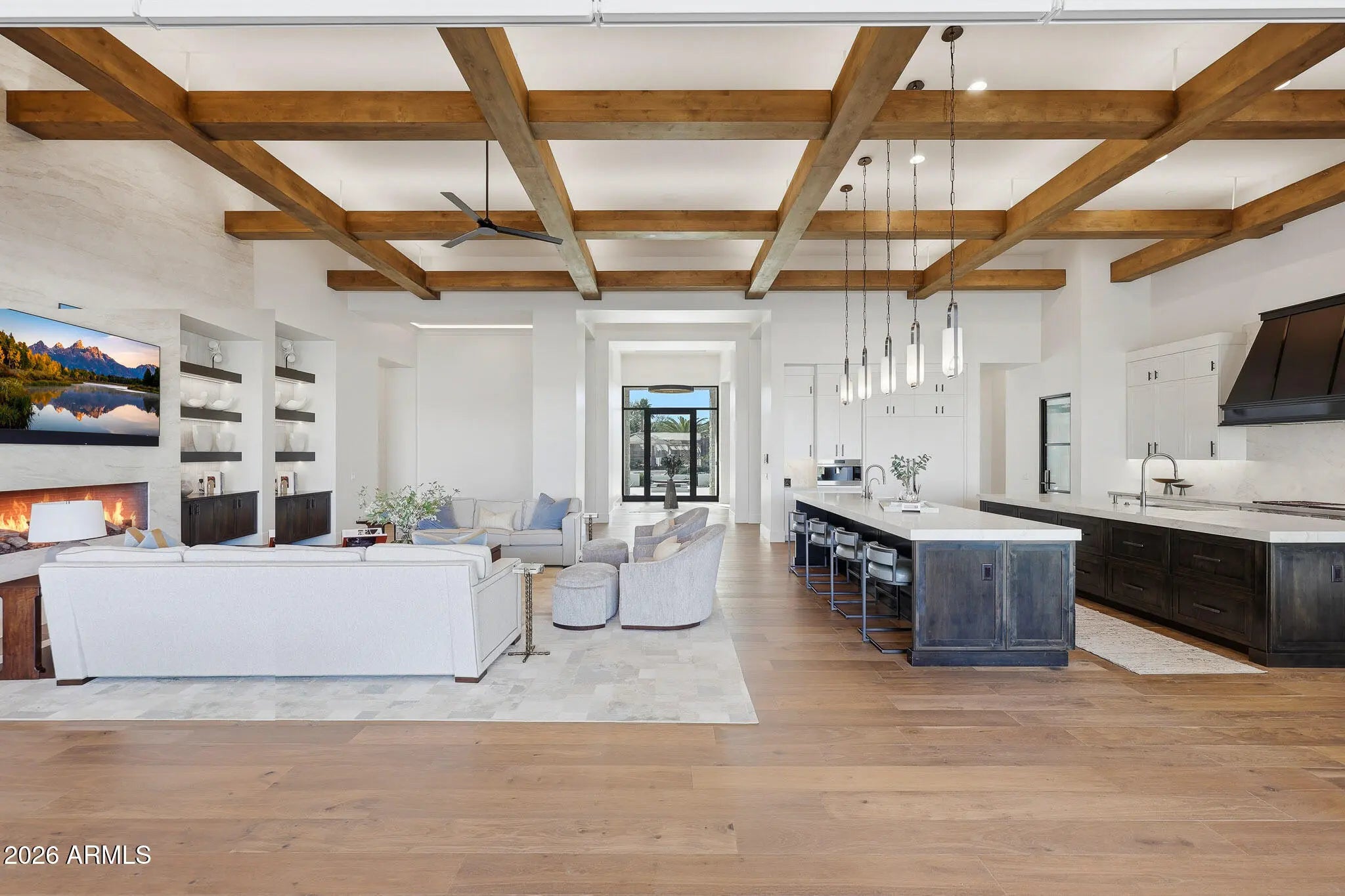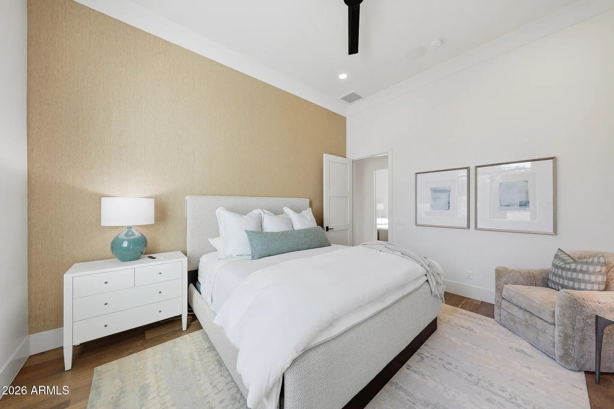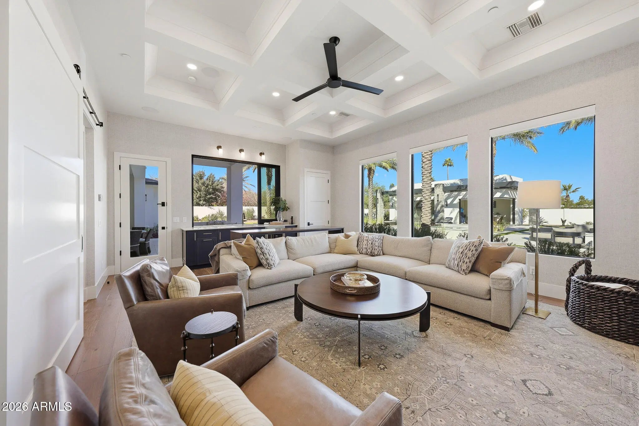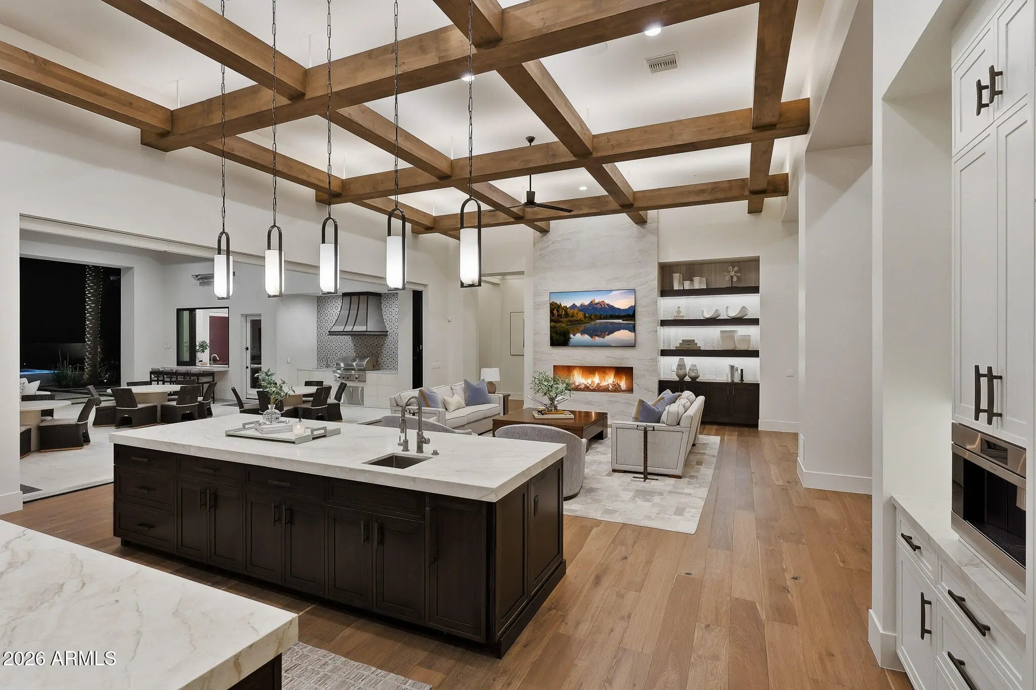 Premier Paradise Valley living with breathtaking Camelback Mountain views. This exceptional Forte Homes residence is ideally positioned in one of PV's most desirable locations and offers a rare blend of modern architecture, resort-style outdoor living, and elevated luxury finishes throughout. The main residence spans 6,509 sq ft and is complemented by a 575 sq ft detached guest house, creating a total of 6 bedrooms and 6.5 bathrooms. Designed with a desirable split floor plan, the home features an expansive great room with soaring ceilings and dramatic wood beam details in both the living and dining areas. Walls of glass seamlessly connect indoor and outdoor living spaces, perfect for entertaining. The chef's kitchen is equipped with Sub-Zero and Wolf appliances and opens to the great room, while additional interior highlights include a private office, formal dining room with a stunning climate-controlled wine room, and a versatile flex room with an indoor/outdoor bar. High-end wall coverings throughout, along with Rocky Mountain Hardware, Visual Comfort lighting, Control4 smart-home automation, Taj Mahal quartz throughout, and luxury engineered hardware at every turn. The resort-style backyard is a true showpiece, framed by rows of gorgeous, mature palm trees and designed for both relaxation and recreation. Outdoor amenities include a large heated pool and spa with water features, multiple covered patios, fire features, lush landscaping, and a full-size pickleball courtcreating a private oasis ideal for year-round enjoyment. The detached guest house offers full living accommodations, including a living area, kitchen, and bathroomperfect for guests, extended family, or a private retreat. Additional features include a gated driveway, four-car garage with 12' ceilings, premier neighborhood setting, and close proximity to top-rated schools. A rare opportunity to own a refined, move-in-ready luxury estate in the heart of Paradise Valley.