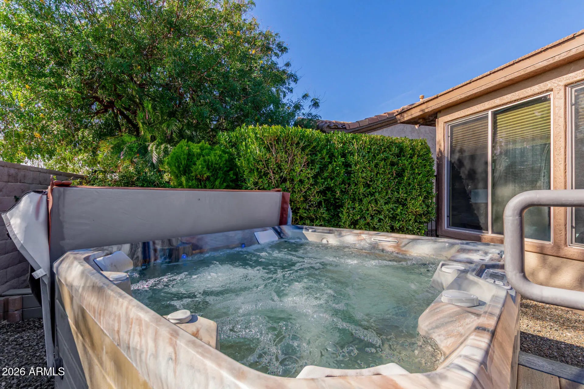 Welcome to this PRIVATE and PRISTINE 2bd/2ba + den/office ''Montis'' floor plan, ideally tucked away at the end of the street with no neighbors behind or on one side! Features TWO PRIVATE OUTDOOR SPACES and a coveted SOUTH-facing backyard, to enjoy the best of Arizona living. This OPEN CONCEPT home is filled with natural light and has neutral flooring throughout, PLANTATION SHUTTERS, and a thoughtfully designed layout. The STUNNING eat-in kitchen showcases premium slab granite countertops, high-end Samsung stainless-steel appliances, GAS range, center island, full tile backsplash, and refinished staggered cabinetry. A sliding glass door off the kitchen opens to the gated front courtyard-ideal for morning coffee or casual gatherings. The great room offers a comfortable and inviting space with a media niche and floating shelves, complemented by a separate dining area. The primary suite features a BAY WINDOW overlooking the backyard, dual sinks, enclosed walk-in shower, and a LARGE walk-in closet. Guest bedroom is split from the primary for privacy. A versatile den/office provides FLEXIBLE SPACE for a home office, hobby room, or quiet retreat. Step outside to the PRIVATE south-facing backyard that is perfect for relaxing or entertaining. Highlights include a covered patio EXTENDED with stamped concrete, relaxing HOT TUB, Weber gas BBQ, and low-maintenance landscaping. Both the backyard and front courtyard are FULLY FENCED, enhancing privacy. The roomy garage is equally impressive with a BRAND-NEW EPOXY FLOOR, built-in cabinetry, and utility sink. Additional updates include exterior paint in 2024, interior paint completed December 2025, new carpeting, and new toilets. If PRIVACY and a MOVE-IN READY home are at the top of your list, this is A MUST SEE! Located within the award-winning, gated 55+ Trilogy at Vistancia, this home offers access to an unparalleled lifestyle with world-class amenities. Residents enjoy the spectacular 35,000 SF Kiva Club, featuring indoor and outdoor pools, a state-of-the-art fitness center, day spa, café, billiards, meeting rooms, library, tennis courts, pickleball, bocce ball, and an impressive calendar of social events and activities. The championship golf course designed by Gary Panks gracefully meanders throughout the community, offering breathtaking scenery and exceptional play. The Mita Club provides an additional resort-quality amenities, expanding the opportunities for recreation and connection. Trilogy's prime location offers convenient access to the 303 freeway, shopping, dining, entertainment, Lake Pleasant, and Paloma Park--packed with outdoor amenities and recreation. This extraordinary community delivers a luxurious, vibrant, and active lifestyle unlike any other.