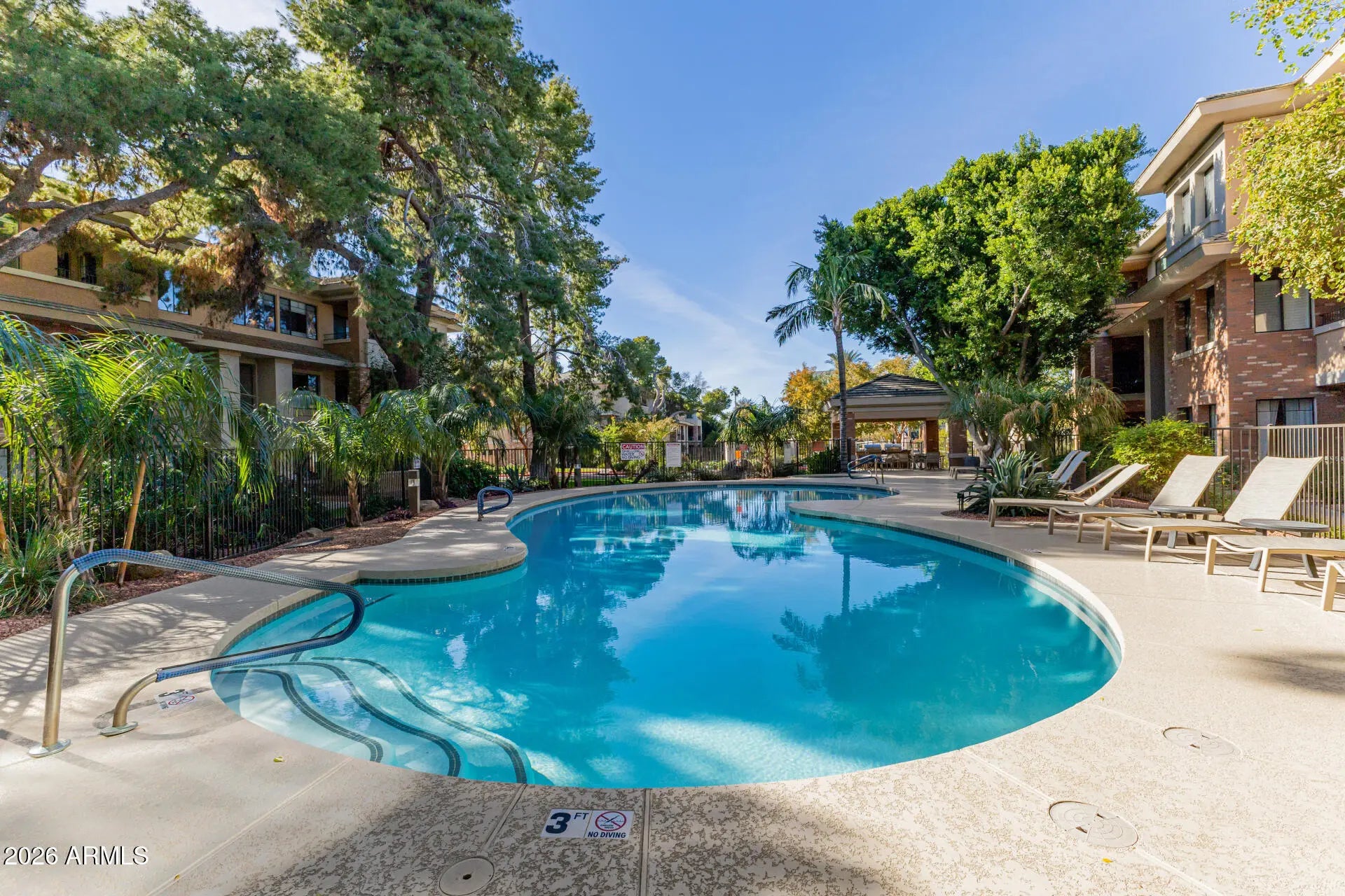 Appreciate a 3rd floor, end unit, overlooking the refreshing pool with mature, green trees as your view. Come experience this hidden island where you enter and feel like you've already left the world behind the gates! Move in ready ~ lock and leave ~ No gardener, pool person or gym membership required. Immaculate grounds compliment this 6 building complex including waterfall, koi ponds, private gates, garages, indoor lobbies, elevators, full clubhouse, fitness center and private garden. This unit has the perfect space offering easy entertaining with room and comfort. Building access to single garage plus an additional detached garage. Location is minutes from groceries, restaurants, schools and Phx Sky Airport (10 minutes). Have a slice of luxury living here.