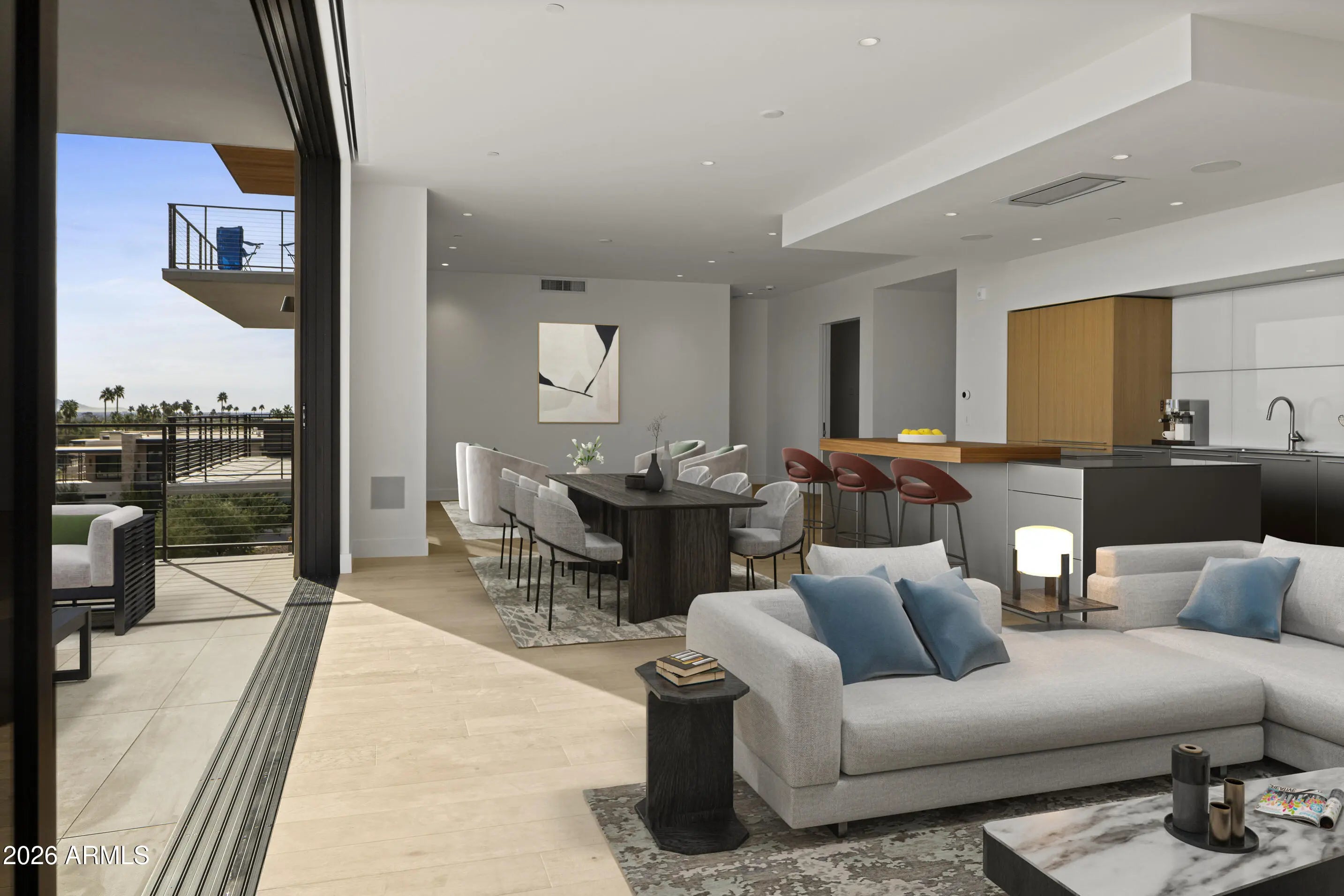 BRAND NEW/JUST COMPLETED, this UPGRADED rare 3 Bd/4Ba CORNER residence offers designer-driven living and PANORAMIC VIEWS of the McDowell Mountains, Four Peaks, Phoenician Golf Course, + Scottsdale skyline. Over $250k IN UPGRADES, including $135k of upgraded BULTHAUP CABINETRY and 78K SMART HOME upgrades. The expansive great room spans family, dining, and living zones, framed by stacked glass doors and anchored by a sleek marble fireplace. Chef's kitchen boasts a reconfigured island for entertaining and flow, dual Sub-Zero refrigerators +WINE WALL, and Wolf induction range. A spacious WRAPAROUND TERRACE W/BBQ completes one of the most comprehensively upgraded residences at Ascent, and includes access to private rooftop terraces, pools, fitness facilities, and the adjacent Phoenician Resort