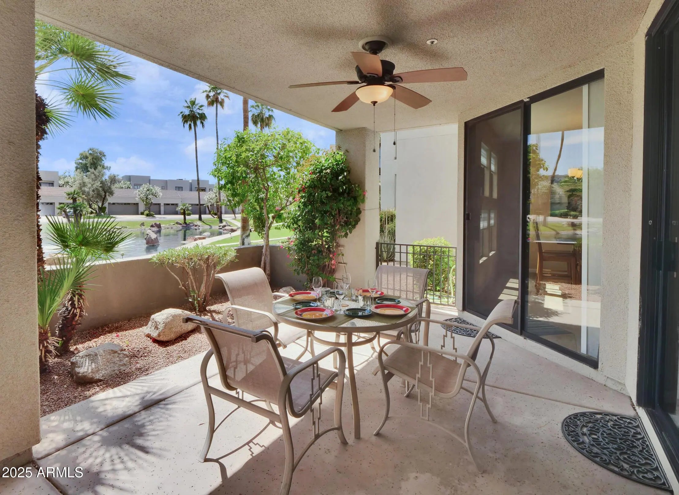 Available May 1. Totally furnished waterfront, beautiful ground-floor unit in Gainey Ranch. All utilities, Wi-Fi and cable TV included (cap on electric). No sales tax. Nautical themed art throughout. Granite kitchen with R/O drinking water system. Granite & Quartz Bathrooms. Master has king-size bed, TV, large tub, separate shower, water closet & large walk-in closet with safe. Guest Room has Q-Murphy bed or office setup. Covered patio faces the water with BBQ & ceiling fan. Two-car garage. 15,000 sq-ft Club full privileges, two pools. tennis & pickleball. Gainey Ranch is a guard-gated luxury golf community in the heart of Scottsdale. Low Seasonal Rate.