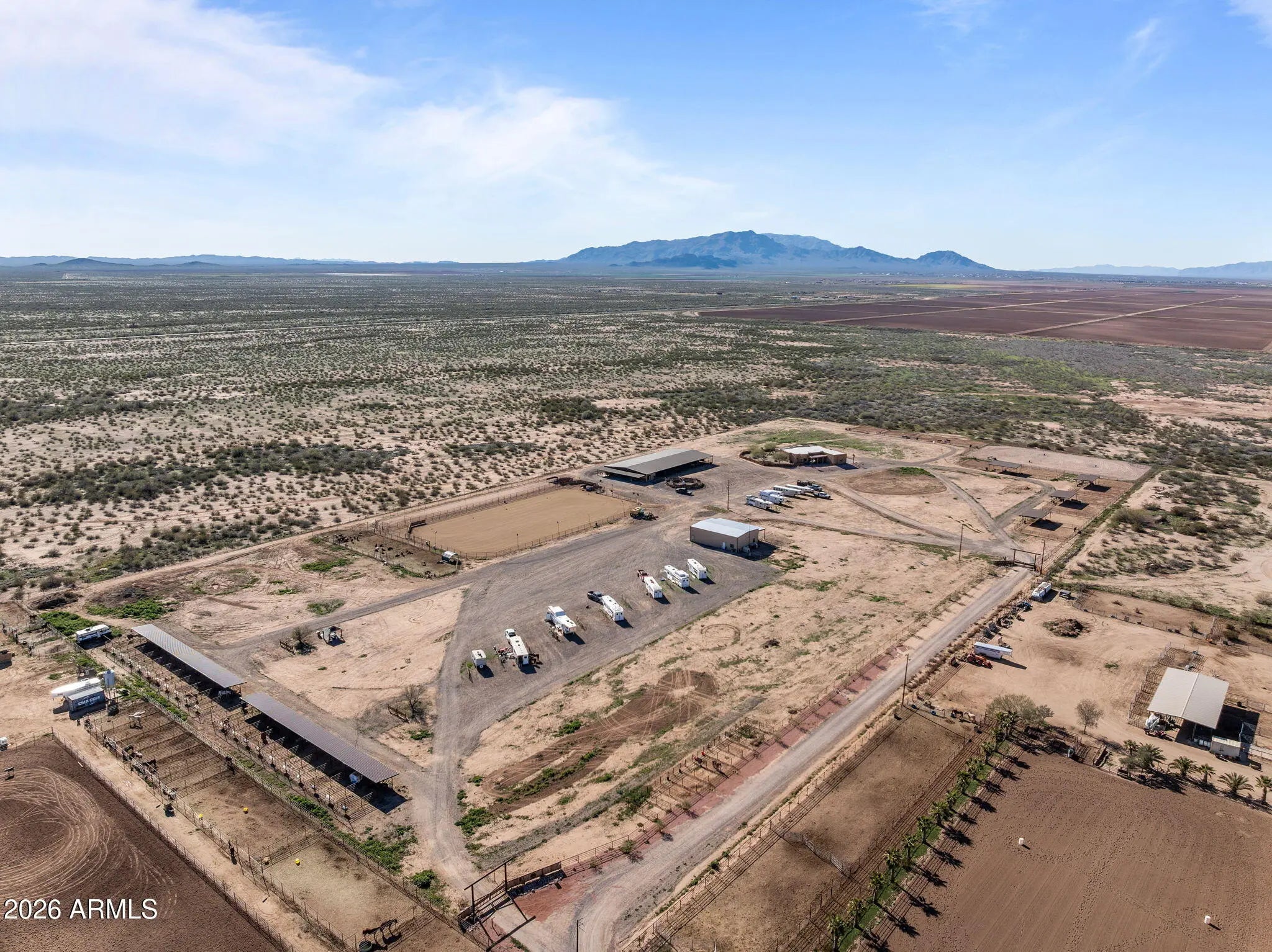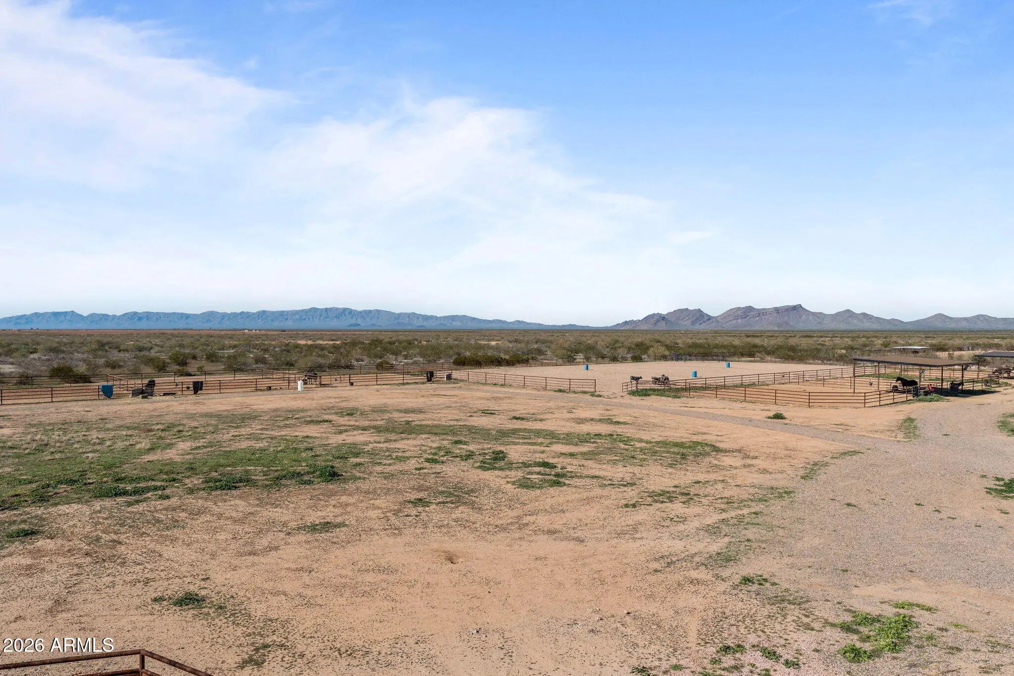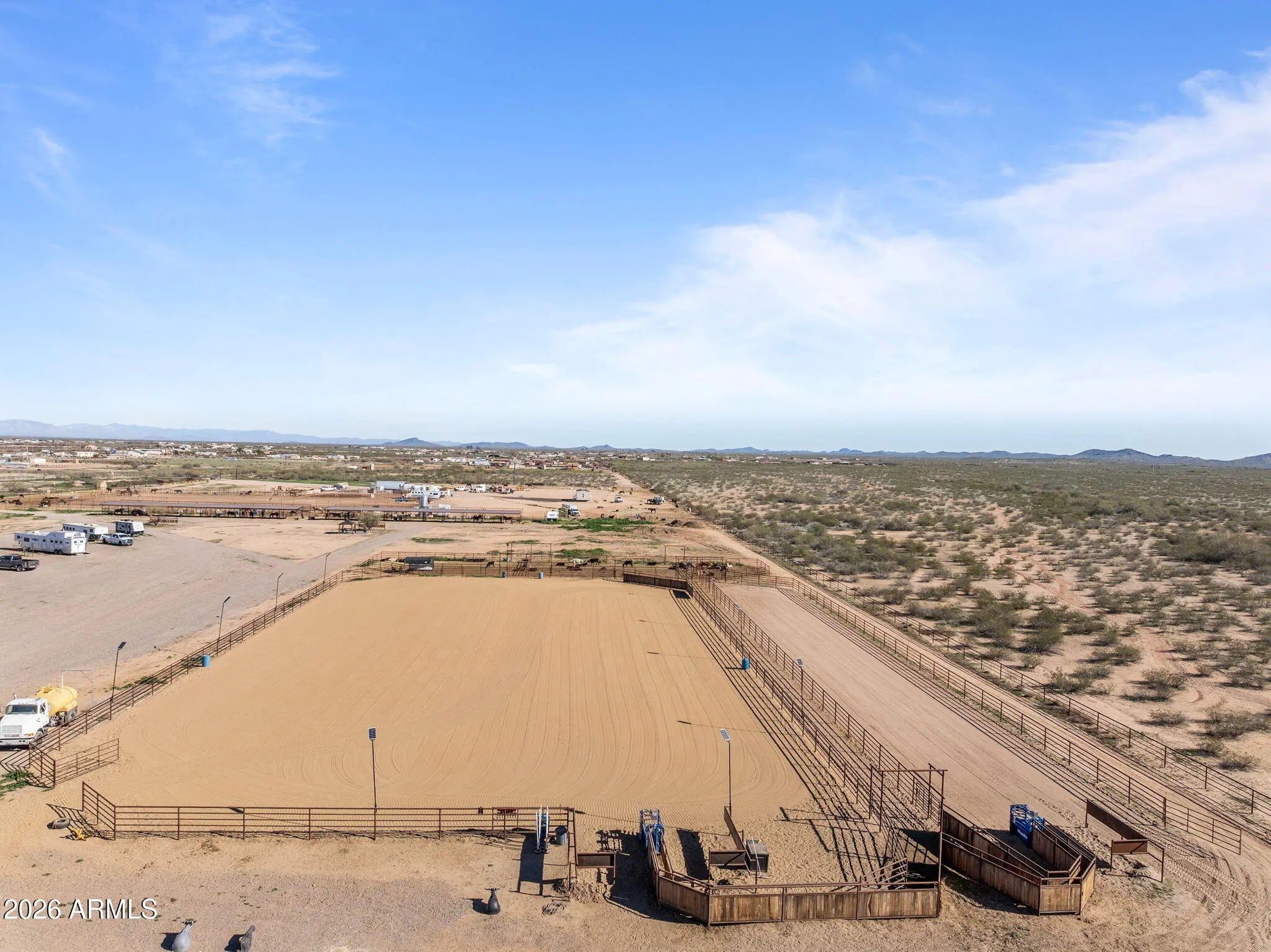This fully permitted equestrian estate offers an exceptional setup designed for functionality, privacy, and serious horse use. Featuring two separate gated entryways with attractive landscaping, direct access to Arizona Trust land, & thoughtfully designed improvements throughout the property includes 3 arenas for team roping, breakaway &barrel racing each with hauled-in sand & a lighted arena equipped with remote-controlled solar lighting. Enhancements include 2 Priefert roping chutes hot walker & 3 steer pens with automatic waters. The horse facilities are extensive, featuring (8) 60 x 40 covered pens and (4) 60 x 40 additional uncovered pens with solar lighting, automatic waters & feeders a large barn (approx. 14,000 sq ft) with (10) 15' x 30' stalls, 2 tack rooms (1 with a bathroom) large covered hangar-style structure providing ample shaded space for saddling. Additional improvements include (20) 12' x 20' covered pens & (10) 10 by 10 uncovered pens, for a total of 54 pens & stalls across the property. Additional amenities include a 2,400 square foot shop with a 1000 sq ft hay storage located on the west side of the shop, private well with approximately 3,000 gallons of storage & 400-amp electrical service (200 + 200). The shop features approximately 800 square feet of guest quarters complete with a bedroom, bathroom, walk-in closet, laundry room, pantry, all-electric kitchen, and extra insulation. RV accommodations include 10 50-amp and 1 30 amp RV hookups, plus an additional 50-amp hookup at the house power panel, along with a designated BBQ area for guests. Mature orange, lemon, and lime trees.