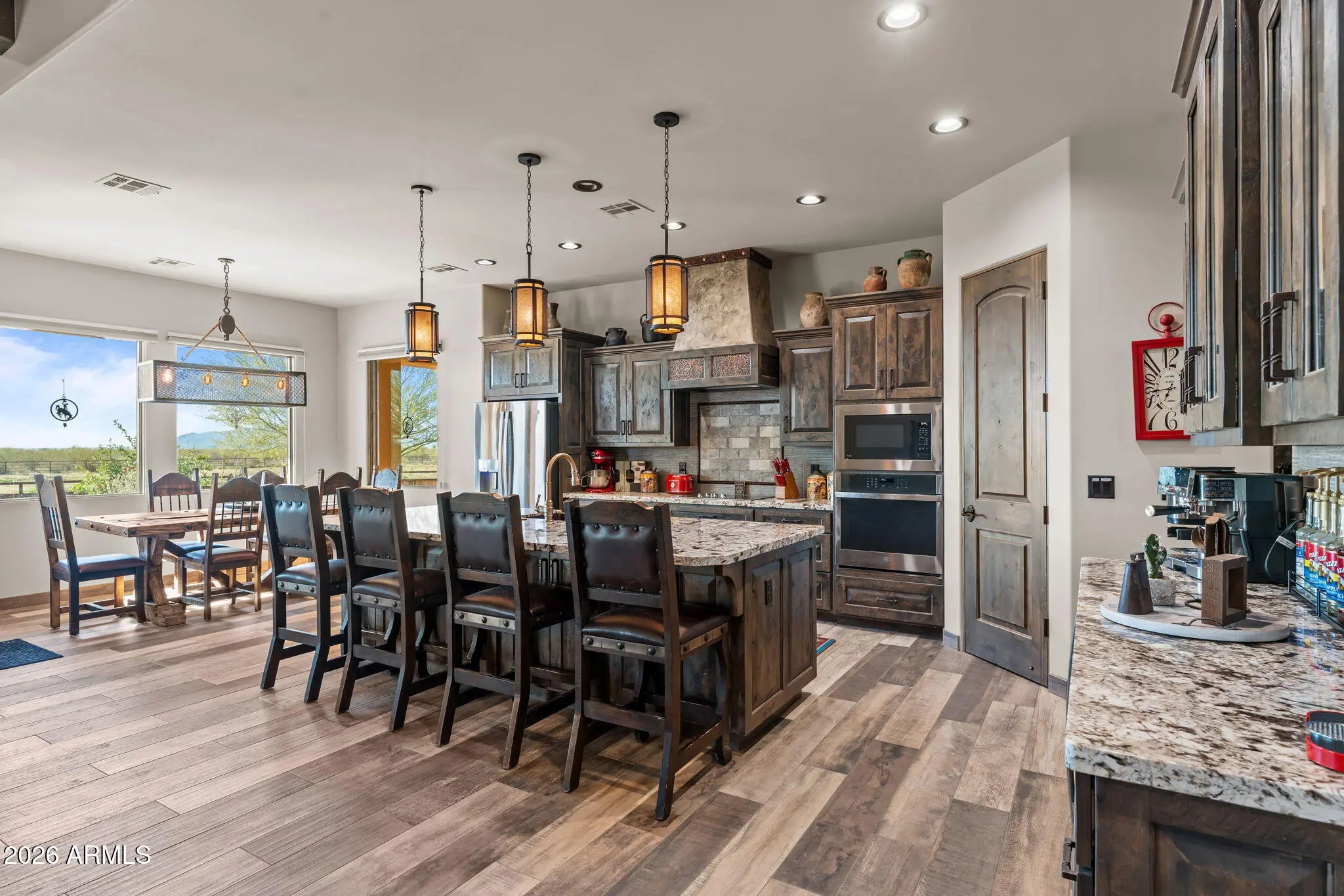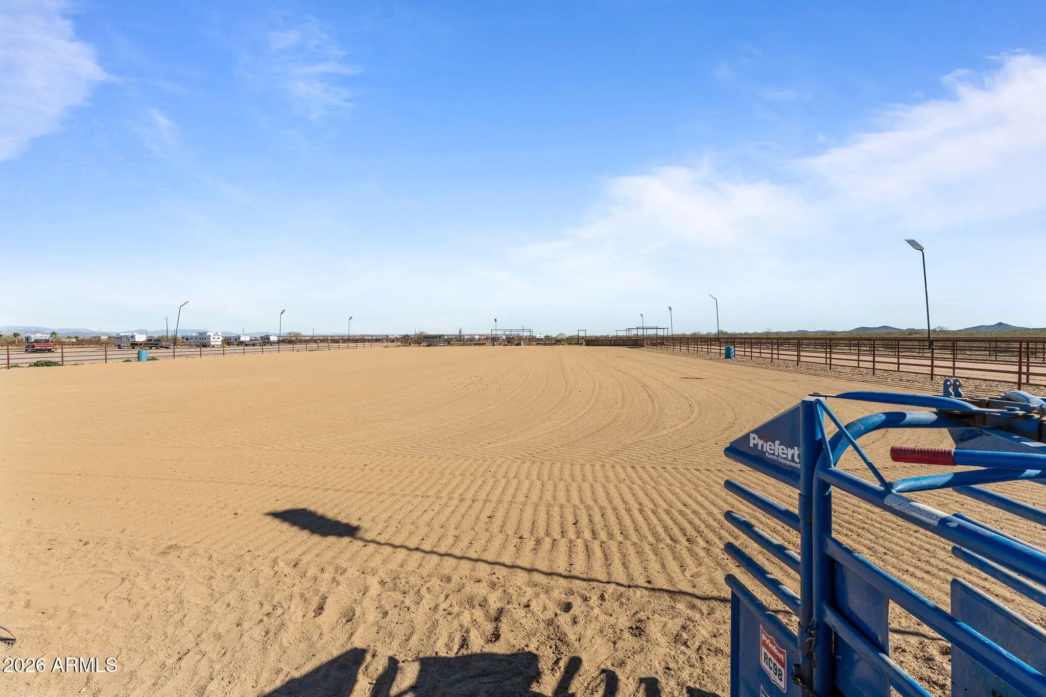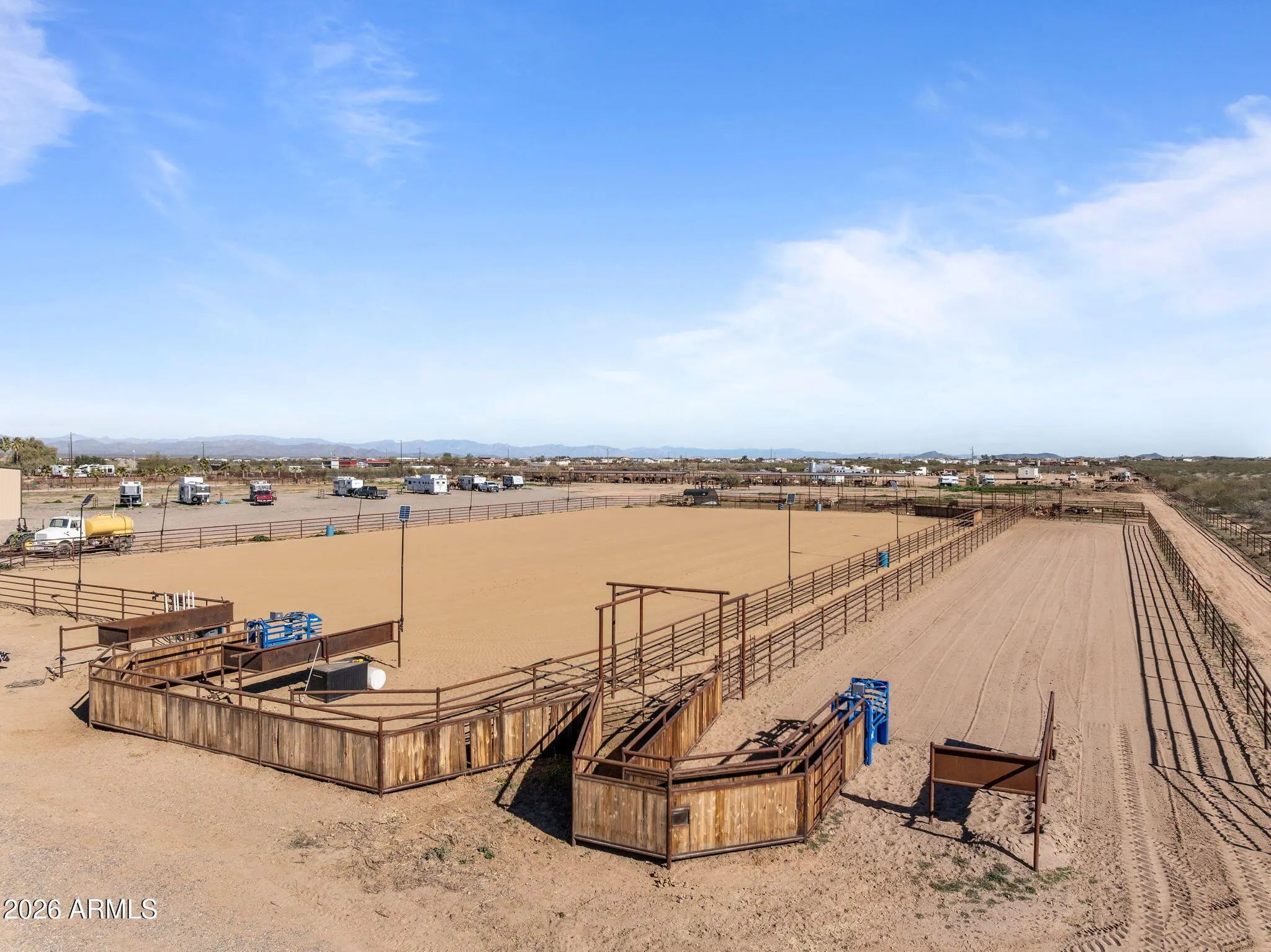 This fully permitted equestrian estate offers an exceptional setup designed for functionality, privacy, and serious horse use. Featuring two separate gated entryways with attractive landscaping, direct access to Arizona Trust land, & thoughtfully designed improvements throughout the property includes 3 arenas for team roping, breakaway &barrel racing each with hauled-in sand & a lighted arena equipped with remote-controlled solar lighting. Enhancements include 2 Priefert roping chutes hot walker & 3 steer pens with automatic waters. The horse facilities are extensive, featuring (8) 60 x 40 covered pens and (4) 60 x 40 additional uncovered pens with solar lighting, automatic waters & feeders a large barn (approx. 14,000 sq ft) with (10) 15' x 30' stalls, 2 tack rooms (1 with a bathroom) large covered hangar-style structure providing ample shaded space for saddling. Additional improvements include (20) 12' x 20' covered pens & (10) 10 by 10 uncovered pens, for a total of 54 pens & stalls across the property. Additional amenities include a 2,400 square foot shop with a 1000 sq ft hay storage located on the west side of the shop, private well with approximately 3,000 gallons of storage & 400-amp electrical service (200 + 200). The shop features approximately 800 square feet of guest quarters complete with a bedroom, bathroom, walk-in closet, laundry room, pantry, all-electric kitchen, and extra insulation. RV accommodations include 10 50-amp and 1 30 amp RV hookups, plus an additional 50-amp hookup at the house power panel, along with a designated BBQ area for guests. Mature orange, lemon, and lime trees.