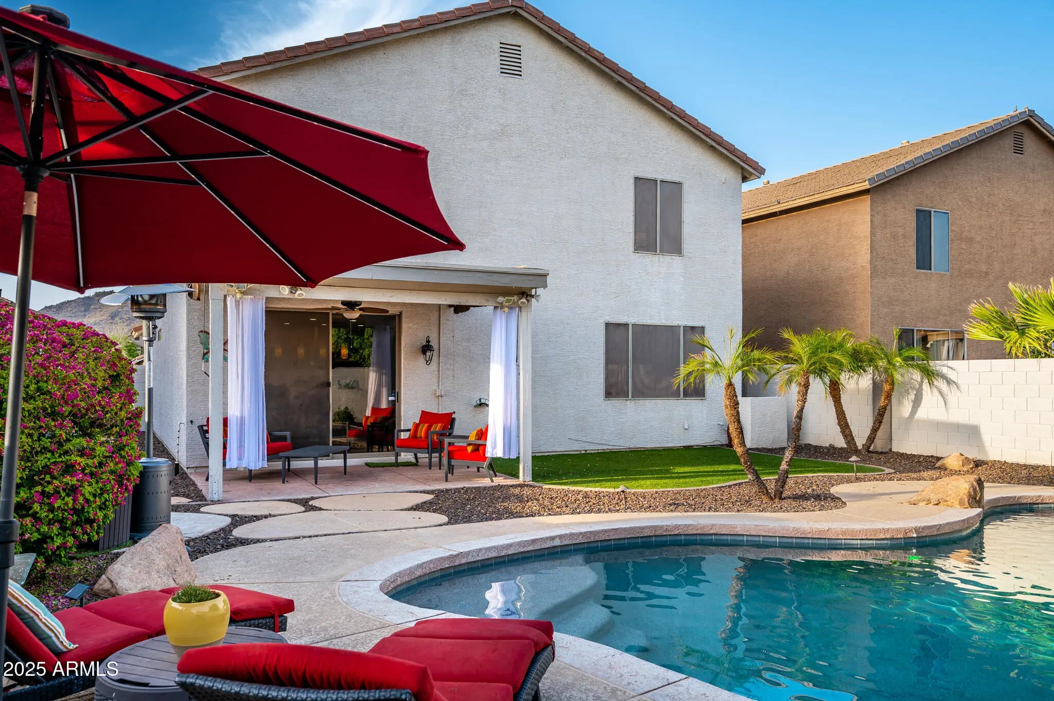 This beautifully remodeled home showcases thoughtful upgrades and sleek, modern finishes throughout. The chef's kitchen features contemporary cabinetry with soft-close hinges, quartz countertops, stainless steel appliances, a gas cooktop, beverage center, and elegant pendant lighting. Additional highlights include upgraded porcelain tile flooring, vaulted ceilings, custom designer lighting, and a striking newly redesigned staircase. Step outside to an entertainer's dream backyard, complete with pristine landscaping, a Pebble-Tec heated pool with automation and heater, tranquil waterfall feature, built-in gas BBQ center, and an extended patio ideal for outdoor gatherings. Currently operating as a successful furnished rental. This property offers excellent income potential.