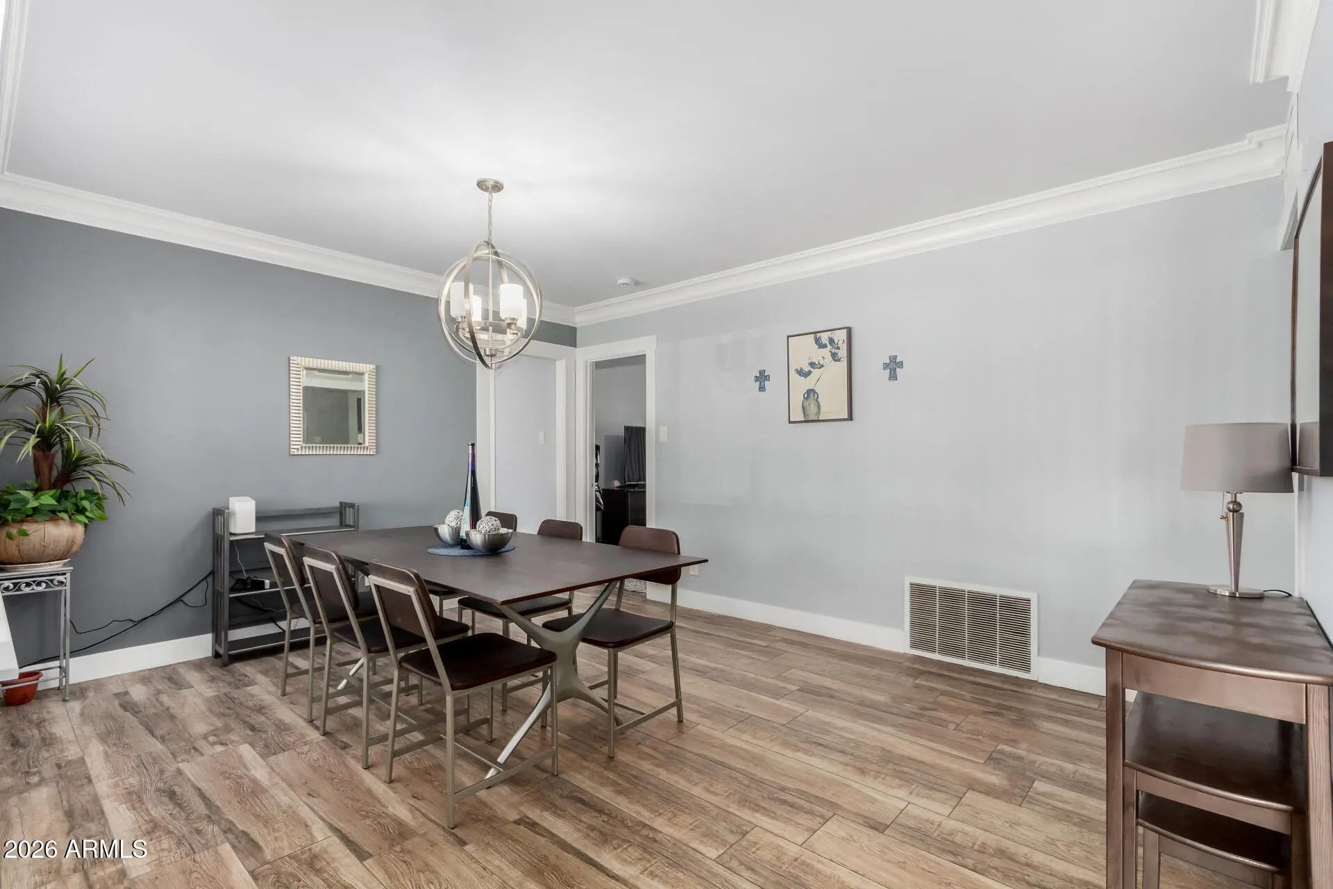 Tucked into the Campus Vista Historic District, this central Phoenix brick beauty blends vintage soul with modern charm—perfect for those who like their homes with character. A classic front porch and carport parking set the tone, but step inside and it gets better. Sun-filled interior features layered crown molding, a neutral palette, and wood-look plus designer tile flooring throughout. The fireplace anchors the oversized living room, while the formal dining room is made for dinner parties. Updated kitchen delivers with stainless steel appliances, quartz counters, white shaker cabinets and subway tile backsplash. A flexible den with French doors opens to the back and the primary suite offers two closets and a private bath. Thoughtfully updated and walkable to local coffee & dining. Sizable laundry room with enough room for storage. Check out the spacious backyard, offering a covered patio to relax or enjoy BBQ! There is also a separate 2-car garage that can be a workshop as well. With your creative ideas, you can make it a complete outdoor oasis. Don't miss this gem!