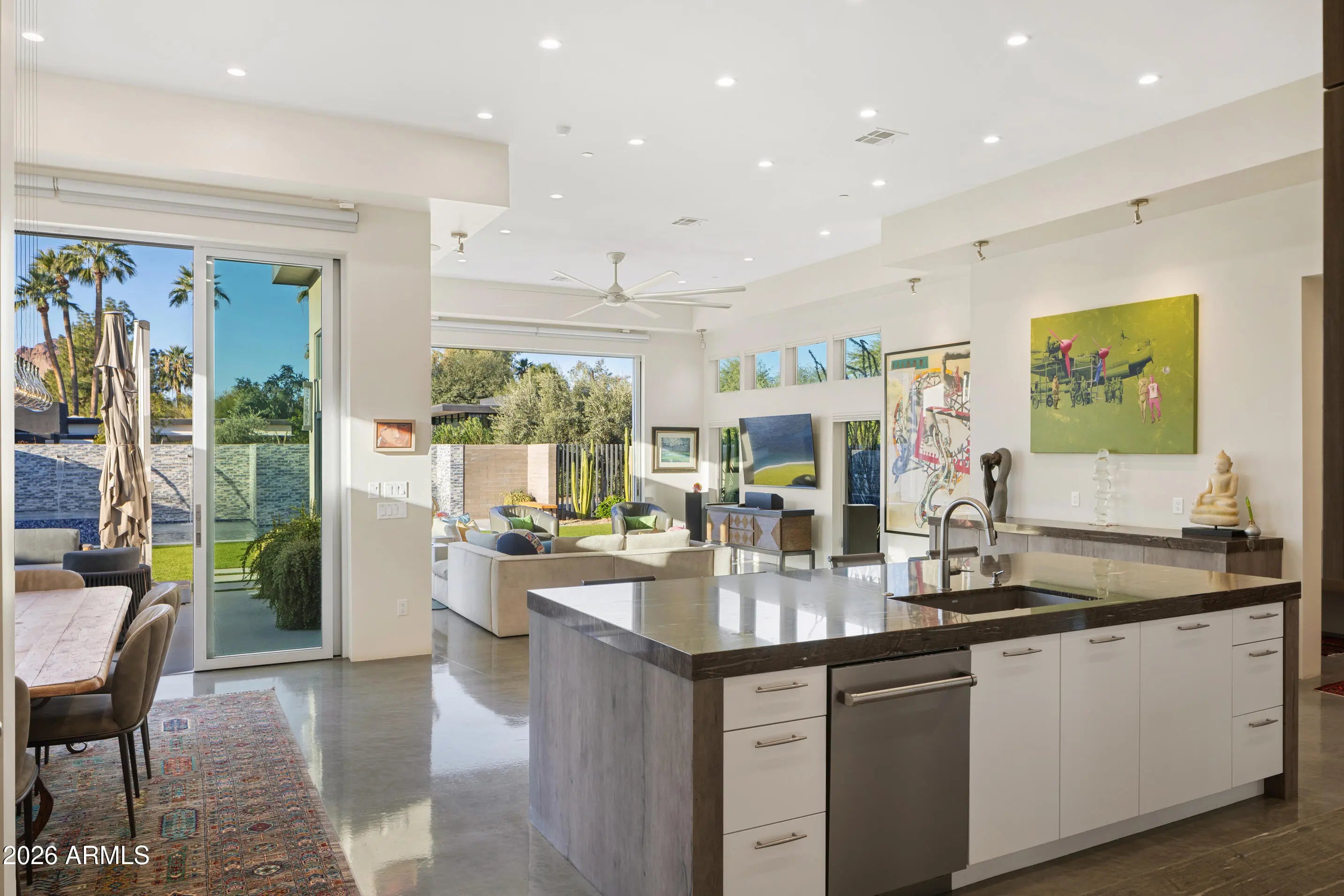 Completely reimagined in 2018, this meticulously updated Paradise Valley estate sits on a QUIET CUL-DE-SAC w/GATED entry on a unique lot capturing CAMELBACK MTN and MUMMY MTN VIEWS. Built to showcase both art and views, the 5,920sqft COMPOUND includes 5,062sqft main residence + REMOTE 1 bd/1.5ba GUEST HOUSE with full livingrm, kitchen, laundry, patio, and 2 garages—accessed by a LONG TREE-LINED DRIVE offering exceptional privacy. The main residence also includes an internal casita w/ private lounge and patio, ideal for 2nd primary, office, or gym. Large pocketing glass walls open to a modern pool + spa. Chef's kitchen, large wine room, manicured desert landscaping, solar w/Tesla battery backup, EV charging, Control4 lighting and AV, + air-conditioned main garage in a premier location.