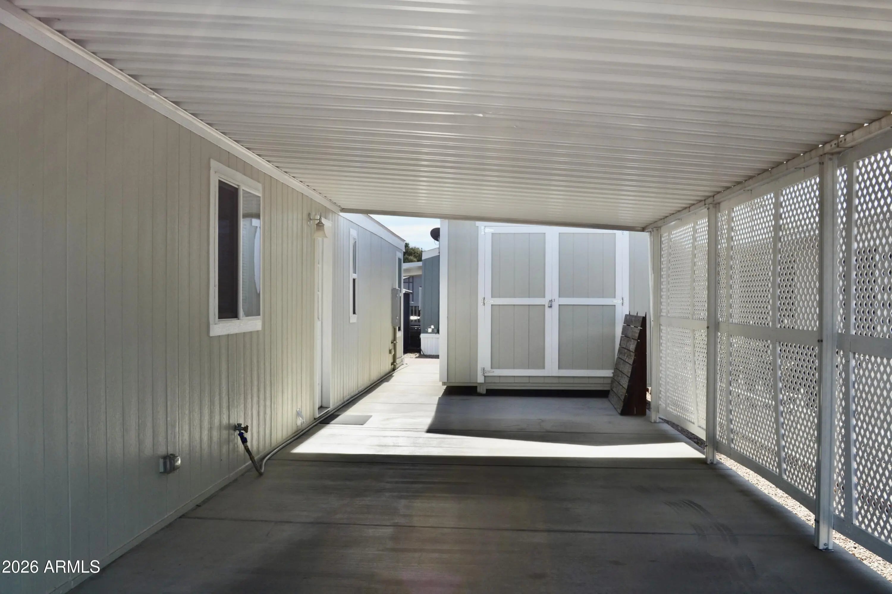 Built in 2017, this well-maintained move-in ready home features brand-new carpet and fresh interior and exterior paint. The open layout offers two spacious bedrooms, including a large primary that easily fits a king-sized furniture, plus a walk-in closet, walk-in shower, elevated toilet, and ample storage. Plentiful kitchen cabinets and counter space, soft-close drawers, and a fridge and dishwasher that are just four years old. A den with double doors adds flexibility. Ample storage. Ceiling fans throughout. Enjoy the 11.5x16 pavered patio and storm-resistant freshly painted sheds, including a 10'x20' with electricity, lighting, 220 outlet, insulation, and ramp access—perfect for a golf cart, bikes, or hobby area—plus an 8'x12' storage shed. Large, deep carport. Community features... ... include gated entrance, a heated pool and spa (completely refurbished a couple of years ago), fitness center with newer equipment, small library, large reservable clubhouse, dog park, RV/boat storage (small fee), and additional parking. Enjoy the public golf course just 10 minutes away!