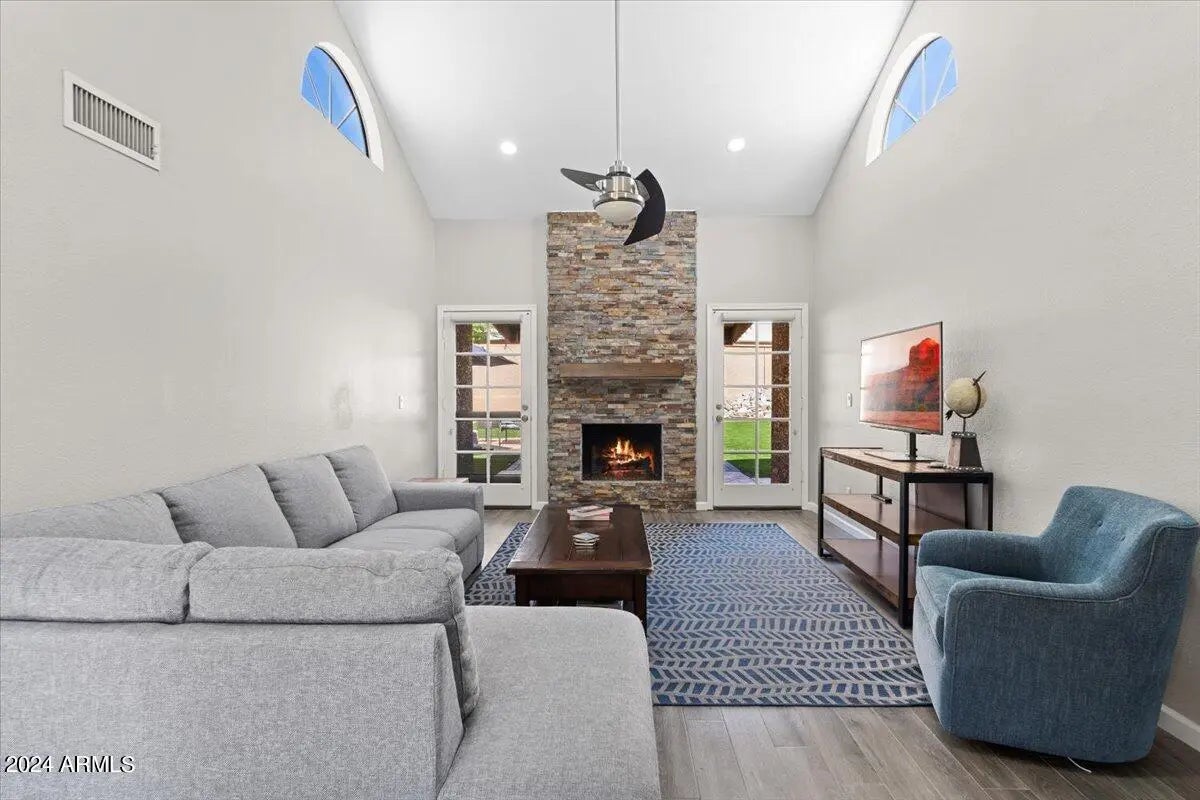 Welcome to 9058 E Gelding Drive, a beautifully upgraded single-level townhome in the desirable Scottsdale Vista North community--offering effortless living, scenic McDowell Mountain views, and an exceptional North Scottsdale location. Ideal as a full-time residence or seasonal retreat, this home delivers the true lock-and-leave lifestyle today's buyers are seeking. Vaulted ceilings and abundant natural light create an open, inviting atmosphere, complemented by updated flooring, designer paint tones, and a charming wood-burning fireplace anchoring the living space. The eat-in kitchen is both functional and stylish, featuring granite countertops, stainless steel appliances, recessed lighting, tile backsplash, and generous cabinetry--perfect for everyday living or casual entertaining. The spacious primary suite offers a peaceful retreat with private patio access, dual mirrored closets, and a well-appointed ensuite bath. Outdoors, the low-maintenance backyard and covered patio provide a comfortable space to relax and unwind while enjoying Arizona's beautiful weather. Additional highlights include a new roof installed in 2020, a two-car garage with built-in storage, and attractive grassy front landscaping. The location is truly unbeatable just minutes from Kierland Commons and Scottsdale Quarter, offering premier shopping, dining, and entertainment. Enjoy close proximity to world-class events such as the Barrett-Jackson Scottsdale Auction and the Waste Management Phoenix Open, along with easy access to freeways, outdoor recreation, and all that North Scottsdale has to offer. A rare opportunity for low-maintenance living, mountain views, and community. This is a real gem. New AC in 2022.