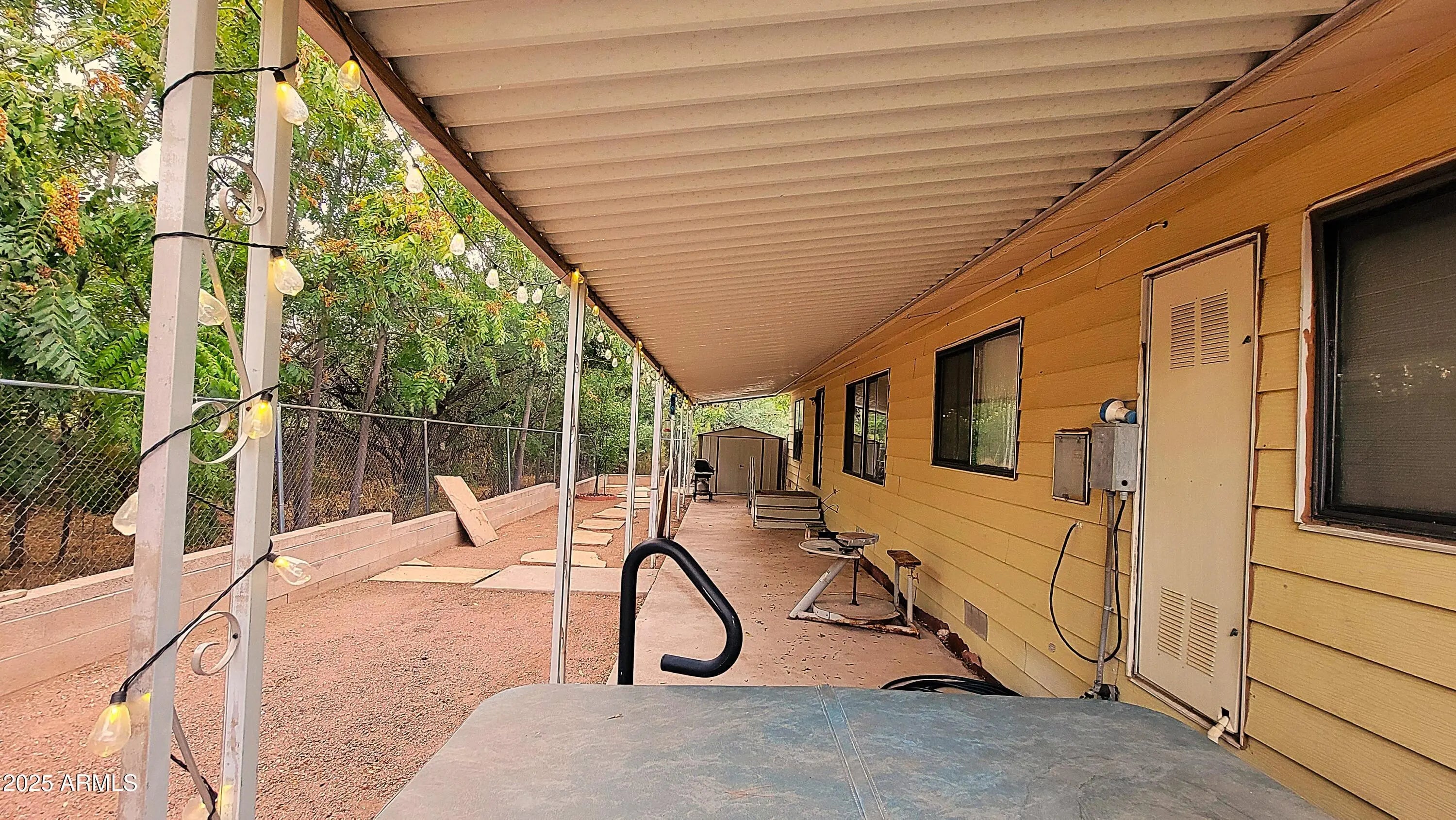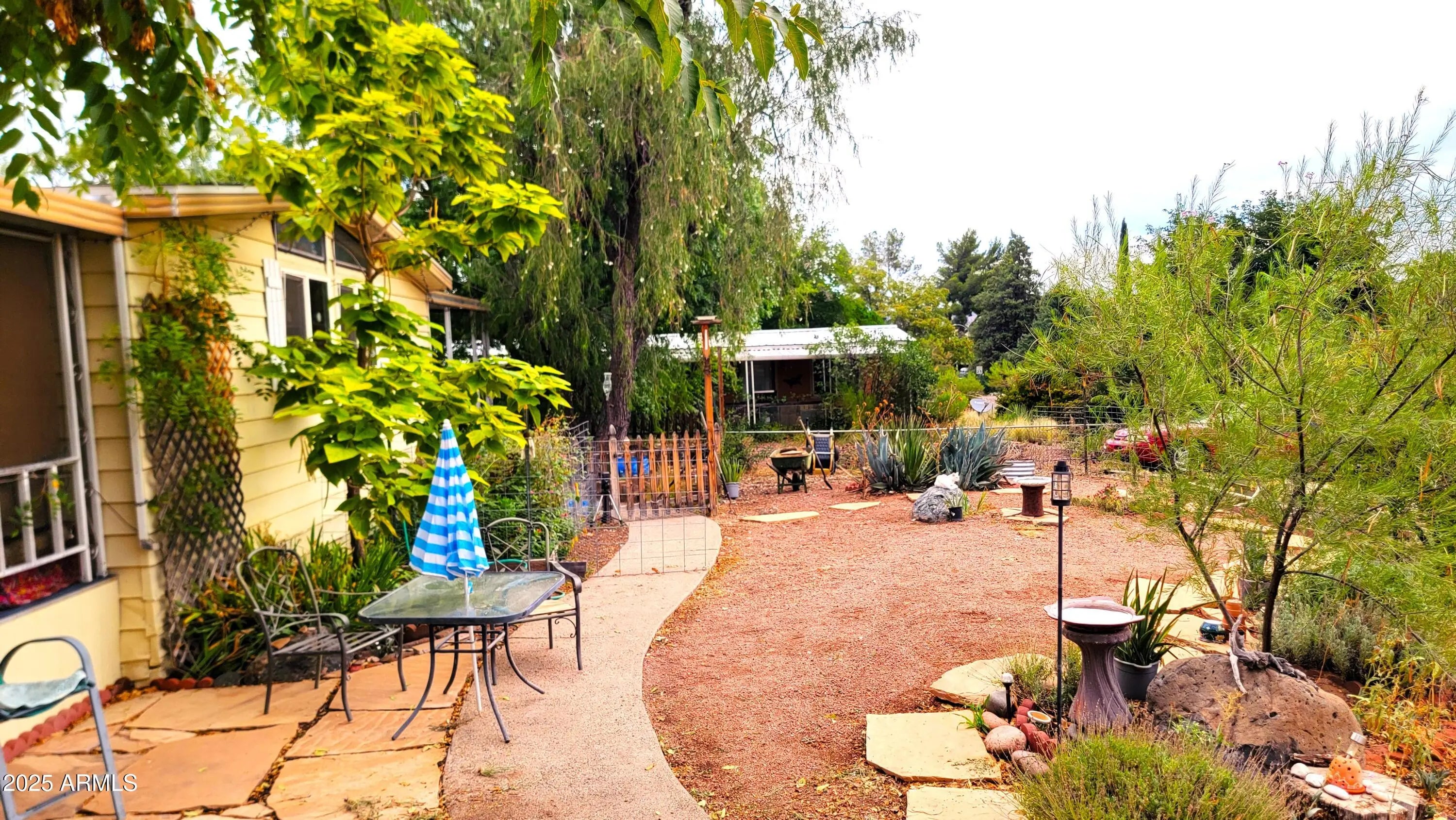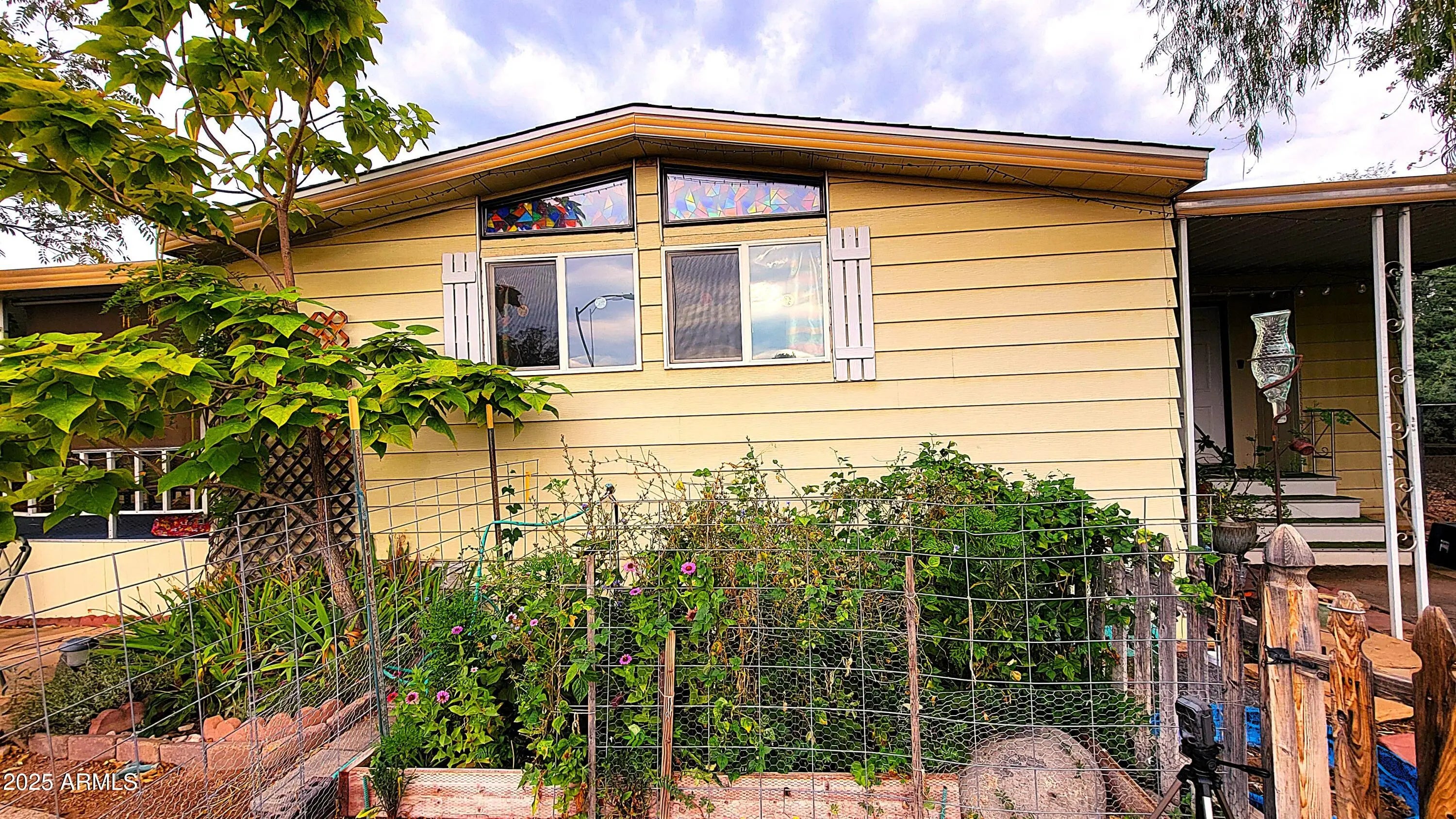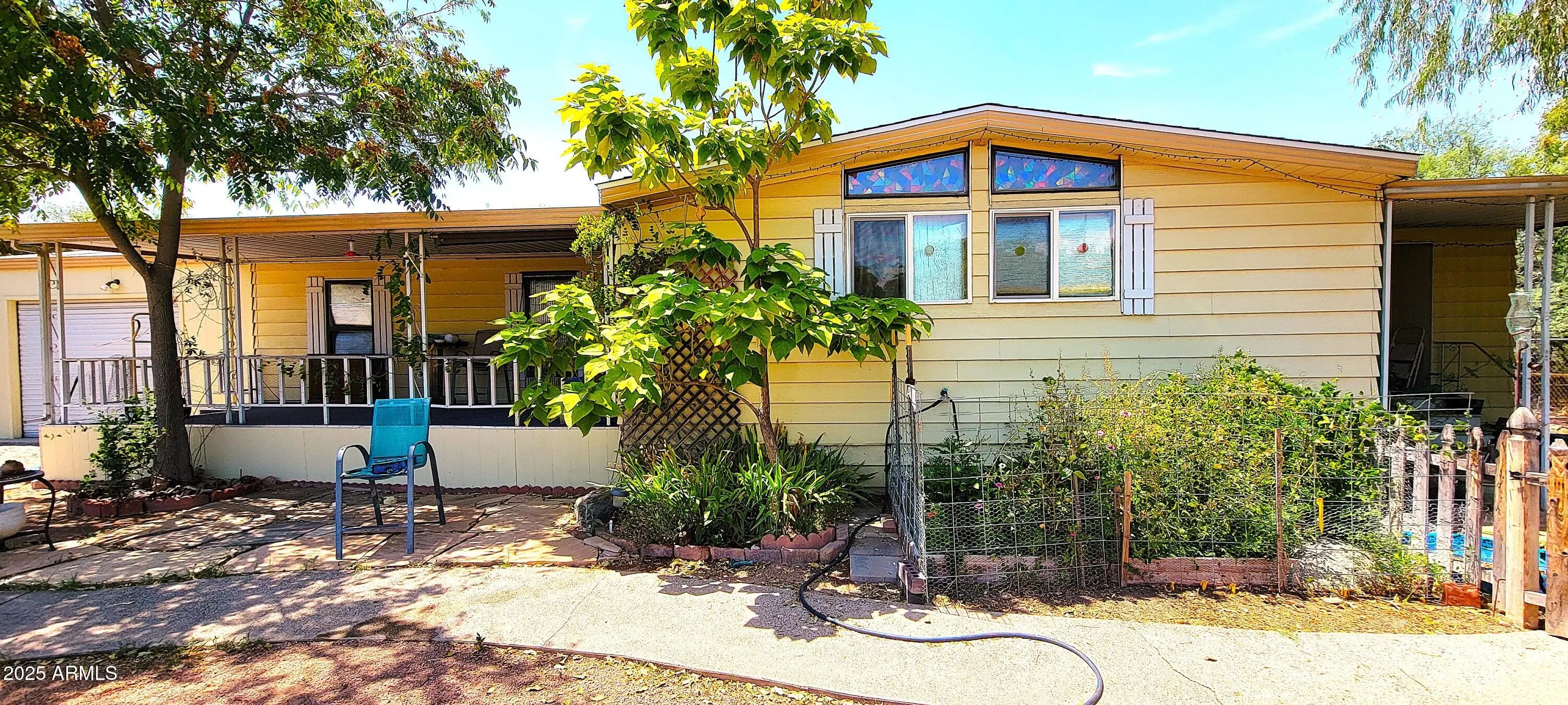 Beautiful, roomy triple wide manu home at end of cul-de-sac. Tall, vaulted ceilings make this home very expansive inside. New roof in 2025, & many new upgrades (see supplement), new Pex water lines throughout the home. Both bathroom flooring is new, & sinks & vanities. Poss. to make 3rd bedroom in dining. This home is made for entertaining, as the large covered patio in the front with mountain views & lush landscaping in spring the summer. The rear covered patio is private & welcoming for friends to gather & enjoy get-togethers. 2 large sheds are included & the garage has soaring ceilings. The garden areas are home to lots of birds, butterflies & other wildlife. The side yard has lots of room to park your boat or RV. NO HOA. ON CITY SEWER & CITY WATER, natural gas.