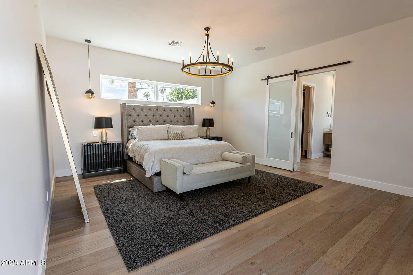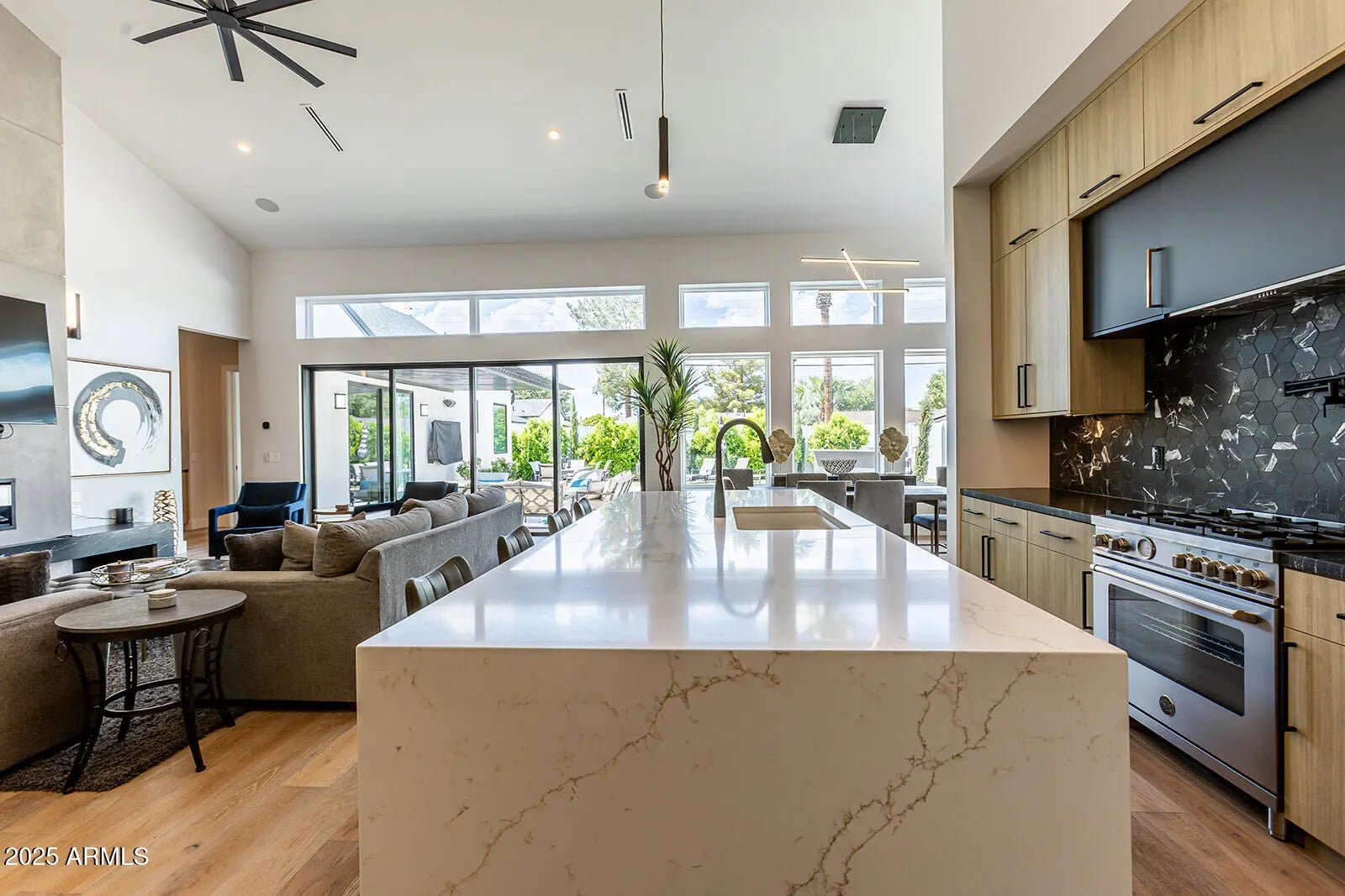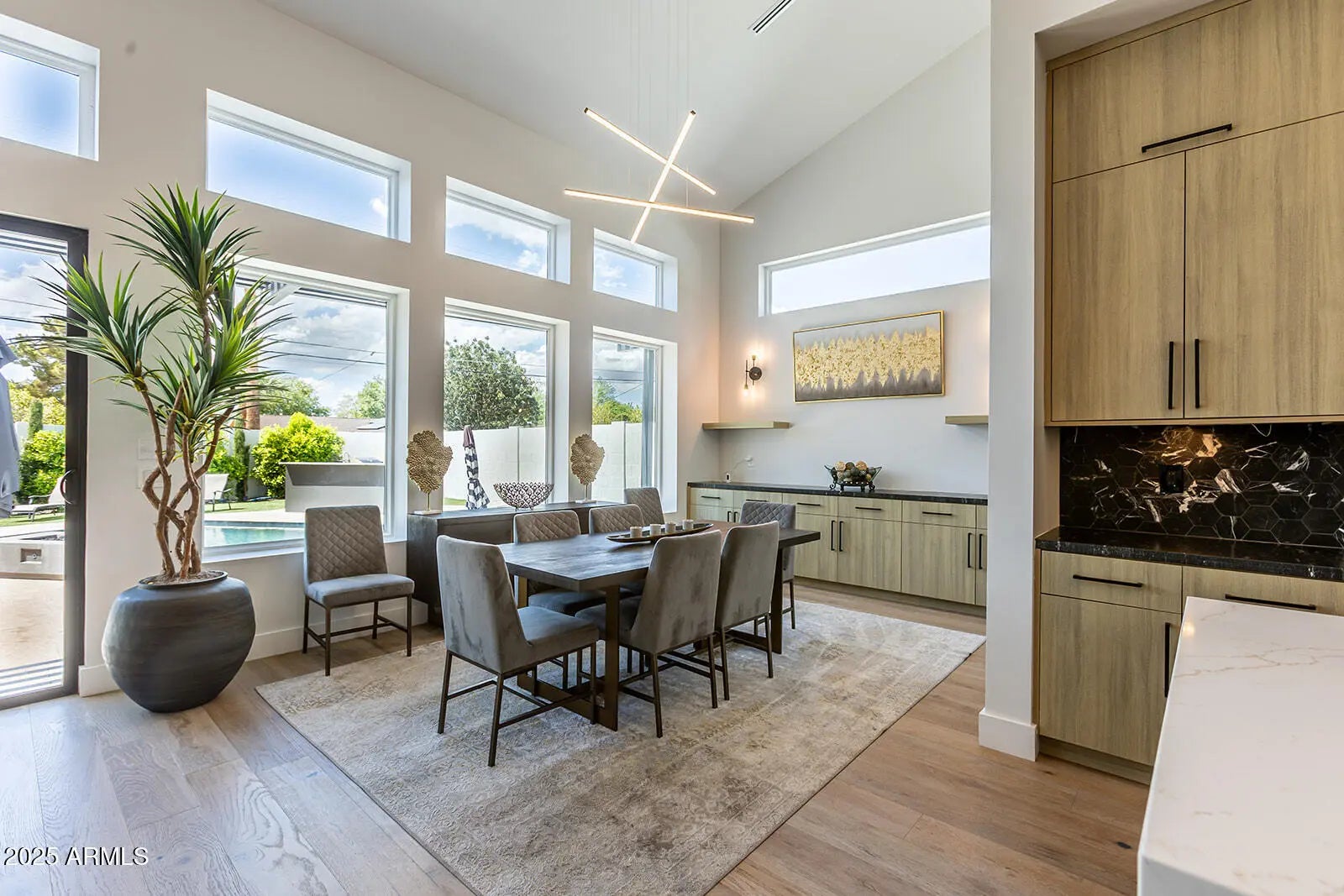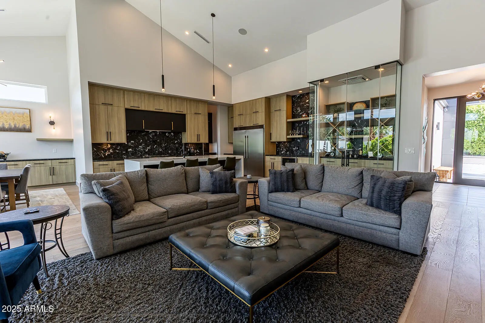 This stunning 2022 Arcadia Osborn modern home offers an open concept layout w 5 bed 4.5 bath. Upon entry, you're welcomed by soaring vaulted ceilings & rich wood flooring that flow t/o the great room, complete w a striking fireplace feature wall that seamlessly connects to the dining area & chef's kitchen. The kitchen boasts custom oak cabinetry, high-end appliance, a spacious butler's prep area, walk -in pantry & a glass-enclosed wine room-perfect for both entertaining & family living. The split floor plan provides privacy & comfort. Primary suite features a private entrance to the backyard, dual-sink vanity, oversized walk-in shower, freestanding soaking tub. Amazing indoor-outdoor living w sliders that open to resort style backyard showcasing pool, built in BBQ, firepit & turf lawn.
