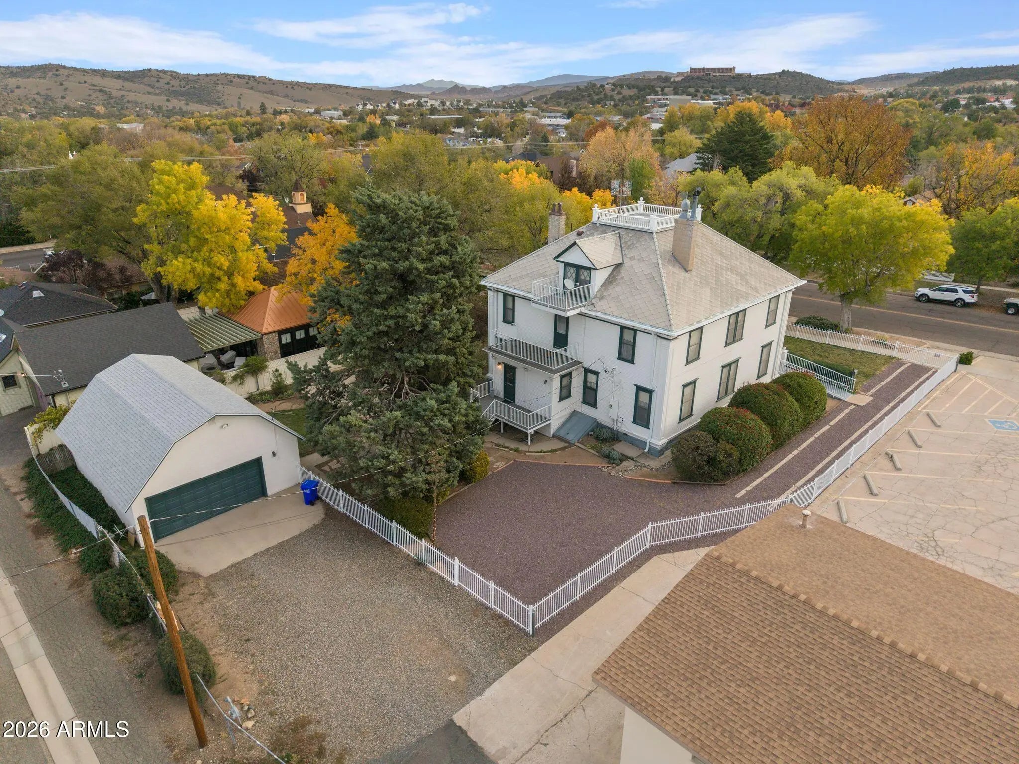 A Landmark 1901 Georgian Revival Estate. Rich in history and architectural distinction, this exceptional 1901 Georgian Revival residence was built by Richard E. Sloan, Arizona's last Territorial Governor. Serving until Arizona achieved statehood, Governor Sloan's legacy is woven directly into this remarkable home—an enduring cornerstone of Prescott and Arizona history. Set on two downtown lots totaling over one-third of an acre, just minutes from Prescott's iconic Courthouse Plaza, the property offers rare scale, privacy, and presence within the Historic District. Spanning 4,137+ square feet, the residence includes multiple bedrooms and 3.5 baths, thoughtfully arranged across multiple levels, and is complemented by an oversized detached 2+ car garage, originally constructed as the home's carriage house. The architecture is unmistakably Georgian Revival. A classic hipped roof with decorative balustrade surrounding a central roof deck, two-story pilasters, classically detailed eaves, and three original fireplaces establish symmetry and stately proportion. Inside, original hardwood floors, millwork, and wall treatments reflect the craftsmanship of the era. A grand dual staircase, illuminated by a custom stained-glass window, anchors the welcoming foyer. The main level offers a formal parlor, expansive entertaining room, and gracious gathering spacesrooms once host to notable social events and Territorial-era meetings. Authentic period functionality remains intact, including servants' quarters with a private stairway to the kitchen, a rare and highly prized historic detail. The upper levels continue the story. The second floor hosts multiple bedrooms and baths, while the third-floor livable attic, originally designed as a children's playroom, features reinforced beams and flooring intended to support early gymnasium equipment and even dancingan uncommon and delightful detail of the time. Respectfully maintained with modest updates that honor its heritage, this legacy estate stands as a beautifully preserved example of Early Colonial American architecture and Georgian Revival elegance. Homes of this caliberoffering architectural integrity, historical significance, and a premier downtown settingare rarely available. A rare opportunity to own an irreplaceable piece of Prescott's and Arizona's historynow thoughtfully repositioned for today's discerning buyer.