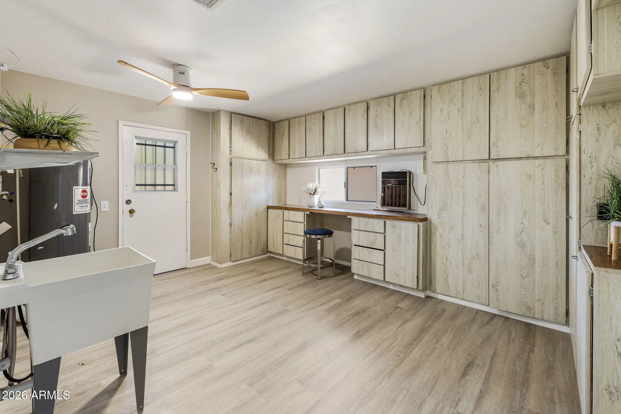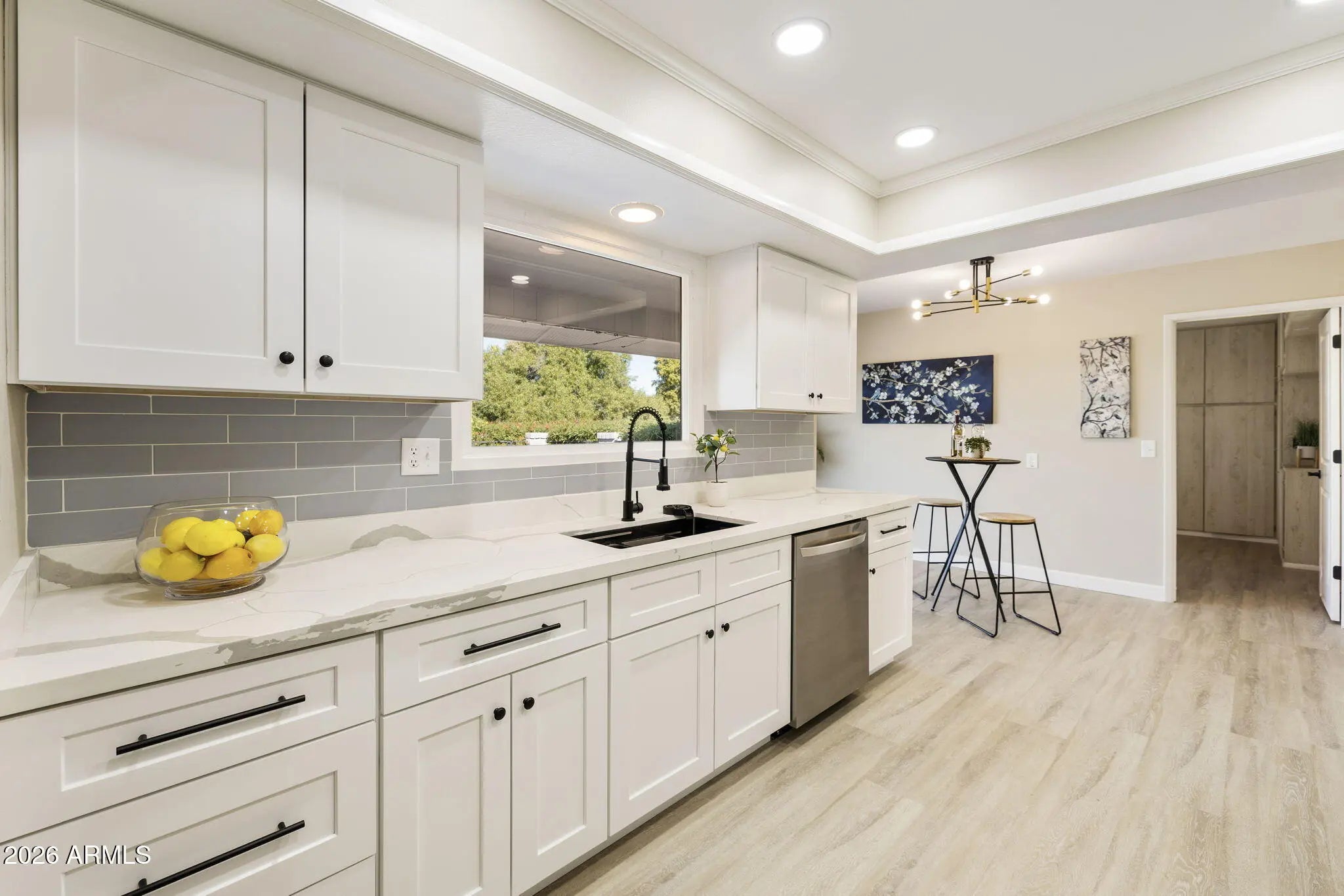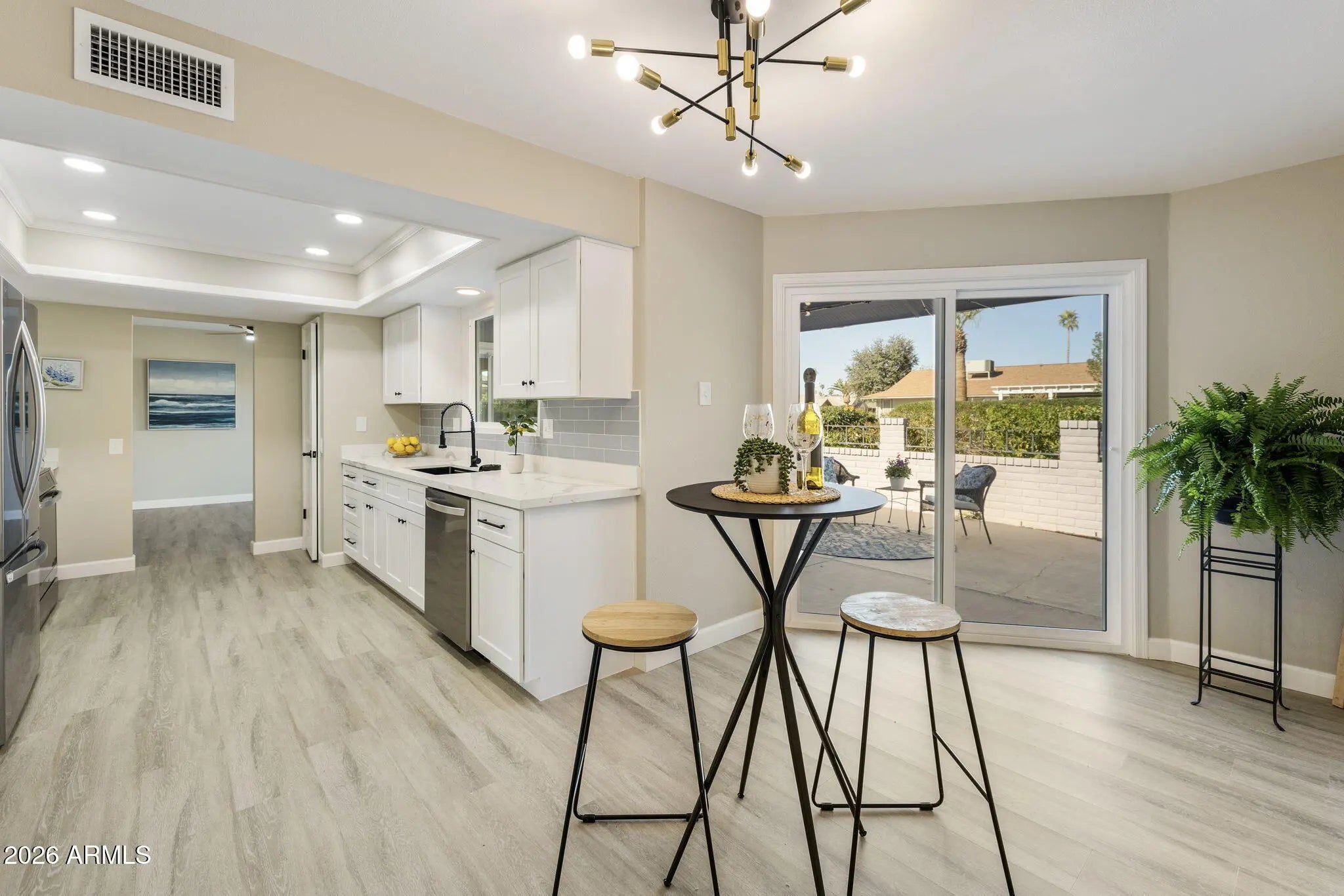Open the door to 2026! This home is a masterfully transformed brand-new living experience. From fresh Accessible Beige paint to seamless LVP flooring and premium carpet, every inch reflects a total commitment to quality. The gorgeous kitchen features all-new white shaker cabinetry (soft-close), Quartz countertops, and a full-height pretty backsplash. NEW induction/convection range/oven and a professional ''workstation sink'' with a view of the back yard. Enjoy two separate living spaces, formal dining if you choose and a breakfast nook overlooking the private walled patio—a sanctuary for hummingbirds. No surface untouched: This renovation features all-new energy-efficient windows and new sliding glass doors, 4'' baseboards, and elegant window frames. The primary retreat is a spa experience with a frameless glass shower door, new vanities, mirrors, medicine cabinets, and premium spa-grade shower heads. Rare Lifestyle Extras: Discover the oversized Multi-Purpose Utility Rooma fully climate-controlled suite with a built-in office desk, integrated bench seating, and convenient cabinetry storage. The detail extends to the showroom-ready epoxy garage floor and driveway. Positioned on a large corner lot on a quiet street, this isn't just a remodel,it's the new gold standard for 55+ luxury.