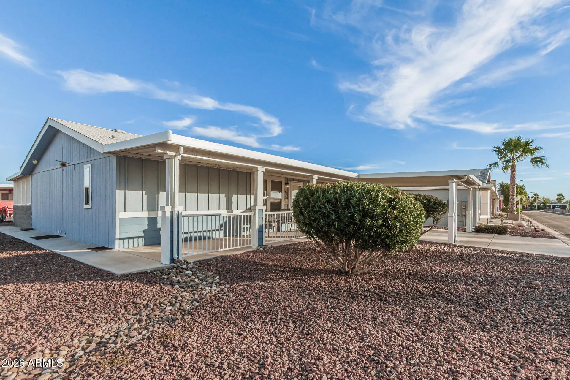 Welcome to this beautifully maintained, fully furnished blue-and-white CAVCO home designed for comfort, style, and easy living. A covered carport welcomes you home, while French doors open to a spacious patio featuring sunshades and a durable aluminum roof—perfect for relaxing or entertaining year-round. Inside, vaulted ceilings and abundant windows fill the home with natural light. The open living space is complemented by ceiling fans, central air, and tasteful finishes throughout. The kitchen showcases classic shaker-style cabinets, a pantry for added storage, and flows seamlessly into the main living areas. The primary suite offers a generous walk-in closet and a well-appointed bathroom with double sinks and a walk-in shower complete with a built-in bench for added accessibility. A dedicated laundry room includes a washer and dryer, both of which are included. Outside, the low-maintenance desert landscaping is accented with trees and bushes on a drip irrigation system. A custom storage sheddesigned to match the homefeatures a sink, shelving, and a workbench, making it ideal for hobbies or additional storage. For peace of mind, the home is equipped with a Honeywell security alarm system. This move-in-ready property combines thoughtful upgrades, functionality, and charm - an exceptional opportunity you won't want to miss! Lease fee includes water, sewer and garbage. A copy of the community's Rules and Regulations is available upon request. A required application for residency form is also available.