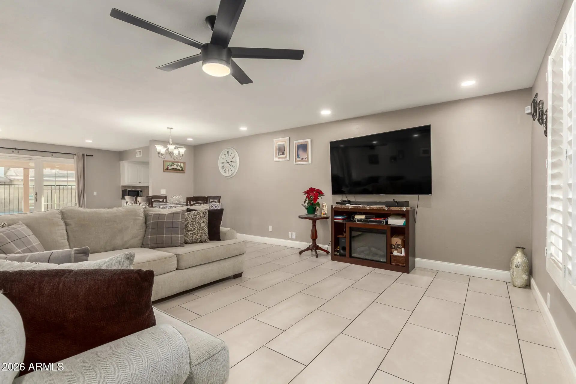 Fully paid-off solar panels at closing deliver immediate energy savings and long-term efficiency. Located in the established Northern Palms neighborhood, this well-maintained 4-bedroom, 2-bath home offers strong curb appeal, a low-maintenance front yard, and a 2-car garage. Inside, enjoy a spacious living and dining area with durable tile flooring, neutral tones, plantation shutters, and a classic beehive fireplace. The kitchen features granite countertops, stainless steel appliances, ample cabinetry, and a tile backsplash. The primary suite includes a private bath with dual sinks. The backyard is perfect for Arizona living with a covered patio and diving pool. Comfort, value, and smart energy efficiency in one exceptional home.