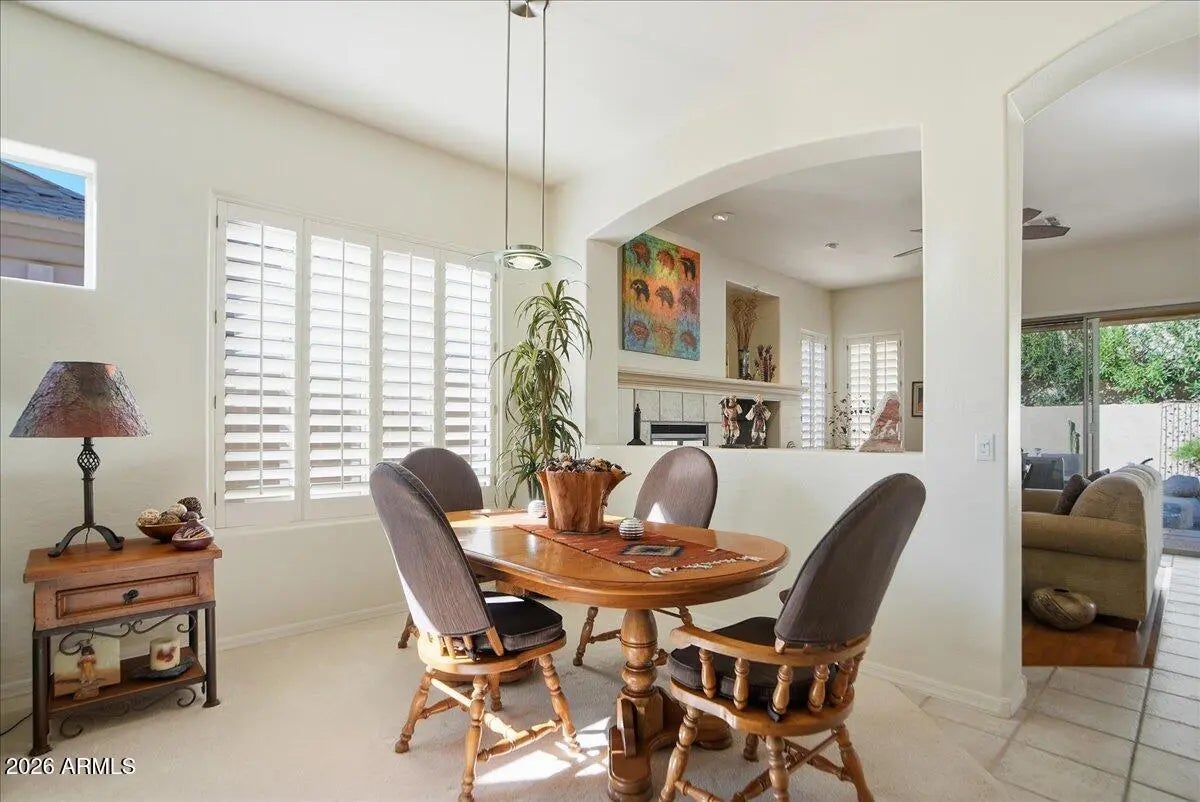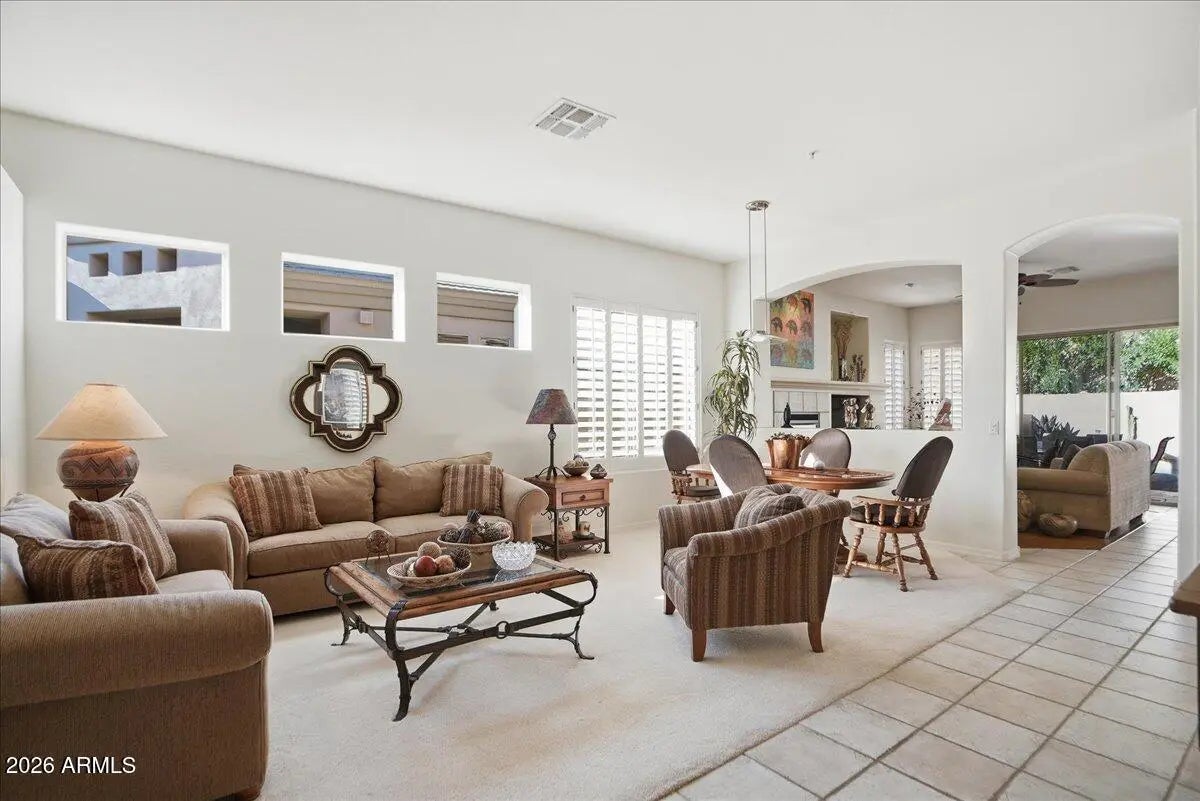 Eagle Mountain living at its best. Located inside the coveted guard gated community, this 3 bedroom single-level home offers a smart split-bedroom layout with two private bedroom suites, and an office/3rd bedroom, privacy, and year-round outdoor enjoyment with a heated pool and spa. The spacious great room opens to a covered patio and generous entertaining space, creating a true indoor/outdoor lifestyle. The kitchen features 42'' cabinetry, a center island with breakfast bar, and a casual dining nook overlooking the pool. Formal living and dining areas add flexibility for hosting or for reimagining as office/media space. The primary suite enjoys direct patio access, a large walk-in closet, and dual vanities. A second ensuite bedroom is ideal for guests or multi-generational living. Additional features include professionally designed closet systems in every bedroom by Classy Closets, plantation shutters on all windows, a gas fireplace, chiseled-edge tile in high-traffic areas, no interior steps, and a two-car garage with cabinetry, epoxy flooring, and potential golf-cart storage. Landscape irrigation has been updated. Situated within the security and serenity of Eagle Mountain, this home is just minutes to the clubhouse, hiking, shopping, and Scottsdale amenities. The private backyard, heated pool and spa, and low-maintenance layout make this residence an exceptional lock-and-leave for winter visitors, seasonal buyers, or anyone seeking effortless foothills living. Seller is also offering a transferable Home Warranty with the home.