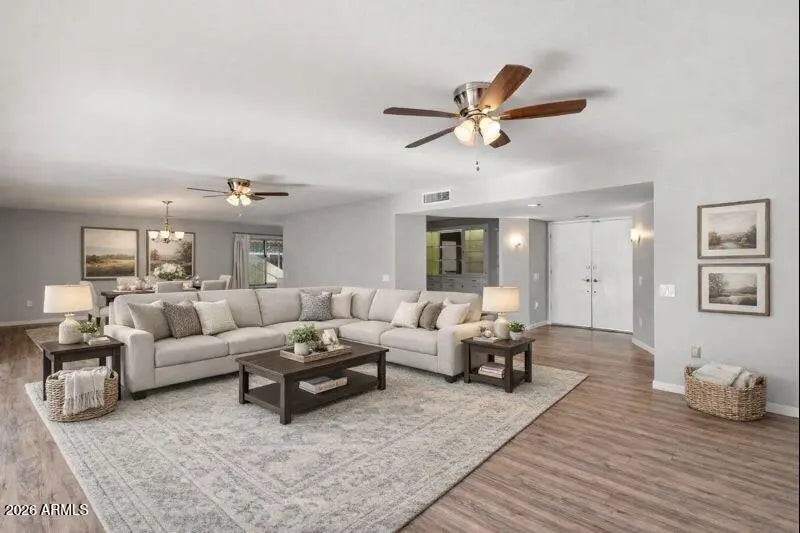 Welcome to Sun City Phase III and this expanded, updated Augusta floor plan located on a quiet interior circle street. The home offers exceptional privacy with a gated front courtyard, fully fenced backyard with a secure dog run, and an oversized Arizona room. The versatile layout is ideal for both entertaining and everyday living, feeling cozy yet spacious. Move-in ready with luxury laminate flooring throughout the main living areas and neutral tile in the kitchen and baths. The kitchen features slab granite countertops, stainless steel appliances with a wine cooler, white shaker cabinetry, modern hardware, and a subway tile backsplash. Both bathrooms are updated with white shaker vanities and granite tops, including a soaking tub in the guest bath and a walk-in shower in the... primary which also offers dual sinks and double walk-in closets. Roof Replaced: December 2025 Interior Paint Update: January 2026