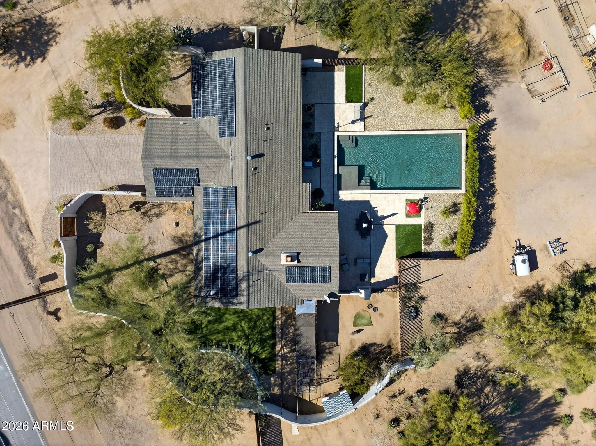 Experience refined desert living with breathtaking Black Mountain views on a fully usable, private lot. This 4 bedroom, 2 bath residence offers an elevated indoor-outdoor lifestyle featuring a resort-style pool, outdoor cooking space, and custom putting green. Inside, enjoy a thoughtfully updated kitchen and a serene primary suite with dual private water closets and spa-inspired finishes. Designed for equestrian living with a paver breezeway, 4 stall barn, automatic waterers, and a lighted 110x80 arena. A rare blend of luxury, space, and lifestyle.