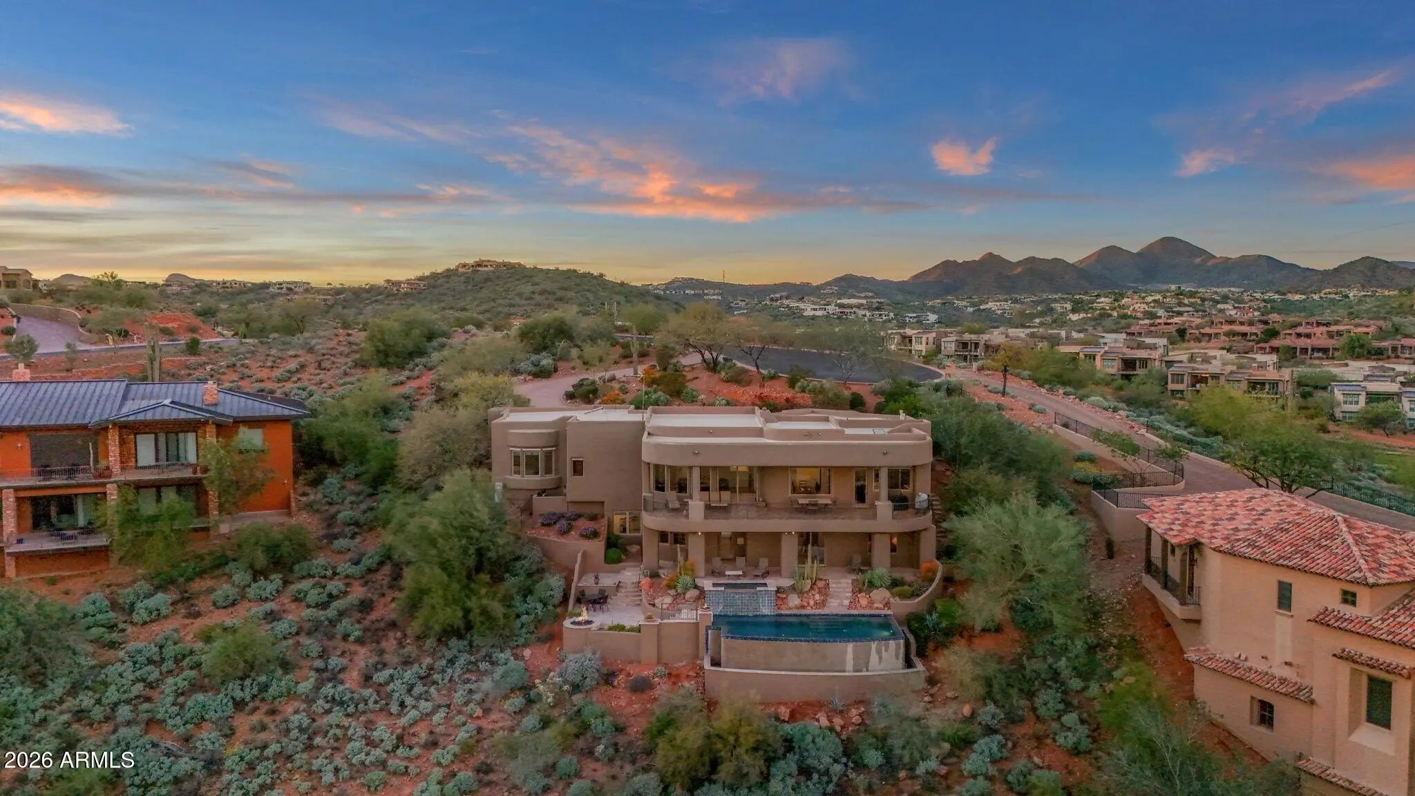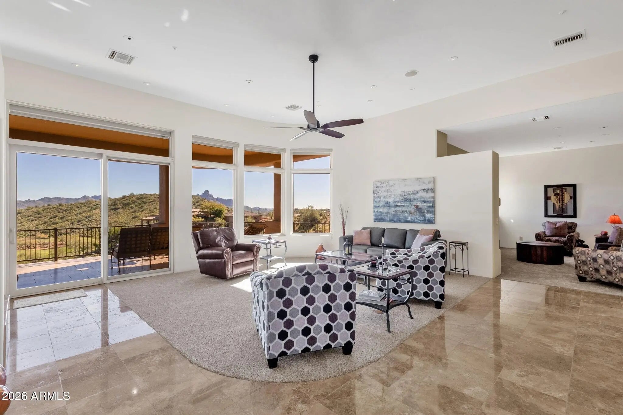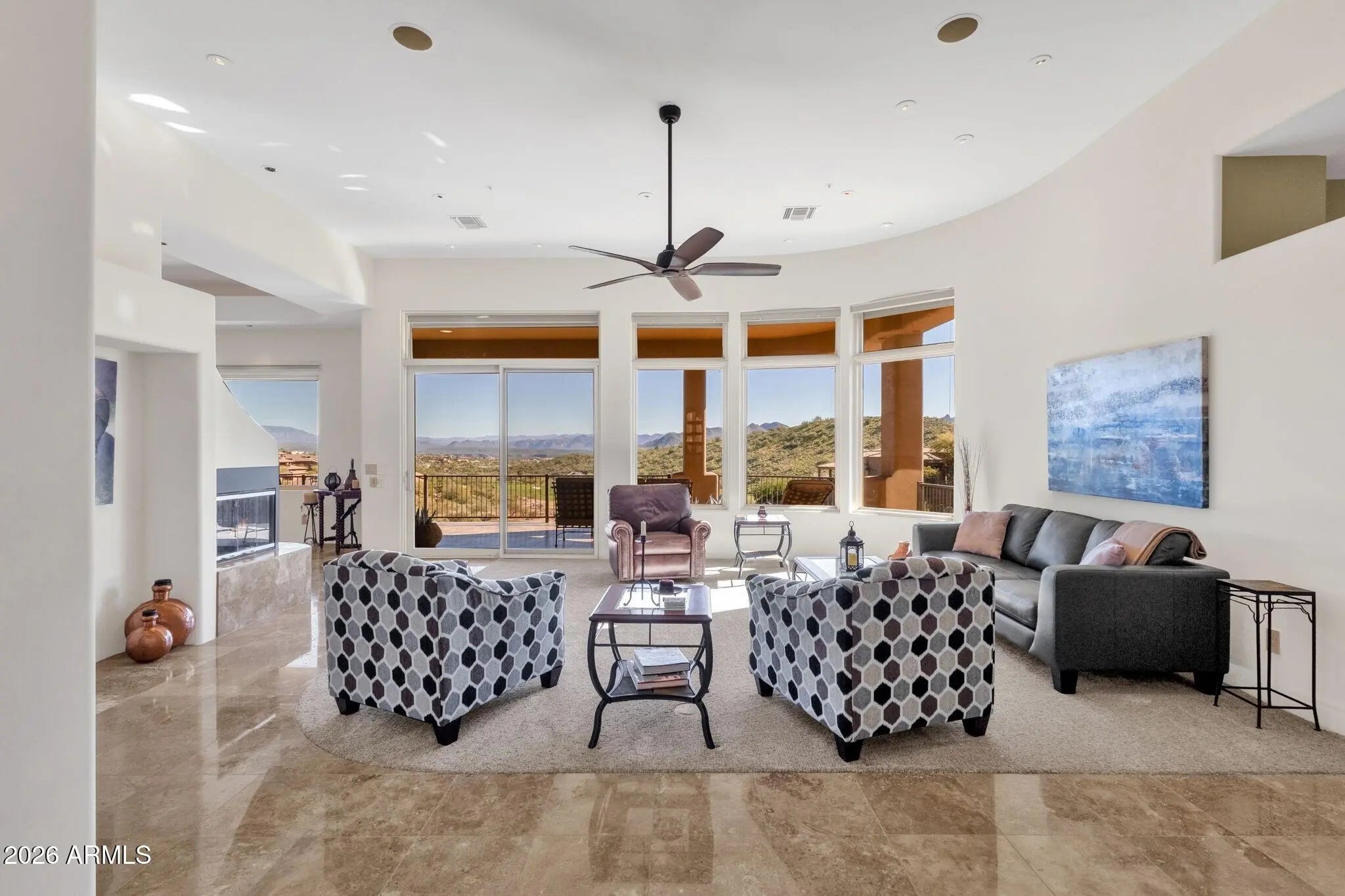 Enjoy sweeping views capturing Four Peaks, Red Rock, and the 11th fairway of FireRock Country Club from this meticulously cared for home. Well designed, the stunning views are a backdrop found from every room throughout the home. Open to the living room, the gourmet kitchen is well appointed with bar seating, new quartz countertops, plenty of storage, along with newer kitchen-aid appliances including gas cooktop, warming drawer, and dishwasher. The primary suite is generously sized with a sitting area and bay windows that frame the scenery, while the spa-like bath features an Aquatic soaking tub, makeup vanity, and custom closet built-ins. Take the elevator or stairs to the lower level, offering an apartment-style layout with a kitchenette complete with ...See More ...sink, microwave, and refrigerator, along with two bedrooms, a home office, and a versatile bonus room (or 5th bedroom). Outdoors, an incredible negative-edge pool and bubbling spa take full advantage of the dramatic desert and golf course views. Additional features include an exercise room, Lutron lighting, automatic sunshades, butler's pantry, elevator, central vacuum, and Pella windows and doors throughout. Offered furnished and truly turnkey, the home allows for an effortless transition and immediate enjoyment. Additional features and updates are available on the upgrades list.