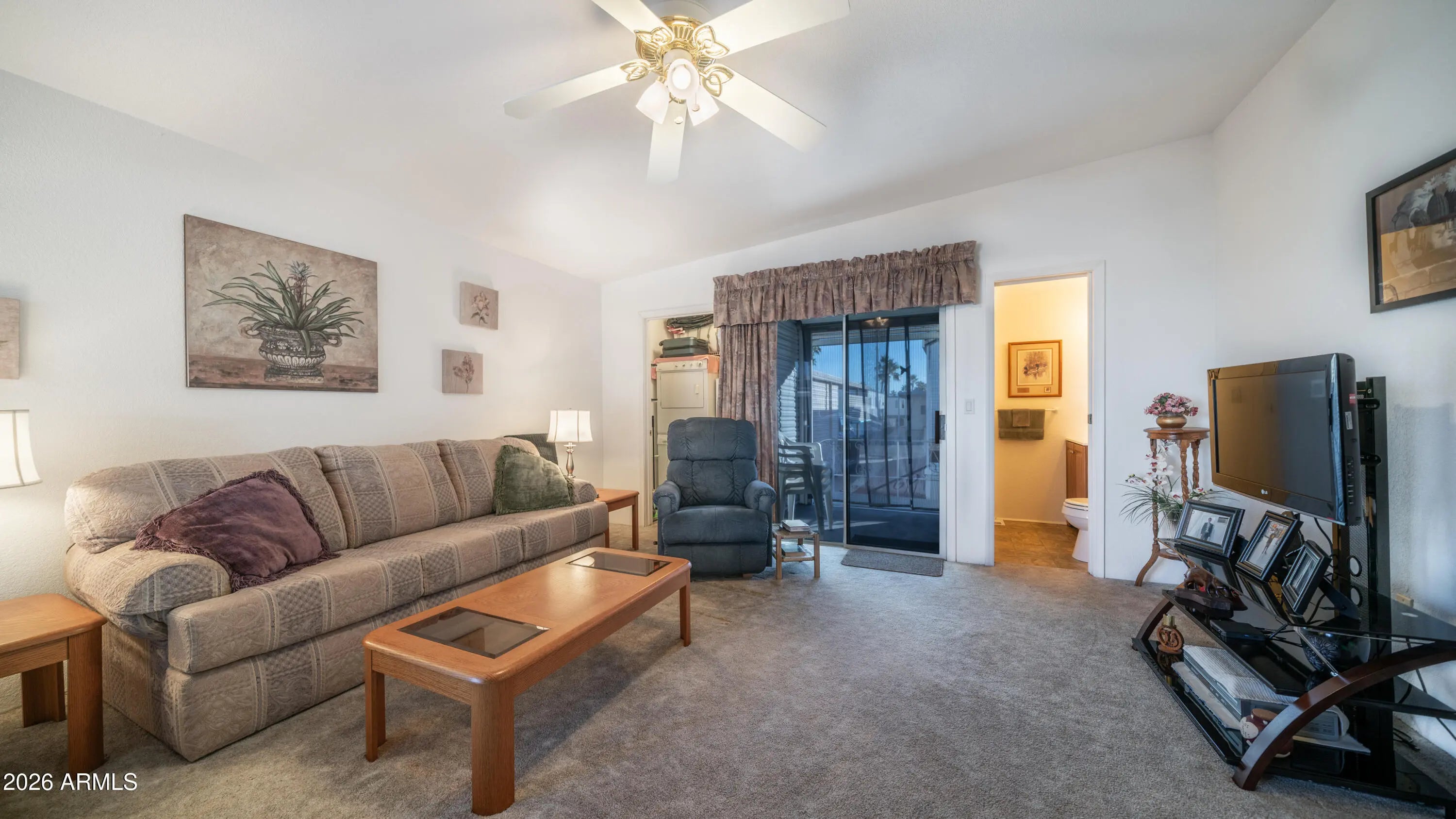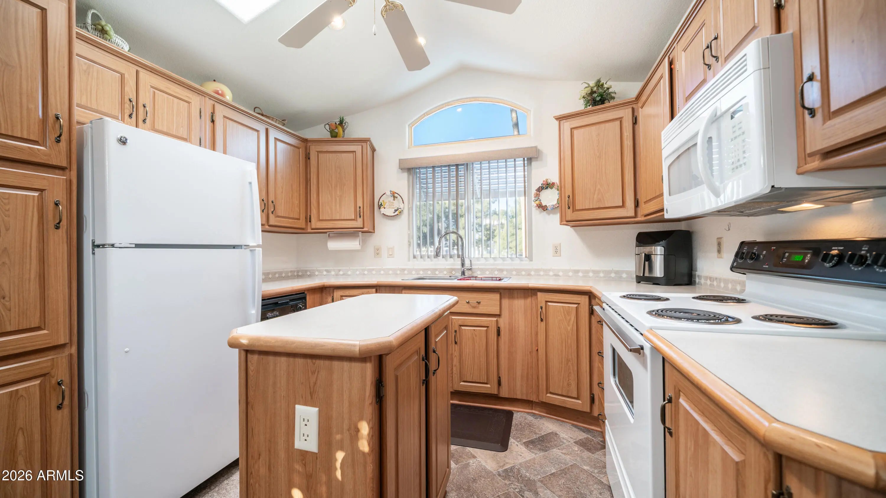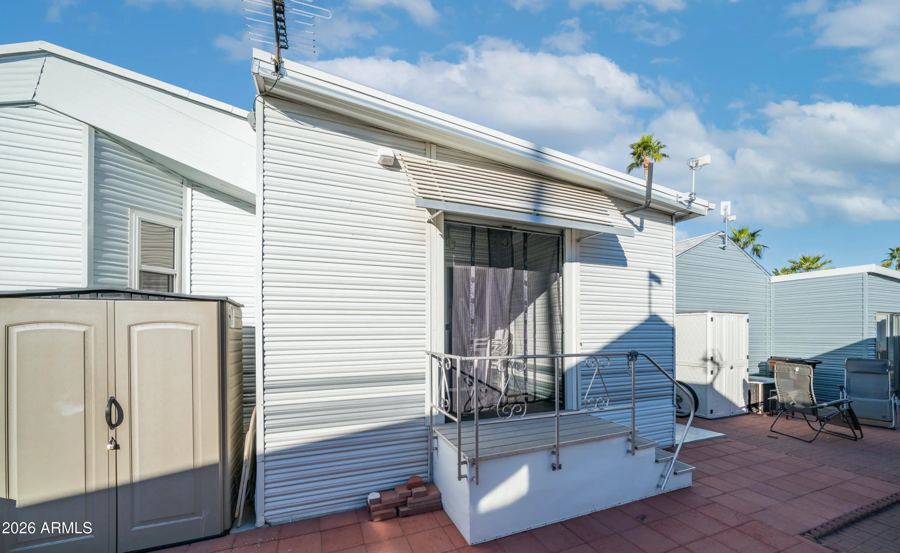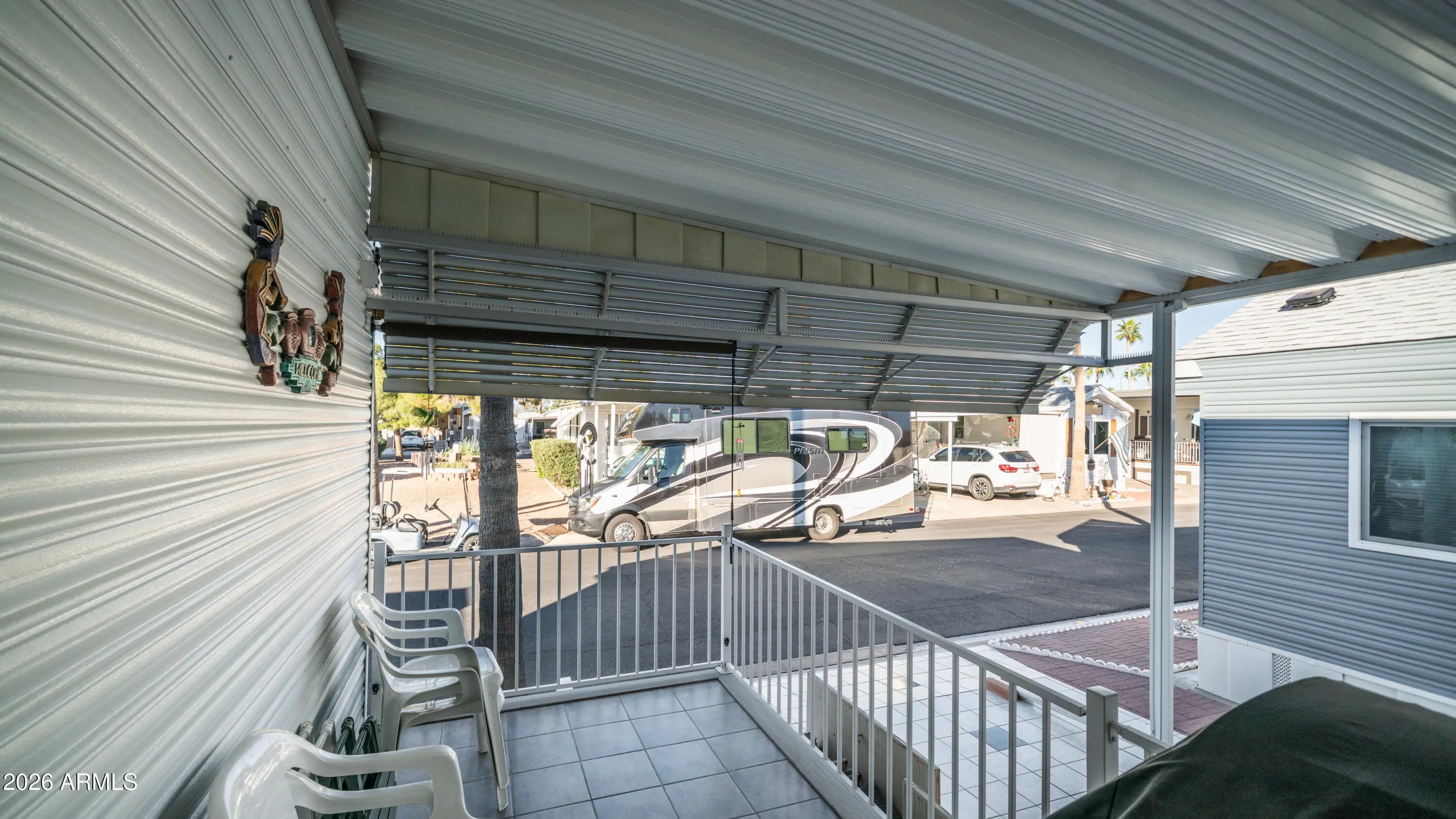 From the moment you arrive, this meticulously maintained home impresses with a beautifully tiled front carport area, a welcoming deck perfect for outdoor seating, & three convenient pull out storage drawers tucked neatly underneath, setting the tone for how thoughtfully cared for this property truly is. Step inside to the expansive front kitchen that feels both open & inviting, featuring wood look laminate flooring, a full size stove, dishwasher, kitchen island, abundant countertop space, generous cabinet storage, & two skylights that flood the space with natural light, making cooking & entertaining a joy, all while the home comes fully furnished & ready to enjoy. Just beyond, the comfortable bedroom offers a large mirrored closet door with a built in dresser & loads of storage, while the main bathroom includes a corner tub shower combo that provides extra elbow room & ease of use. Flowing seamlessly from the park model on the same level is the extremely spacious Arizona room with higher ceilings, a half bathroom, stacked washer & dryer, a second refrigerator, & a large picture window overlooking open space, creating a bright flexible living area that can also be fully separated by a door for private guest quarters. All walls throughout the home feature tape & texture finishes with vaulted ceilings in the park model adding to the open airy feel, while double pane windows were replaced in 2015 & the rubber roof was updated with a transferable warranty still in place. The back of the home reveals one of the most unique features in the community with a covered & enclosed back deck that allows you to enjoy the outdoors rain or shine, along with a paver back patio ideal for relaxing in privacy. All of this is perfectly situated on the edge of the Pet Section without being fully inside it & located within a highly active community offering endless activities including dances, bingo, card games, softball, shuffleboard, hiking groups, woodshop, silversmith, stained glass, pottery, & nonstop winter fun in sunny Arizona where resort style living truly shines.
