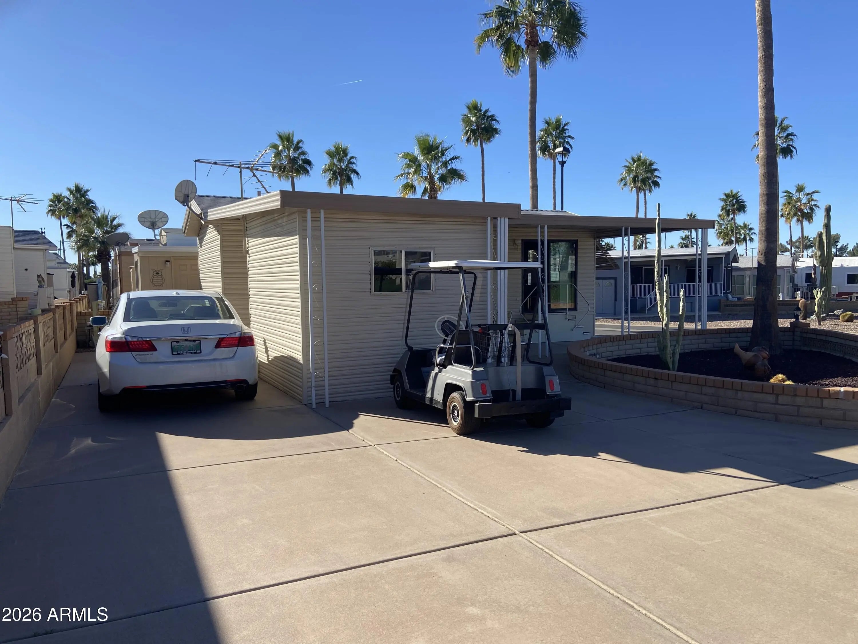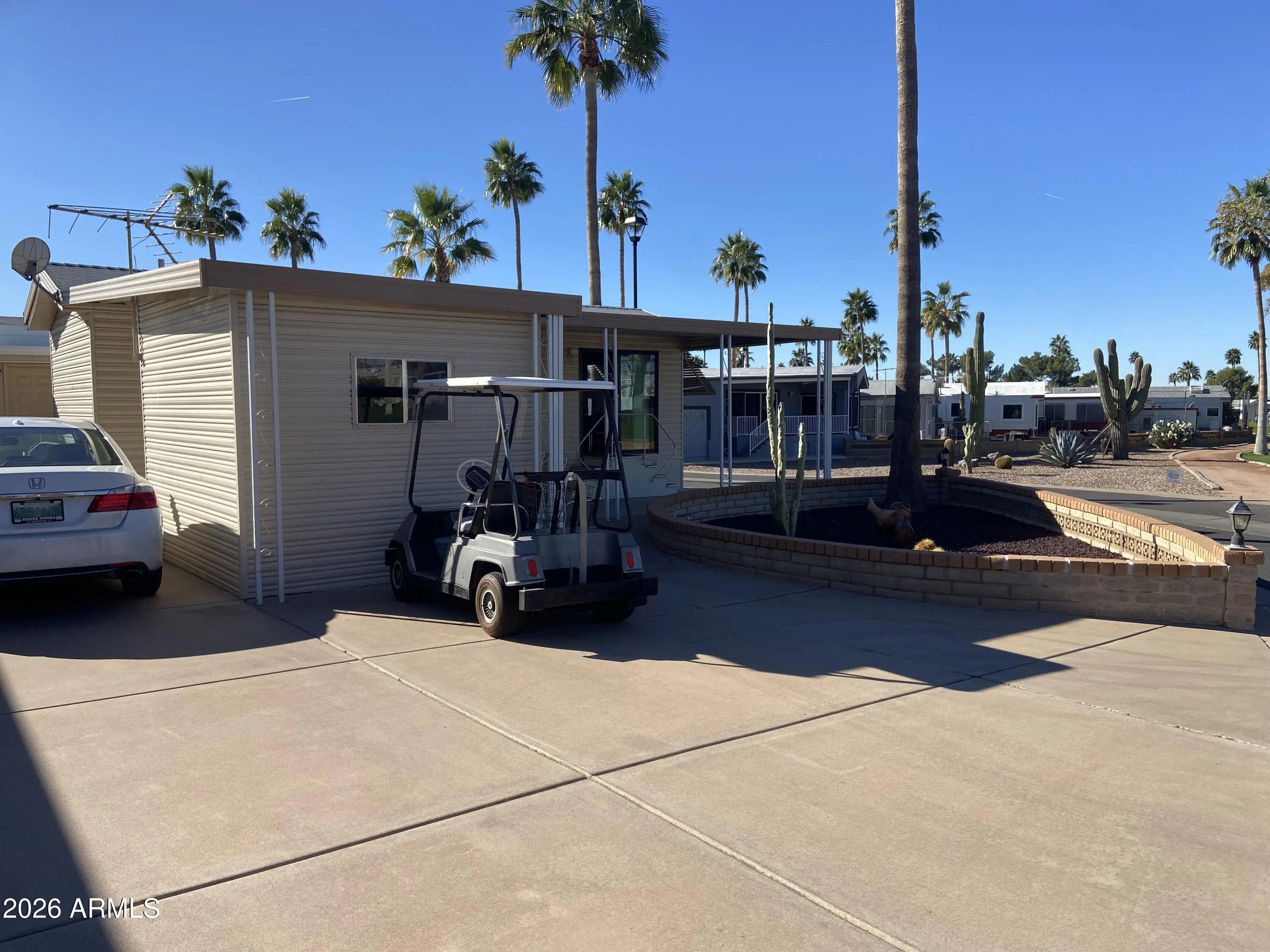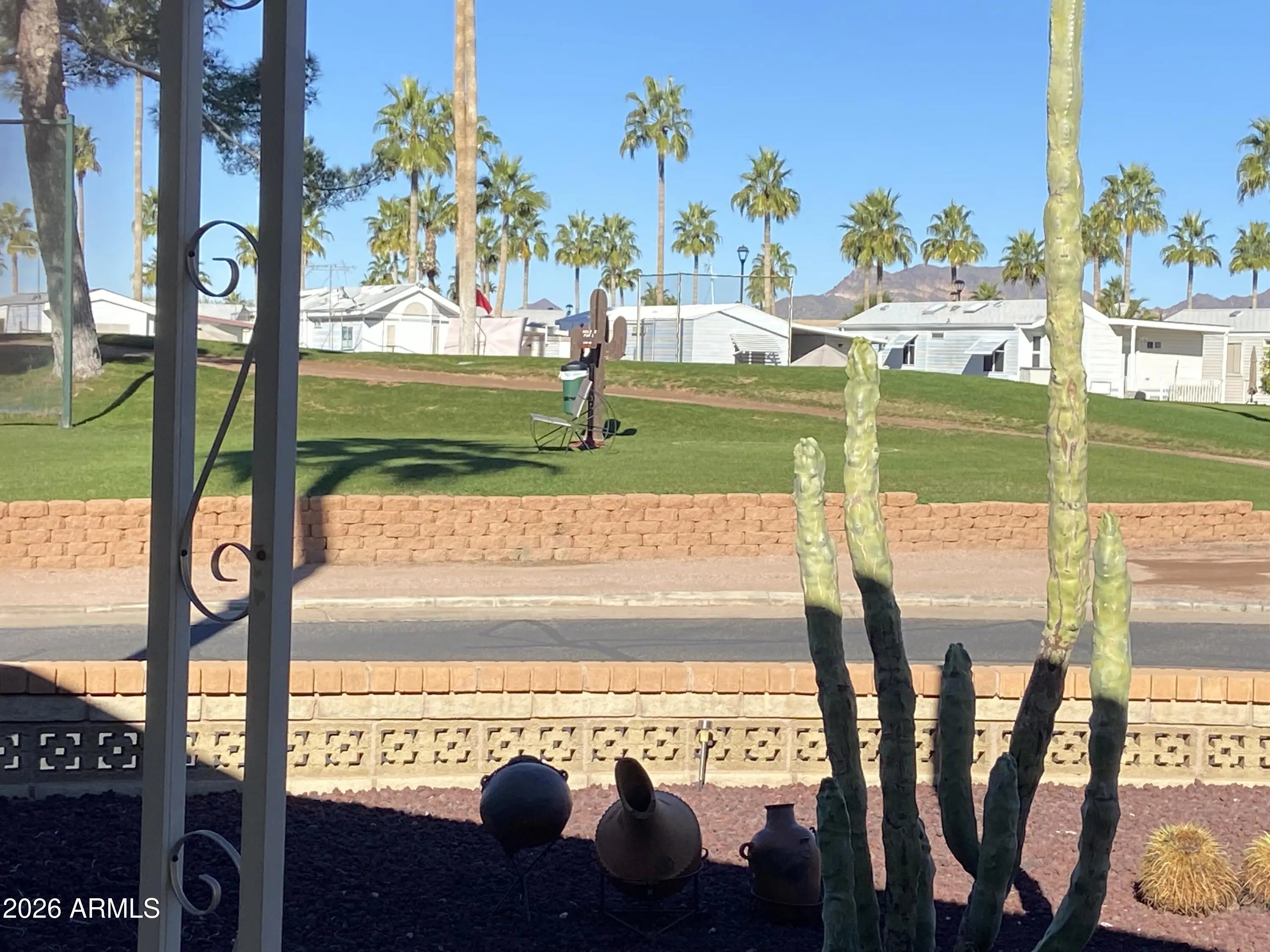 View the golf course! This well cared for winter home is in the best 55+ resort in the east valley. Well out of the strike zone with mountain views! This immaculate 1990 park model has plenty of parking for multiple vehicles and room for your golf cart. Solid surface flooring, large shed/laundry, 2 patios, one under shade and one to enjoy Arizona's sunshine. Spacious corner lot close to pools, spas, on-site restaurant and pro shop.