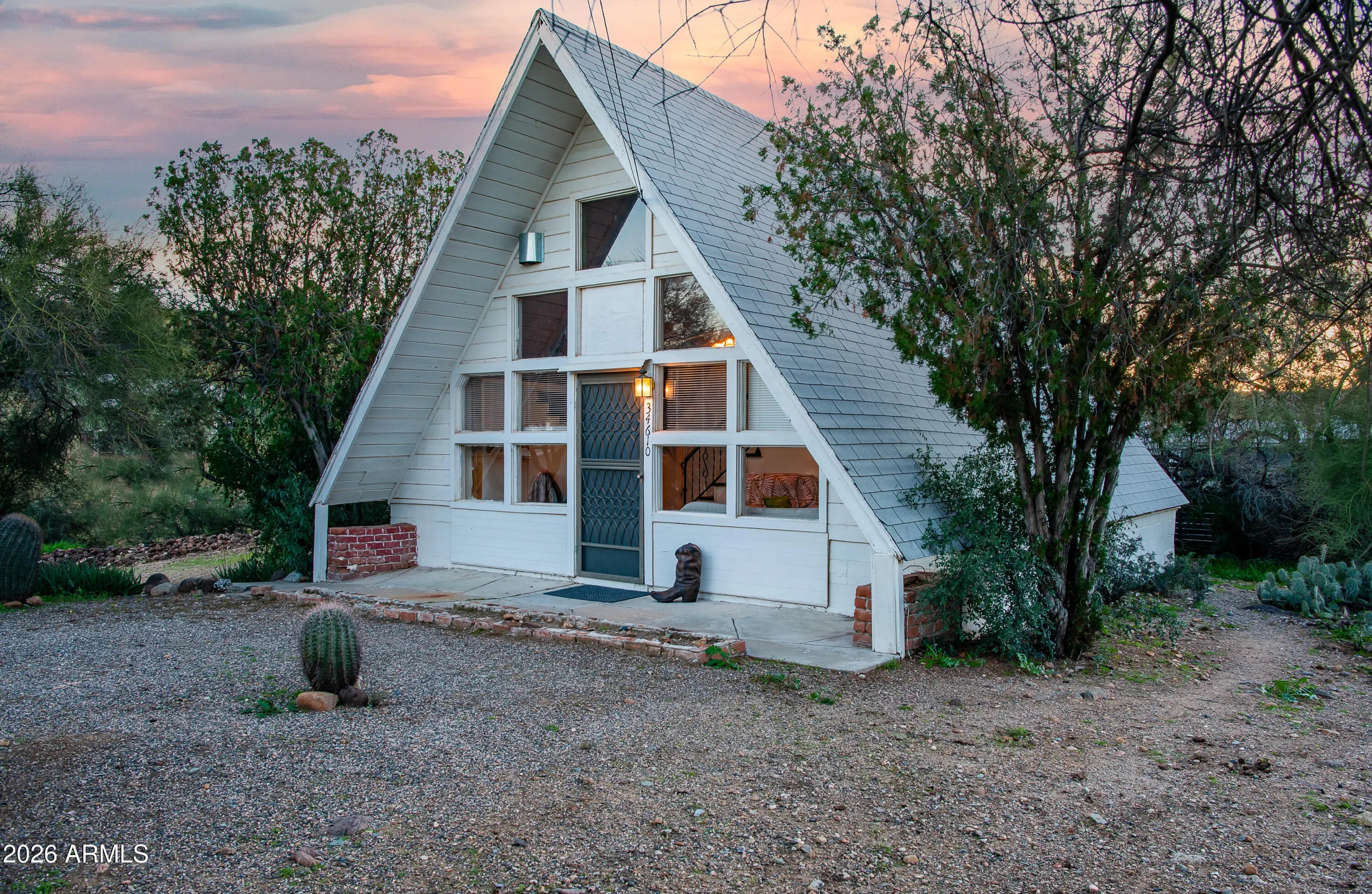 Welcome to Black Canyon City! First stop (or last) in the Sonoran Desert. This charming A-frame cabin could be your peaceful winter getaway, country home, or an adorable Airbnb. Tucked away on a dead-end street, this home is bright and open, neat as a pin, has fresh interior paint, and new window coverings. There is a two-car garage with room for a workshop and storage. The shady back porch is the perfect spot to savor a cup of coffee and observe the desert's inhabitants as they go about their morning routines. On the property, a healthy 200+ year saguaro is home to many birds, including the Arizona cardinal! Black Canyon City is five to ten degrees cooler in the summer than the rest of the Valley of the Sun. It has all the amenities, groceries, gas, a coffee shop, restaurants, including the famous Rock Springs pie shop! Come un-plug and discover the quiet life. If you really feel the urge to breathe some pollution and fight traffic. Phoenix is less than 30 minutes away!