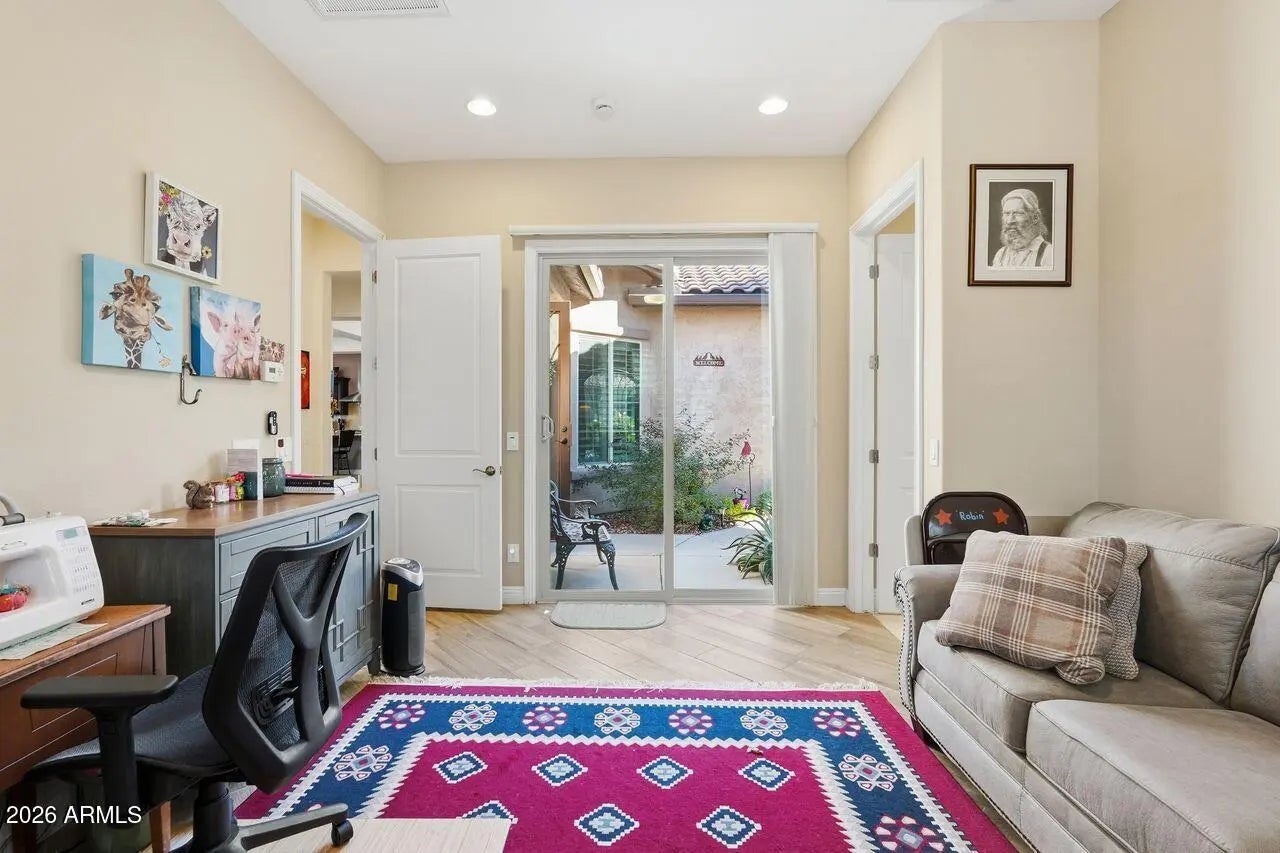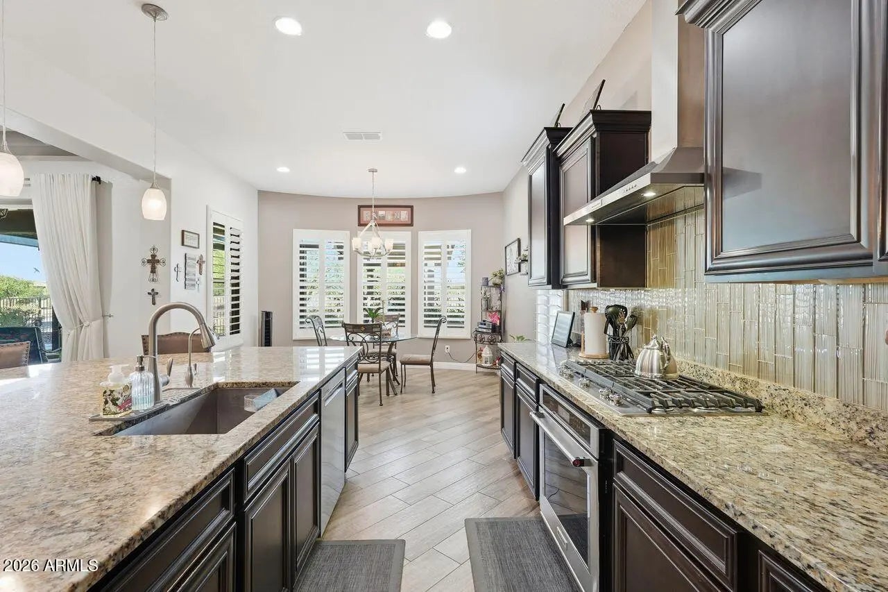 Welcome to resort style living on the 8th green of the Poston Butte Golf Course! This beautifully upgraded Journey model offers exceptional functionality with the highly desired guest suite option, complete with its own private sitting room perfect for visiting family, long term guests, or a private home office retreat. The home features a 4' extended 2 car garage plus a separate golf cart garage, both finished with coated floors. Whole house water purification system installed recently. Inside, you'll find a blend of elegance and comfort with diagonally laid wood look tile, plantation shutters, 5'' upgraded baseboards, and crown molded cabinetry throughout. The kitchen shines with stainless KitchenAid appliances, a farmhouse sink, glass tile backsplash, upgraded granite countertops, and a glass front butler's pantry for added storage and style. A dramatic sliding glass wall opens the great room to the backyard, creating a seamless indoor/outdoor living experience. The low maintenance landscape features synthetic turf, an extended pergola that was recently added, and a builtin BBQ island with its own pergola perfect for sunset gatherings overlooking the golf course. Located in the masterplanned community of Anthem at Merrill Ranch, with a Rec Center that has indoor lap pool, outdoor pools, indoor walking track, pickleball, bocce ball, loads of classes and clubs, and dining at the Anthem Grill.
