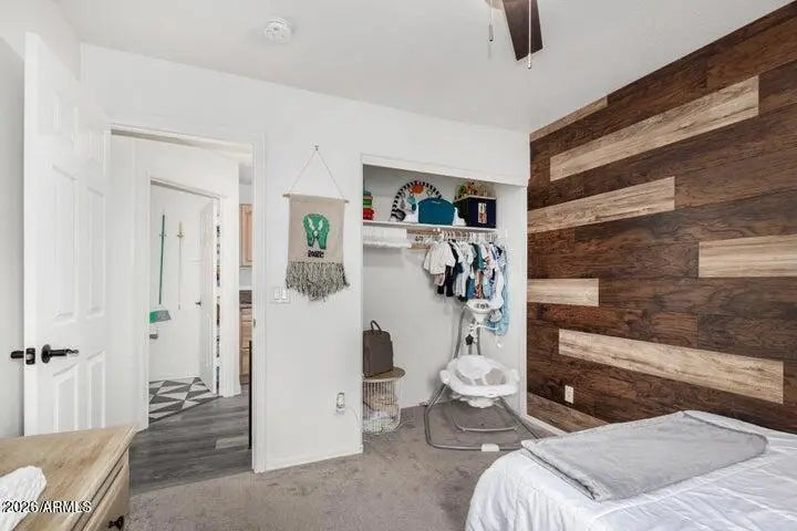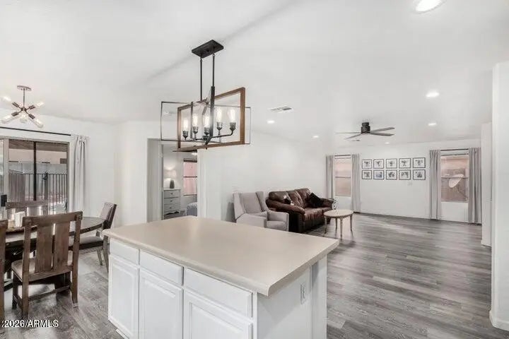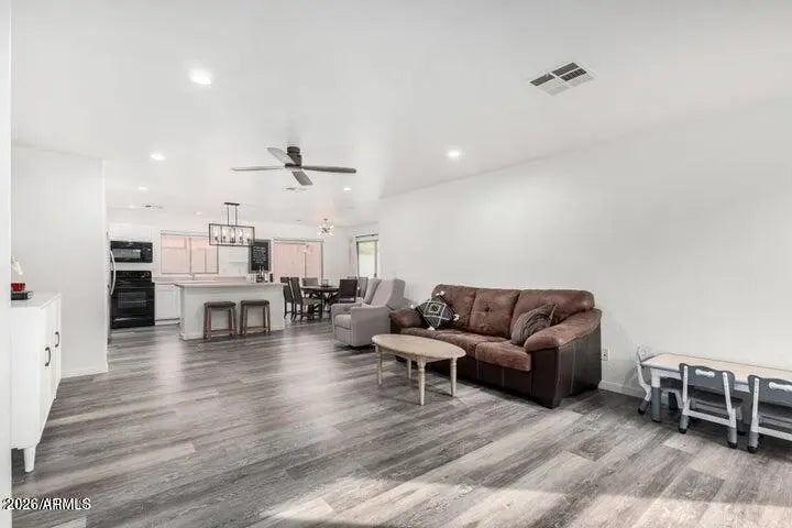 This beautifully updated 4-bedroom, 2-bath home features 1,568 square feet of thoughtfully designed living space. Highlights include new laminate flooring and baseboards, plush new carpet in the bedrooms, and a stylish accent wall in the living room. The light-filled living area flows effortlessly into the kitchen, creating an open, airy atmosphere ideal for everyday living and entertaining. The kitchen offers a generous island with seating and a dining area adjacent to a sliding glass door that opens to the backyard. The primary suite includes an ensuite bath with dual vanities and abundant linen storage. Three additional bedrooms complete the home, including one with double doors off the living room—perfect for a home office or flex space. Outdoors, enjoy a covered patio overlooking a sparkling pool and a low-maintenance turf yard, ideal for making the most of Arizona's beautiful weather.