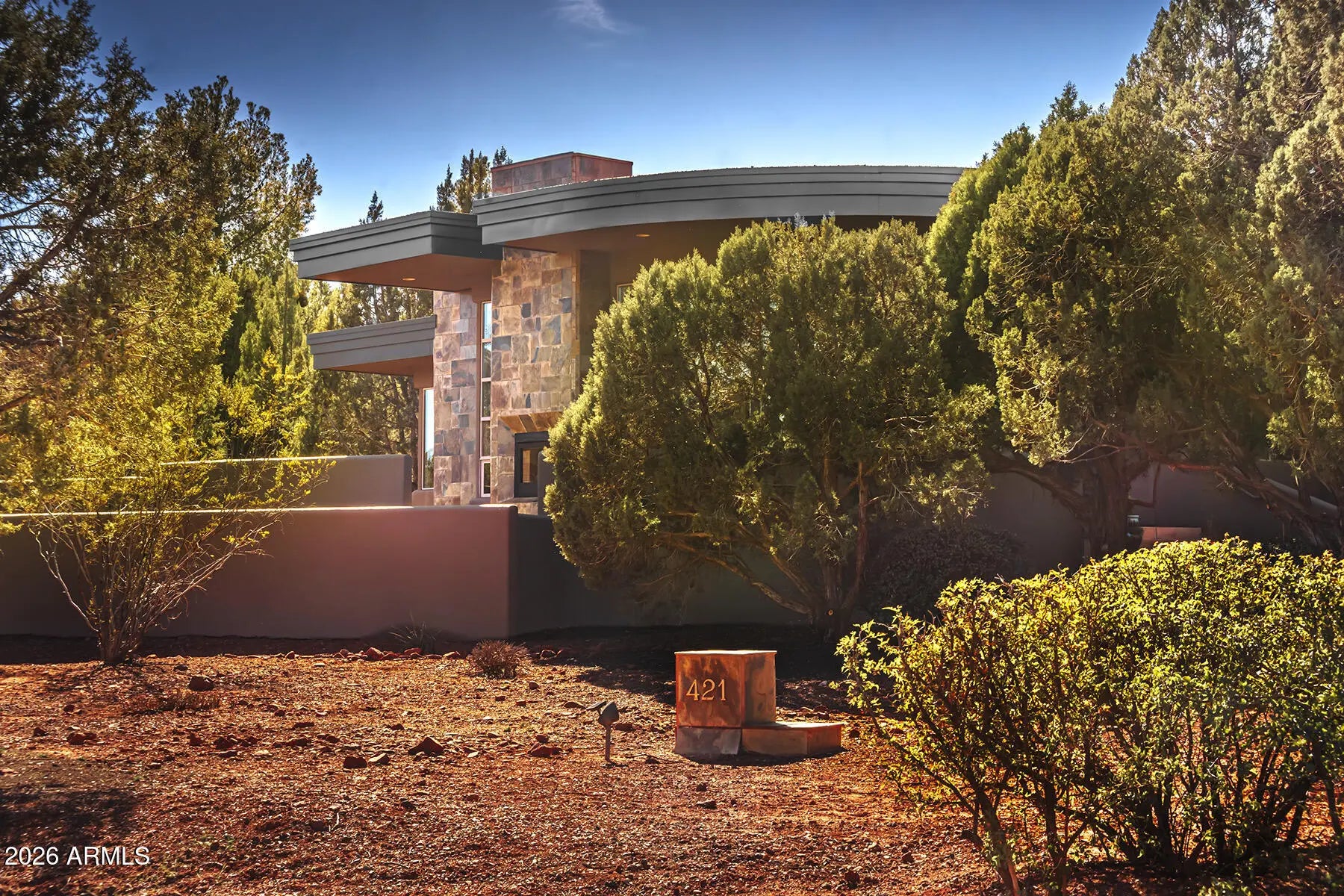 Wright-Inspired Sanctuary with Private Access to Trails & Red Rock Views! Experience the perfect harmony of architecture and nature in this Frank Lloyd Wright-inspired home. Set on a secluded .8-acre lot in West Sedona, soaring windows frame inspiring Red Rock. The split floor plan features a sophisticated office with custom built-ins and three cozy fireplaces, including a dramatic double-sided fireplace that opens to an expansive view patio. Complete with a private neighborhood gate to world-class hiking, an immense 2.5-car garage for all your adventure gear, and no HOA, this home is the pinnacle of West Sedona indoor-outdoor living.