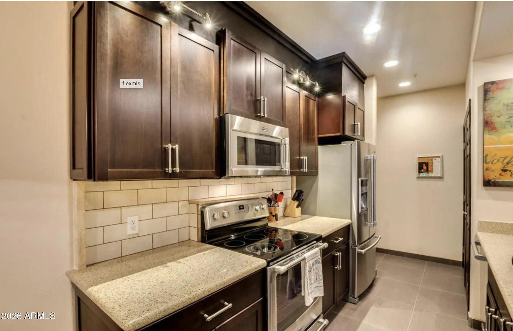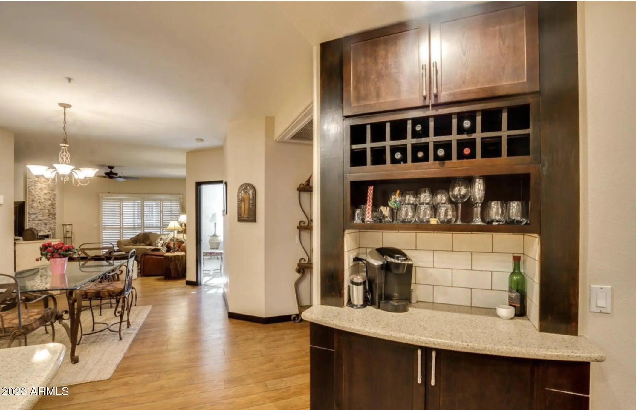 Discover refined resort style living in this updated ground level residence, tucked within a prestigious gated community in coveted McCormick Ranch. Offering a desirable split two bedroom, two bath floor plan with an attached garage, this sophisticated condo blends timeless elegance with modern luxury. The professionally redesigned kitchen is a showpiece, featuring custom shaker style cabinetry, stainless steel appliances, SilesStone countertops, designer tile flooring, and a generous breakfast bar. A thoughtfully curated built in wine and coffee nook adds both charm and convenience, seamlessly flowing into the open living and dining space. Here, rich wood like flooring and a striking stacked stone fireplace with a fire glass tray burner create a warm yet upscale ambiance. Both bathrooms have been beautifully transformed with updated cabinetry, SilesStone counters, designer fixtures, updated lighting, and elegant tile flooring. The serene primary suite offers dual sinks, a spacious walk in closet, and a luxurious glass shower designed for relaxation. Step outside to a cozy covered patio and private pool, or enjoy the community's resort inspired amenities, including a fitness center, heated pool and spa, and lush green spaces. Ideally located just minutes from premier shopping, dining, scenic hiking trails, and walking or biking paths, this exceptional residence captures the essence of Scottsdale luxury living.