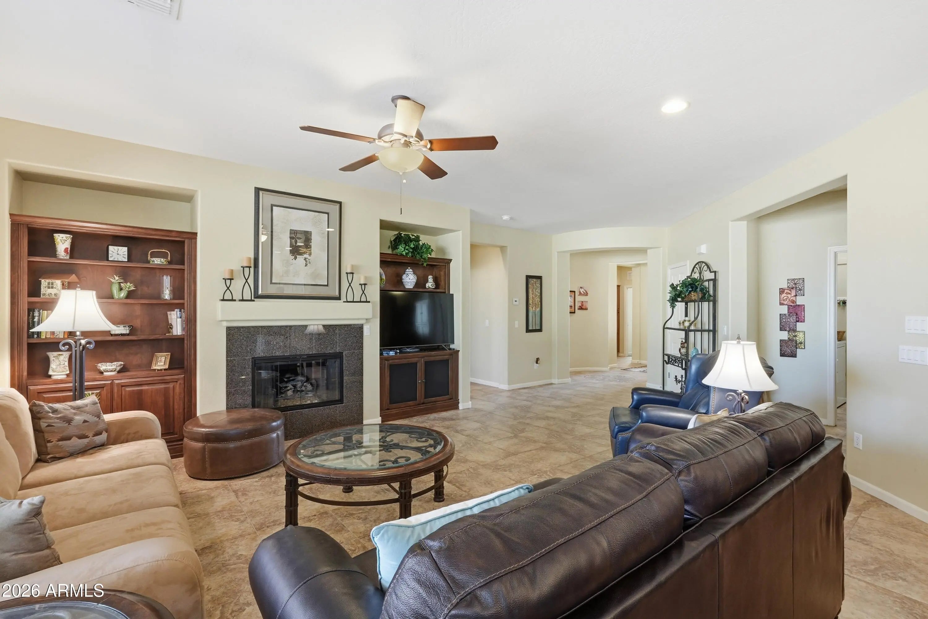 INTEGRA-BLOCK home fully furnished (turn key) on a over-sized, corner home site in the heart of Robson Ranch. Gorgeous 2 Bedroom + Den, 2 bath home boasts of many upgrades including large tile & laminate flooring throughout (carpet in closets). Kitchen features engineered stone counter tops, staggered maple cabinets, roll out shelves, pendant & under cabinet lights. Great room has a cozy fireplace & built-ins. Dining & master have bay windows. The 2 car garage + golf cart garage has 2 ft. ext & utility sink. The backyard faces North & is an entertainers paradise w/numerous seating areas, large covered patio, landscaping w/mature palm trees, built-in gas fireplace & BBQ! Don't miss out on this one! Large fenced backyard. MOVE IN READY! Interior painted 2023 and exterior painted 2025 Seller to include a one year home warranty not to exceed $850.00.
