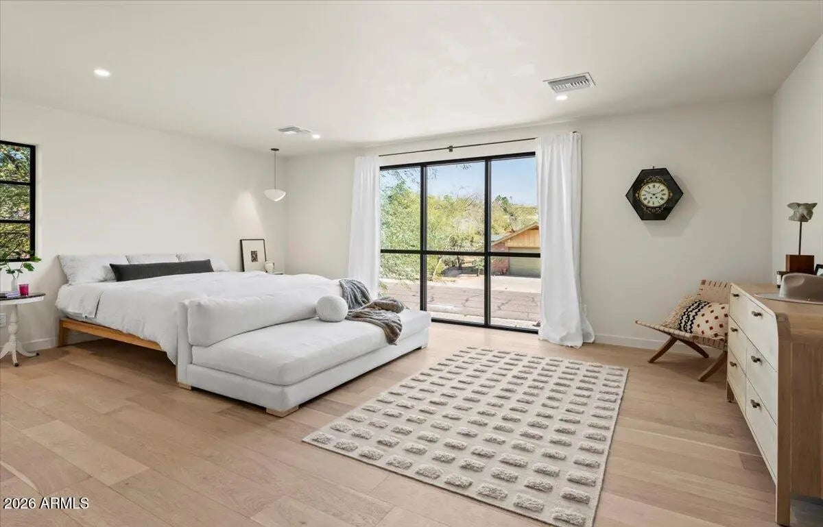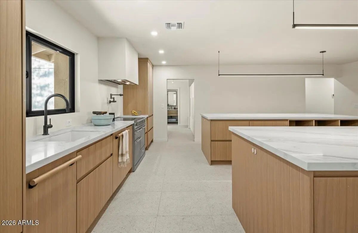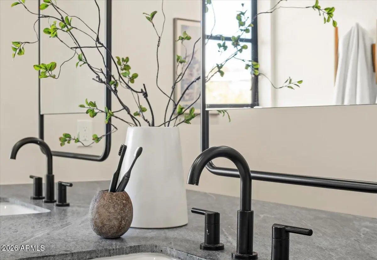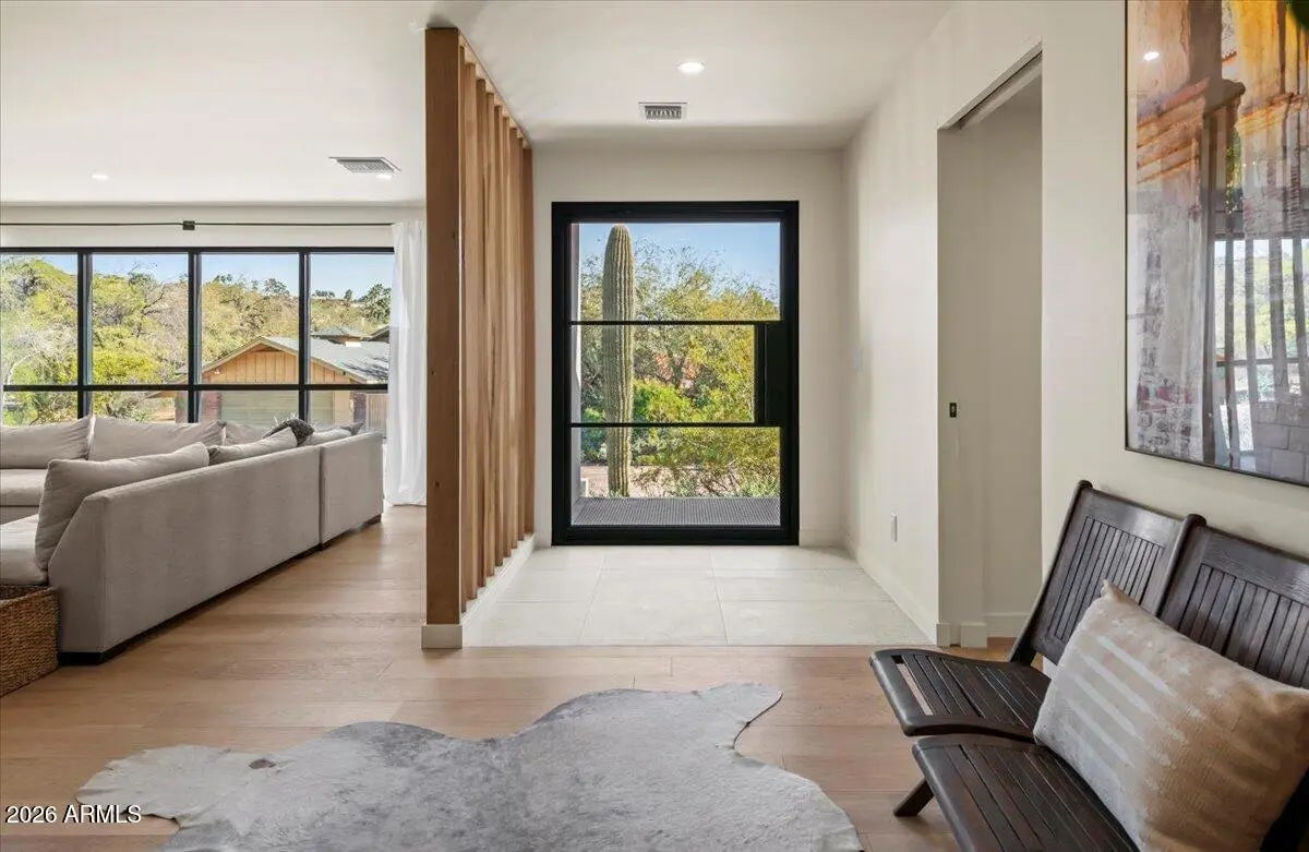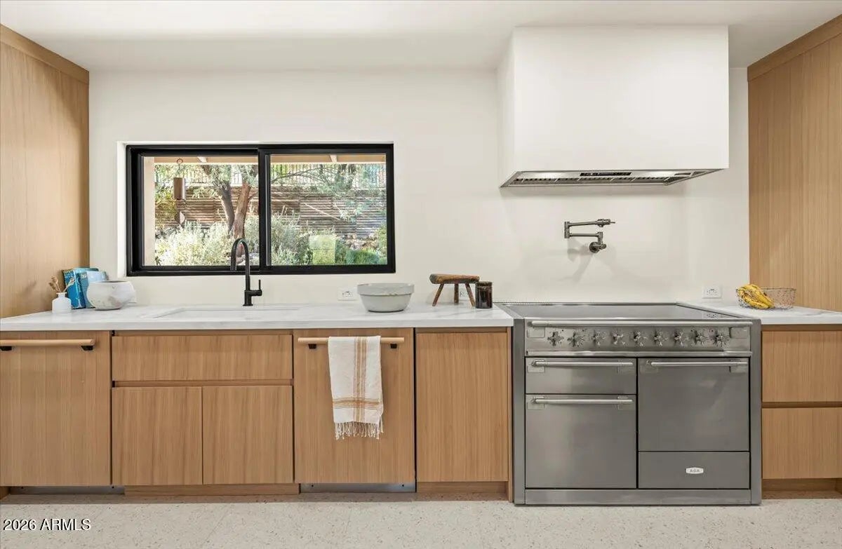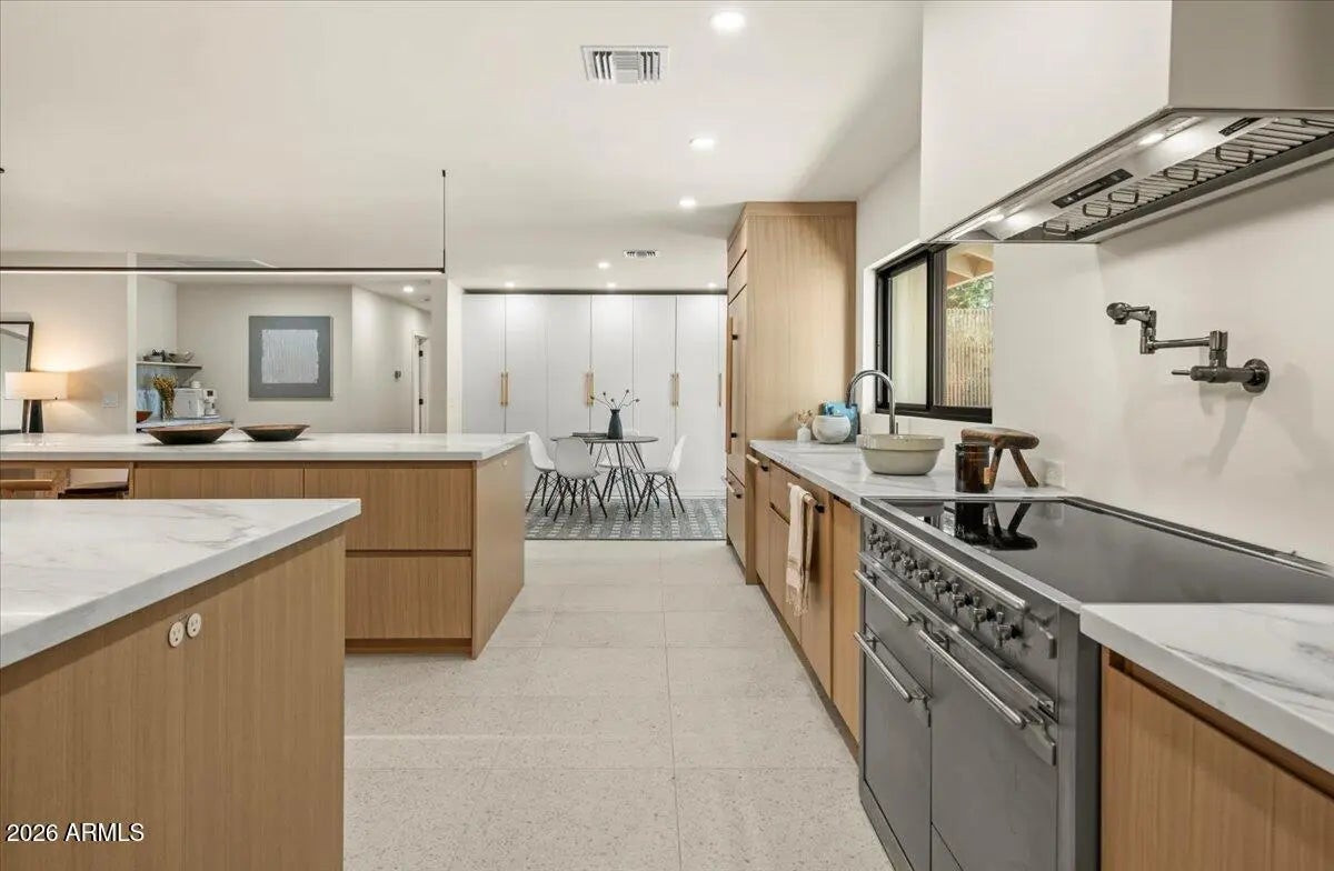 Sitting on an elevated lot this sleek 2025 rebuild offers a cool, modern organic aesthetic that perfectly combines comfort, elegance, and design. The great room is a stunning space with built-ins, the open dining area with coffee bar is perfect for formal and informal gatherings, and the upscale kitchen has everything the aspiring chef could desire, including a 48'' AGA induction range, a panel-ready 48'' SubZero refrigerator, dual Bosch dishwashers, an appliance garage and huge double islands that offer endless entertaining options, tons of casual space for family gatherings, or a workspace for the kids. Contemporary finishes include sleek quartz countertops, custom cabinetry, super stylish lighting, wide plank wood flooring, oversized picture windows that shower the home with natural sunlight, solid core doors, and top of the line faucets and fixtures. The primary suite is super chic and includes a sitting area, a gorgeous primary bath with double vanities, lots of storage, large walk-in shower, separate soaking tub, and his and her closets. A Jack-and-Jill bathroom for the kids is beautiful and functional with double sinks and bathtub. A fully appointed guest house has its own entry or can be accessed through the main house which makes it great for a home office, guests, and a fantastic option for multi-generational living. A temperature-controlled garage equipped with EV charger adds convenience and functionality. The sustainable grounds house a lovely pool, mature landscape and offer exceptional mountain views. All located within walking or biking distance to Arcadia's favorite hotspots, Global Ambassador & within the coveted Hopi Elementary school district. This ultra styled home, in a highly coveted neighborhood, is for those who appreciate state-of-the-art architecture at its finest!