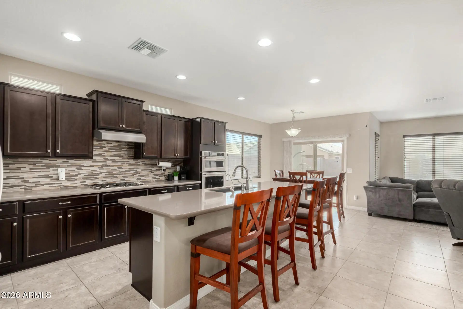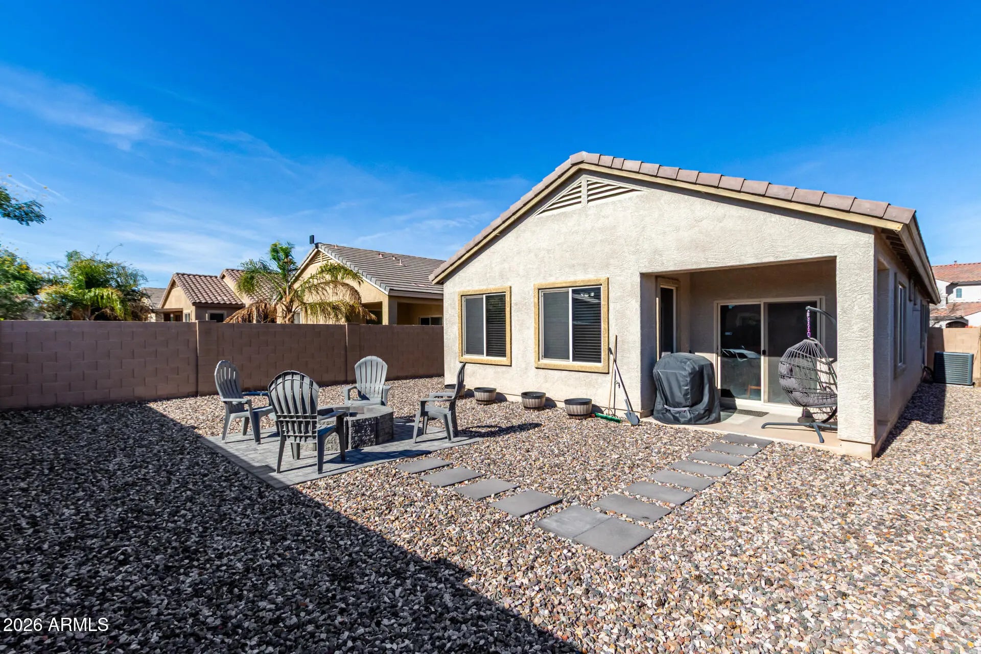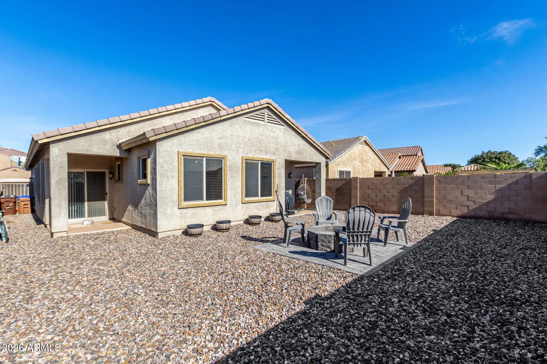 Start your new chapter in this adorable 3-bedroom home in Johnson Ranch! The stone-accented facade, 2-car garage, and paver driveway are just the beginning. Inside, you'll find inviting living spaces featuring tile flooring, baseboard molding, plenty of natural light, and two-tone paint. The impeccable kitchen boasts staggered cabinetry with crown molding, tile backsplash, solid-surface counters, built-in appliances, and an expansive island with a breakfast bar. Get a good night's sleep in the main suite, offering a walk-in closet, a bathroom with double sinks, and a private exit. The backyard showcases a cozy covered patio perfect for morning coffee and peaceful evenings, a seating space with pavers and a fire pit, and an easy-maintenance landscape. Make this gem yours now!