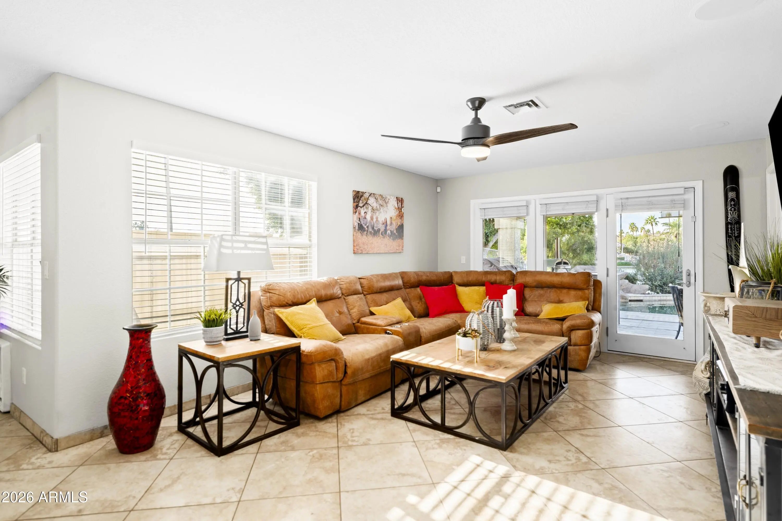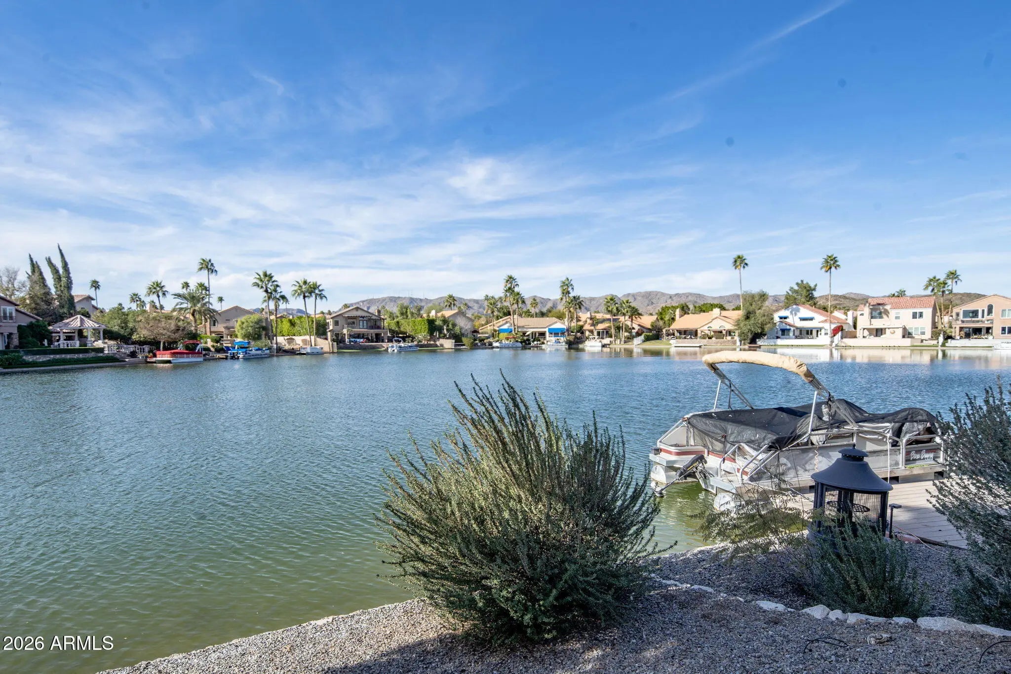 Nestled on over 100 feet of beautiful lakefront, this exceptional 4-bedroom, 3-bath residence offers a blend of elegance and tranquility. A private composite dock invites effortless boating, while breathtaking sunsets over South Mountain set the scene from the backyard, upstairs balcony, and the gas-heated pool and spa. Tucked away in a quiet cul-de-sac, the home welcomes you through a charming courtyard entry that enhances both privacy and curb appeal. Inside, the thoughtfully updated kitchen and baths are filled with natural light and showcase newer stainless-steel appliances, a gas cooktop, and refined finishes throughout—combining beauty and function to promote both relaxation and entertaining.