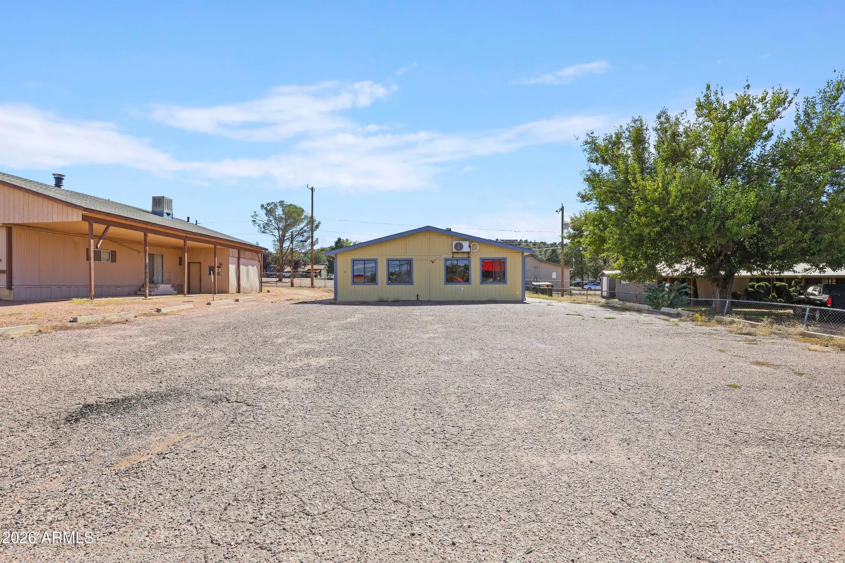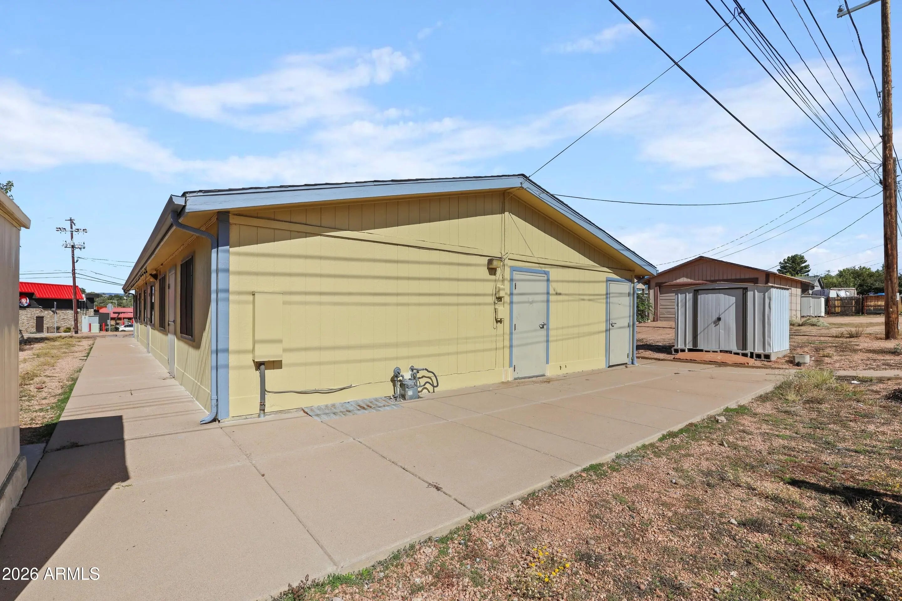 Modular building has large open area with 2 separate offices and 2 exterior entry keyed restrooms. Shed for storage. Parking in front for easy access to level lot.
