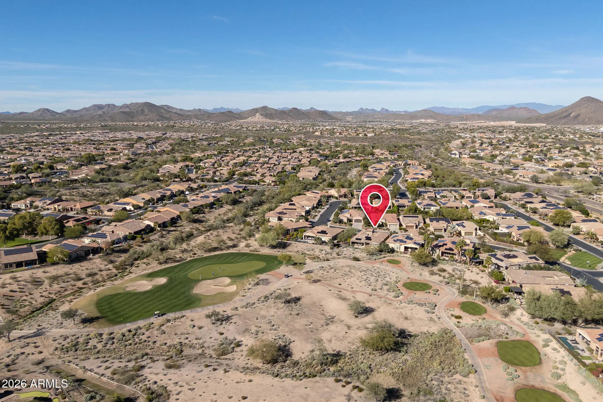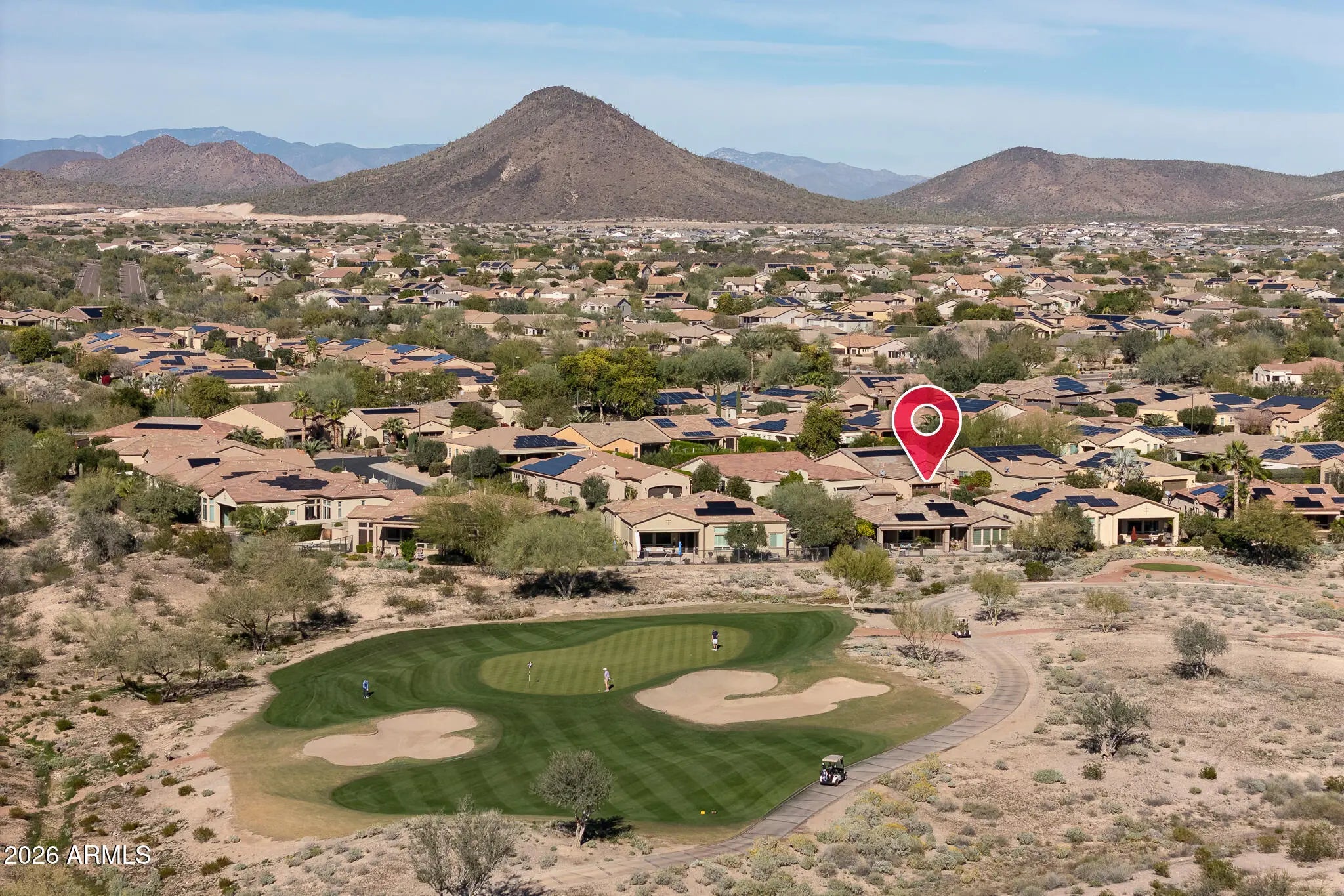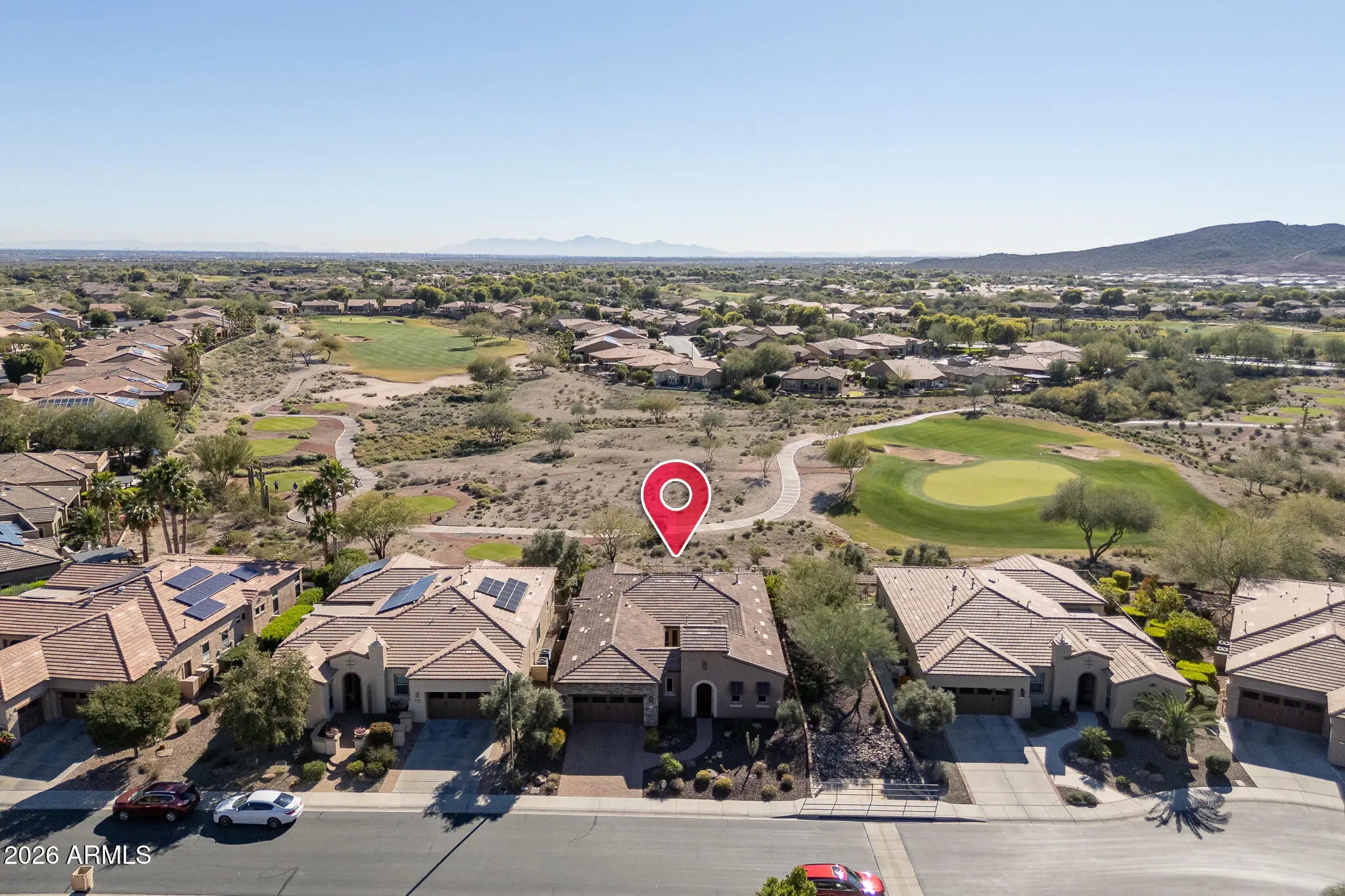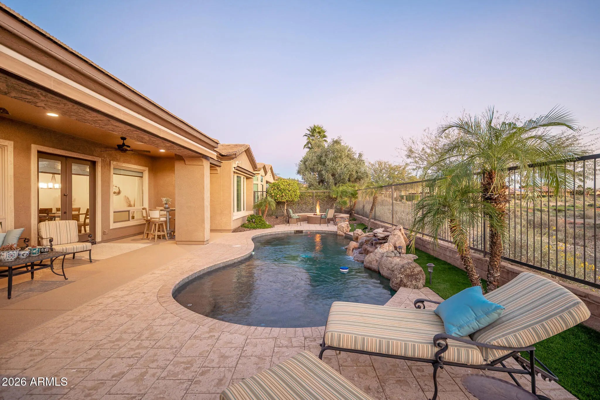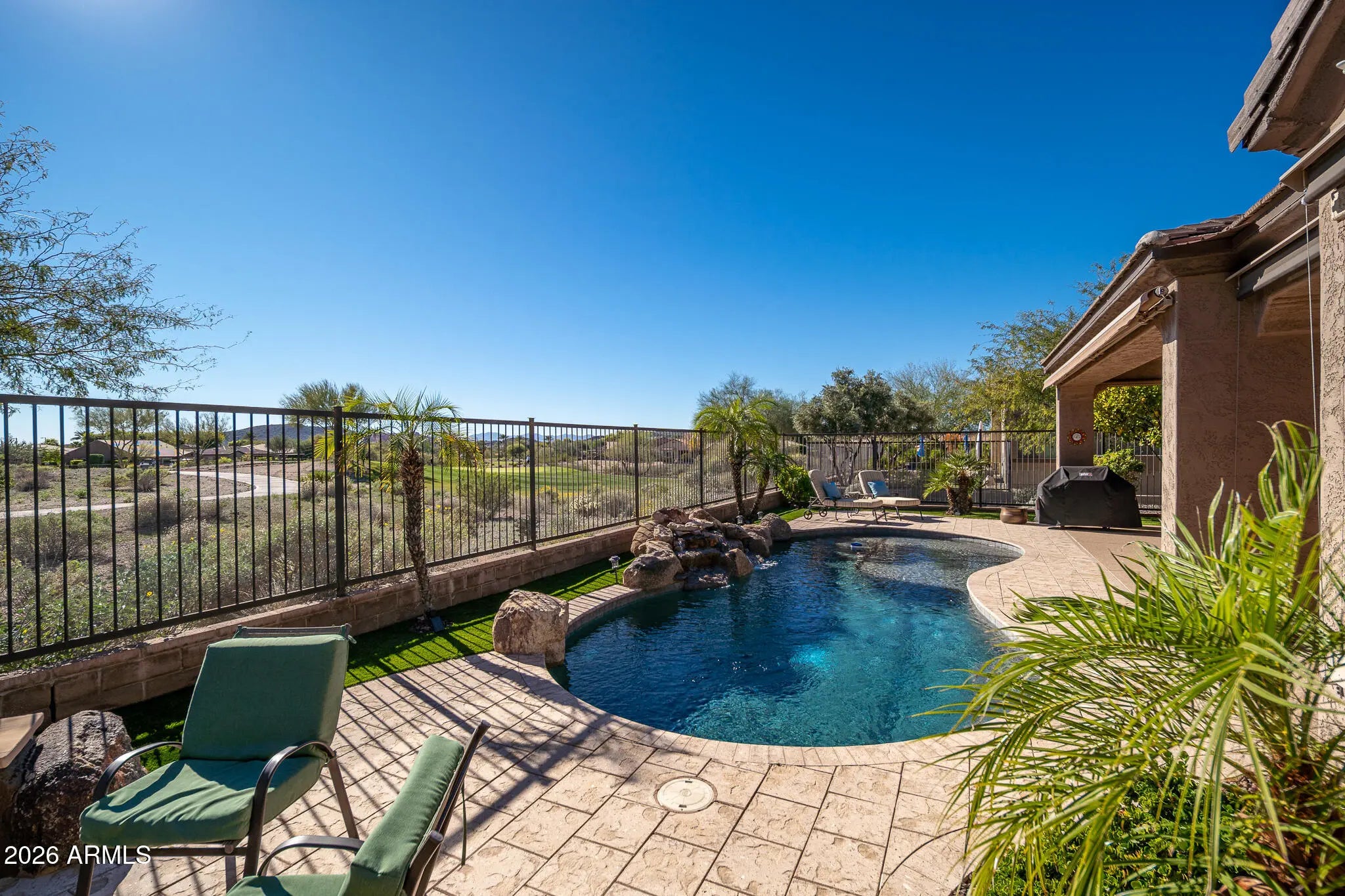 Resort-style living on the golf course in Trilogy at Vistancia! This exceptional home is perfectly positioned on the 7th green with south-facing mountain views and a private backyard oasis. Enjoy a heated pool with rock waterfall, in-ground cleaning system, covered patio, artificial turf, and view fencing overlooking the lush fairway. Inside, the home features a chef's kitchen with Bosch stainless steel gas appliances, alder cabinetry, granite slab counters, designer backsplash, and wine/beverage center—perfect for entertaining. Double doors open to a spacious den with built-in desk and bookshelves, ideal for a home office or flex space. Curb appeal shines with a paver driveway, stone accents, and private courtyard entry. Located in Trilogy at Vistancia, a premier resort community offering golf, pools, fitness center, dining, clubs, trails, and an active social lifestyle. This is Arizona living at its finest!