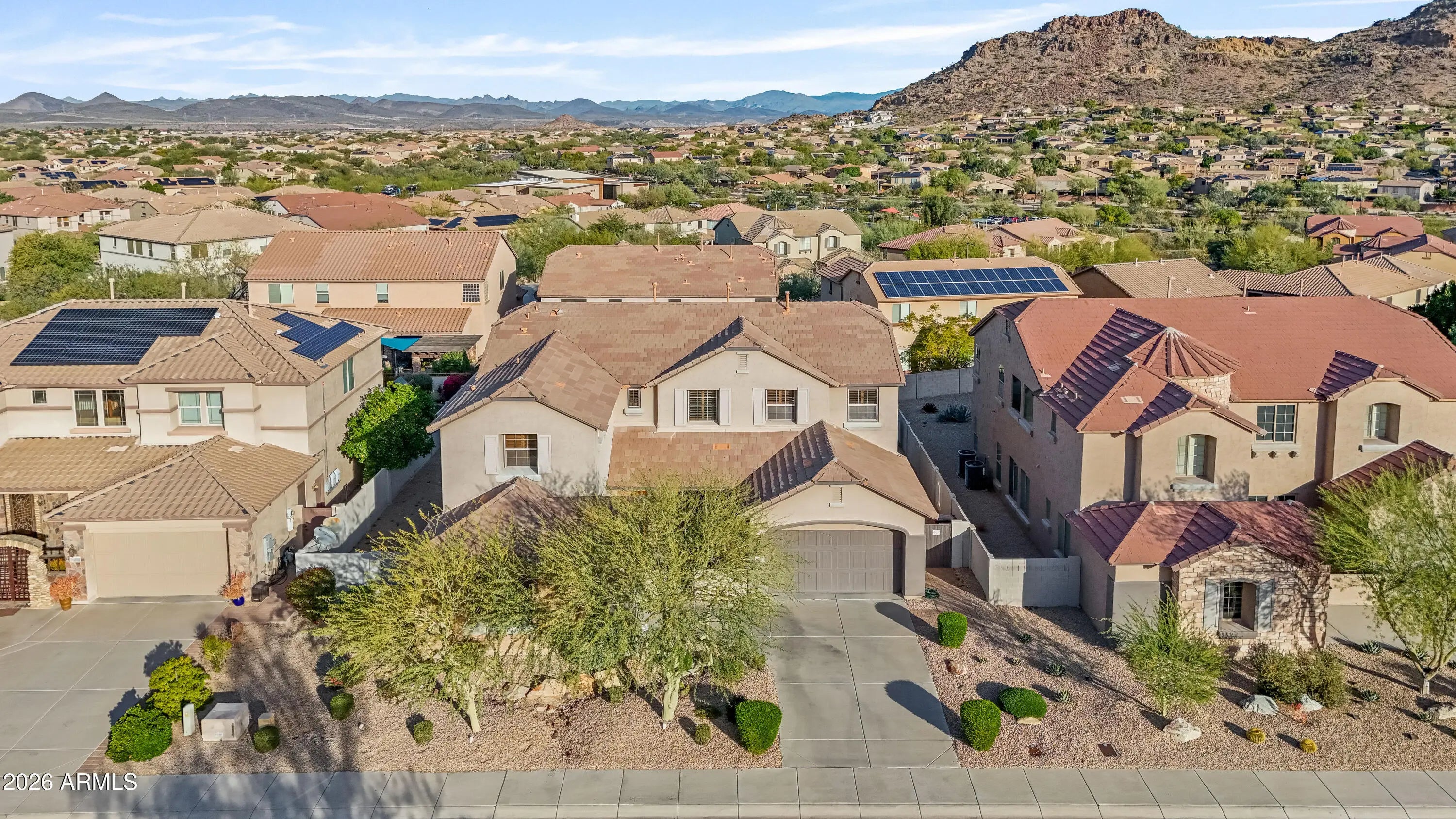 MOTIVATED SELLERS. Bring in reasonable offers. Welcome to this stunning home in the highly desirable Westwing Mountain community in North Peoria, AZ. Blending generous space, beautiful mountain views, and an exceptional lifestyle, this impressive residence features 5 bedrooms and 4.5 baths with nearly 3,900 square feet of well-designed living space, offering room for everyone to spread out and enjoy. The thoughtful floor plan includes a great room, bonus room/office, loft, and a downstairs bedroom—perfect for guests or multi-generational living. The kitchen is a true gathering place with granite counters, a large island, gas cooking, and a walk-in pantry, flowing effortlessly into inviting living and dining area. Upstairs, the primary suite provides a private retreat with a sitting area, walk-in closet, a spa-style bath featuring a separate tub, shower, and dual vanities. Step outside to your own backyard oasis complete with a private pool, covered patio, and low-maintenance desert landscaping ideal for relaxing or entertaining while taking in the surrounding hillside setting. Car enthusiasts and hobbyists will love the 4-car attached garage with extended length, tandem parking, and even electric vehicle charging stations. Located by the cul-de-sac lot in a community rich with amenities, this home delivers both comfort and convenience. Recent updates include brand-new top of the line AC system and furnace replaced May 2025, water heater September 2024, garage door opener system in both garages, oversized elegant tile in 2019, exterior paint and new pool pump 2020. For added peace of mind, a OneGuard Home Warranty is included! This beautiful home is surrounded by breathtaking desert landscapes, panoramic mountain views, and unforgettable Arizona sunsets that paint the sky every evening. WestWing is known for its wide-open spaces, scenic hiking and biking trails, playgrounds, and a true sense of community perfect for families, outdoor lovers, and anyone who values peace, beauty, and room to breathe. Wake up to mountain views, enjoy golden sunsets from your backyard, and take evening walks through quiet, well-maintained streets framed by natural desert scenery. This is a neighborhood where kids play outside, neighbors connect, and every day feels a little more special. Homes in WestWing are highly sought after for a reason - the location, the views, and the lifestyle are hard to beat. This exceptional property is ready for its next chapter.