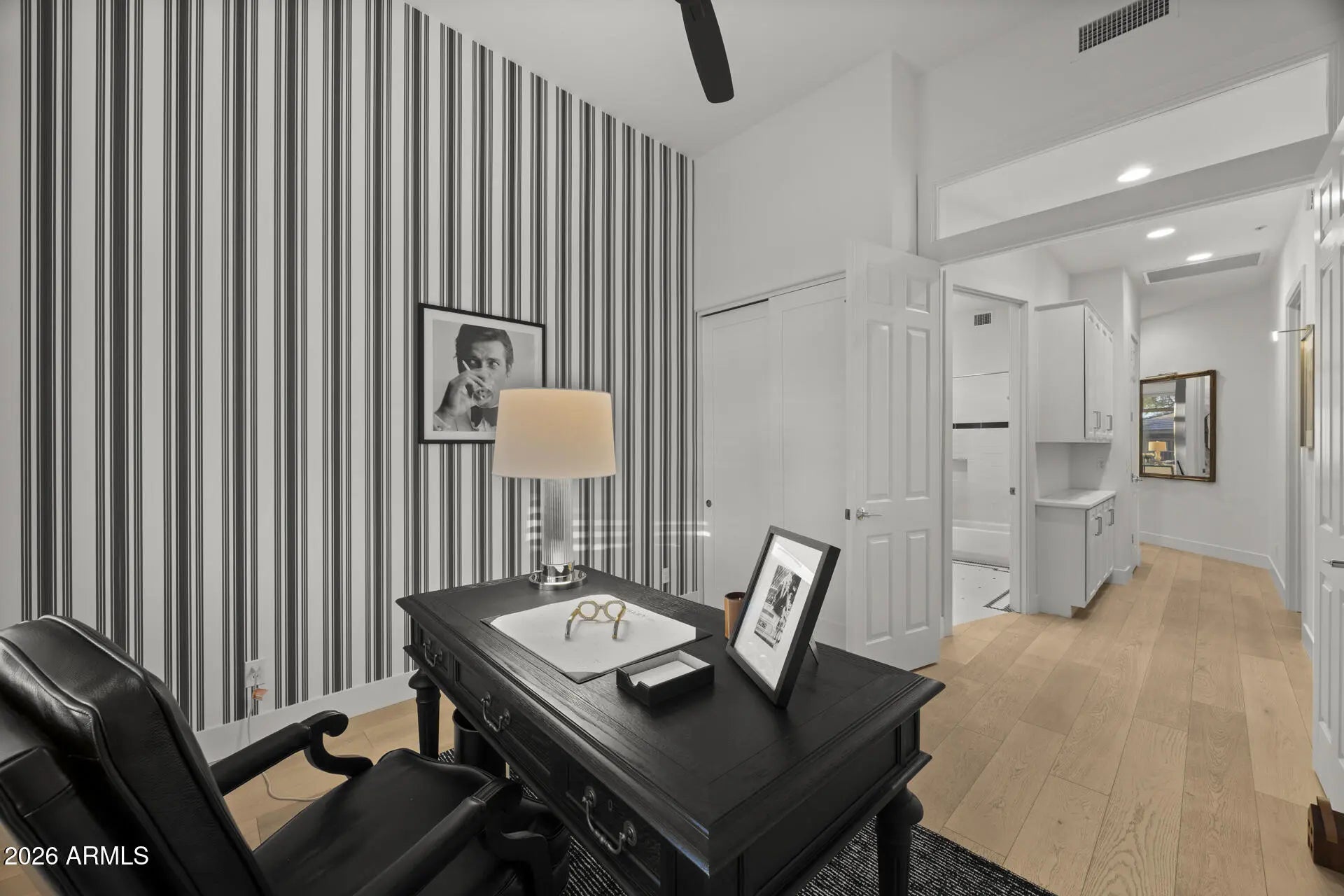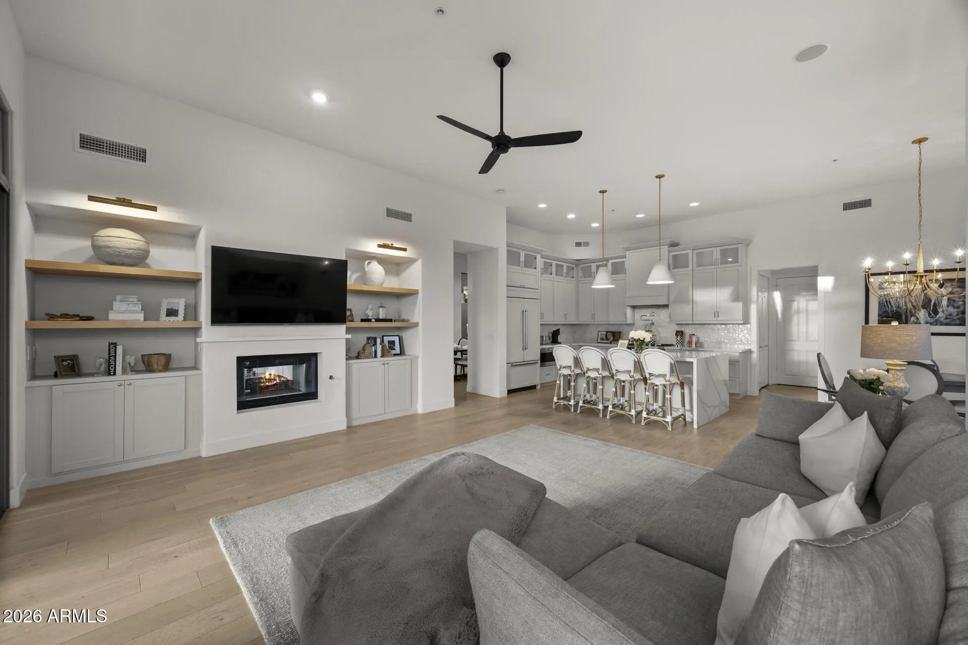 Recently adjusted to reflect exceptional value for the level of remodel, lot, and major system upgrades, this home stands out as one of the most complete offerings in its price range. Fully reimagined and thoughtfully upgraded, this single-level Scottsdale Mountain home offers a rare combination of designer finishes, privacy, and true turnkey living on a premium ¼-acre lot backing to NAOS with no interior steps. At the heart of the home is a show-stopping chef's kitchen, featuring custom cabinetry, a dramatic quartz waterfall island, and top-tier appliances including a 42'' Sub-Zero refrigerator, Wolf 36'' six-burner gas range, and drawer microwave. Designer details such as a Kohler farmhouse sink, Artifacts faucet with pot filler, and Visual Comfort lighting elevate the space, opens seamlessly to the main living areas--ideal for both everyday living and entertaining. The light-filled interior showcases Hallmark Alta Vista European engineered oak hardwood flooring throughout and an open, flowing floor plan that feels both elevated and comfortable. The family room is anchored by a custom-designed fireplace and built-in entertainment wall, creating a refined yet inviting gathering space. A major advantage over many remodeled homes, the property includes $45,000+ invested in new roof underlayment and dual HVAC systems, offering meaningful peace of mind and long-term value. The private backyard backs and sides to natural open space (NAOS), providing exceptional privacy and a serene desert setting. The spacious lot offers an ideal layout for a custom pool, allowing buyers the flexibility to design their own outdoor retreat while enjoying a beautifully finished, low-maintenance yard as-is. With its combination of high-quality remodel, major system upgrades, premium lot, and thoughtful pricing, this home represents a compelling opportunity for buyers seeking style, substance, and long-term value in Scottsdale Mountain.