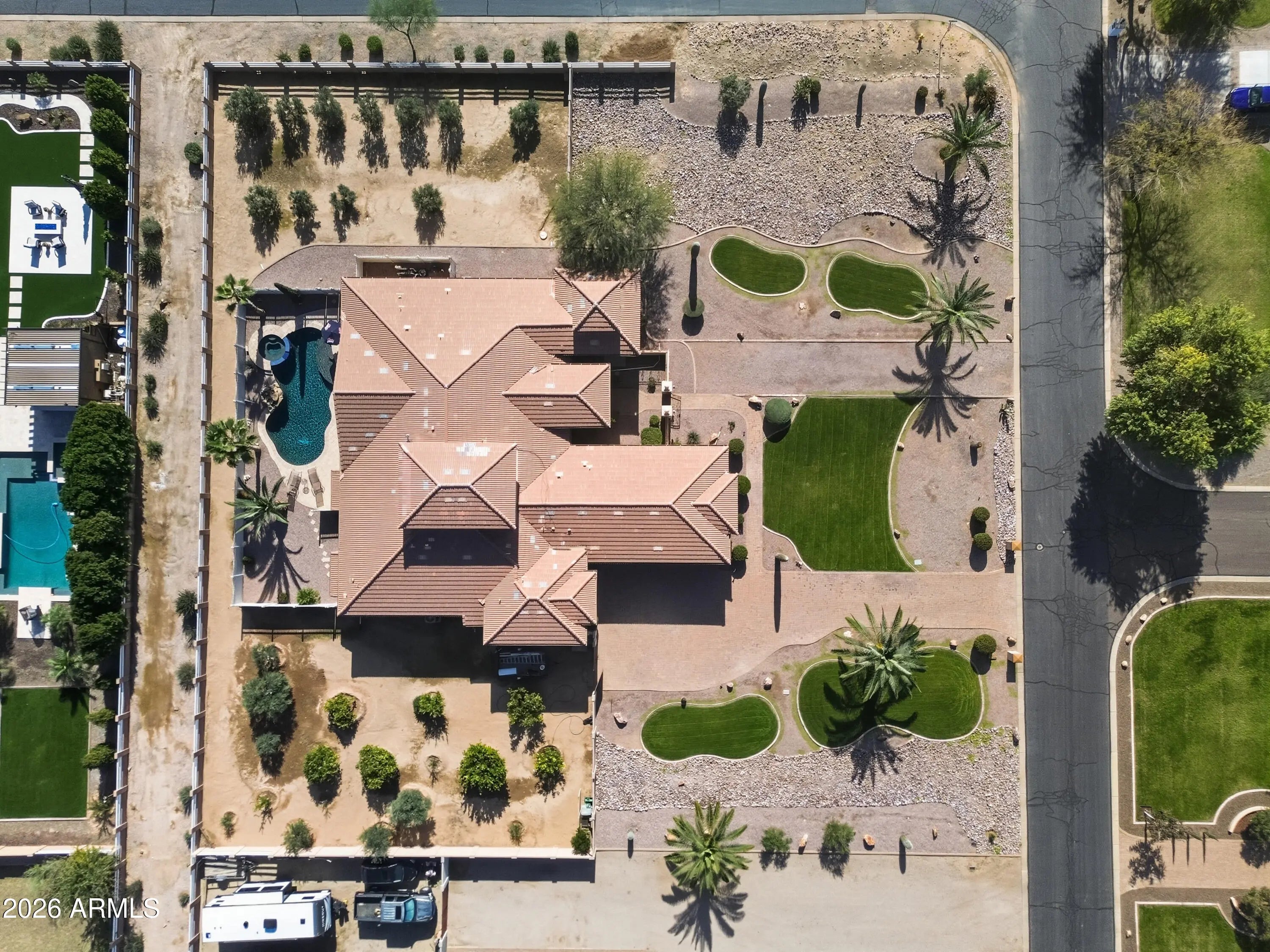Don't miss the walkthrough video! A truly exceptional custom home in the heart of Sonoqui Creek Ranch, set on a premium corner lot just under an acre with standout curb appeal. Opportunities like this are rare. Lightly lived in and owned by the original owner, this residence has been used only weeks out of the year and shows like a model. Designed with space and sophistication in mind, the home offers four spacious ensuite bedrooms, each with its own walk-in closet, along with soaring 12-foot ceilings throughout. The impressive vaulted ceiling over the kitchen creates an immediate sense of scale and elegance. The expansive yet refined floor plan features a welcoming living room with formal dining and dry bar, complemented by an oversized family room centered around a gas fireplace— ideal for both everyday living and elevated entertaining. The gourmet kitchen is a true showpiece, featuring abundant cabinetry, granite countertops, cooktop, wall oven and microwave, and a large walk-in pantry. A versatile bonus space near the primary suite provides the perfect setting for a private office, fitness room, or additional lounge. The primary retreat is generous and luxurious, offering a spacious bedroom and spa-inspired bath with dual vanities, soaking tub, separate tiled shower, and a large walk-in closet. Outdoor living is exceptional with an expansive east-facing covered patio providing excellent shade and ample entertaining space, a large sparkling pool with spa, and beautifully established olive trees and fruit-bearing citrus. There is plenty of room to add an RV garage or casita, enhancing the property's long-term flexibility and value. Parking is abundant with a three-car garage, extended driveway, and RV gate. This rare Sonoqui Creek Ranch offering delivers privacy, space, and refined desert living and must be seen in person to be fully appreciated.