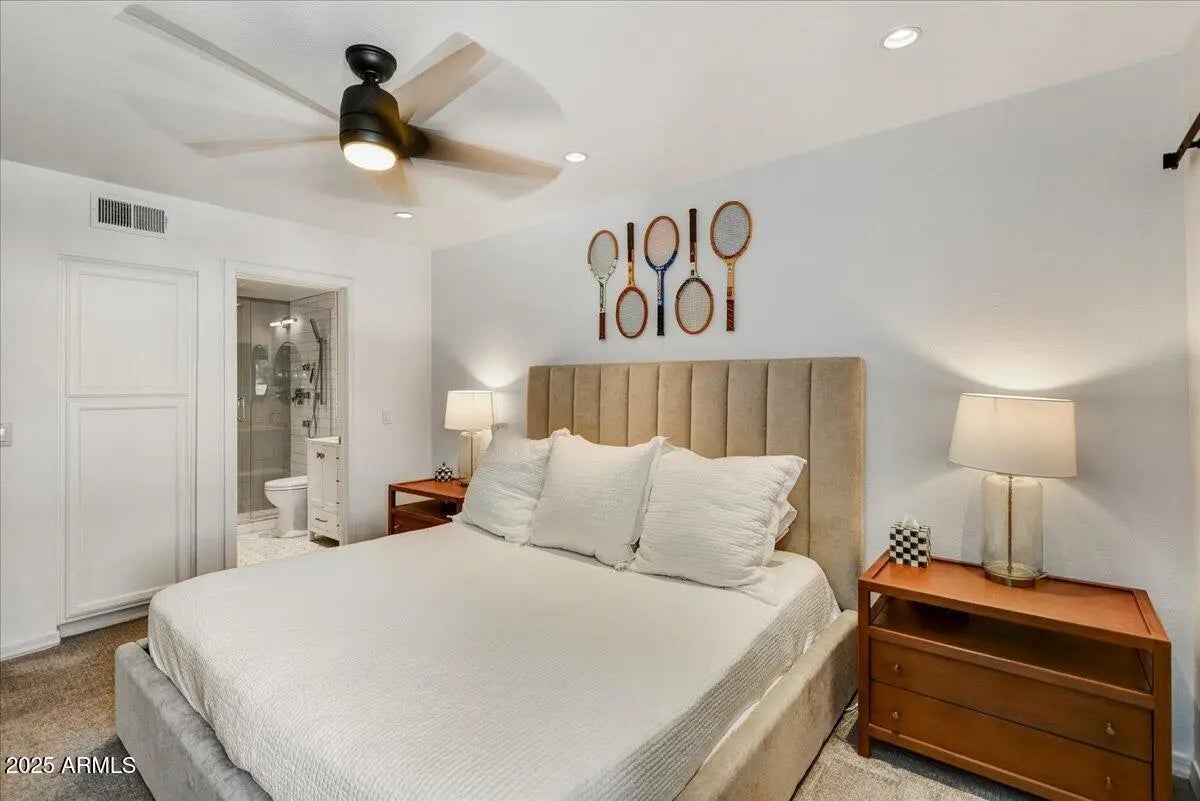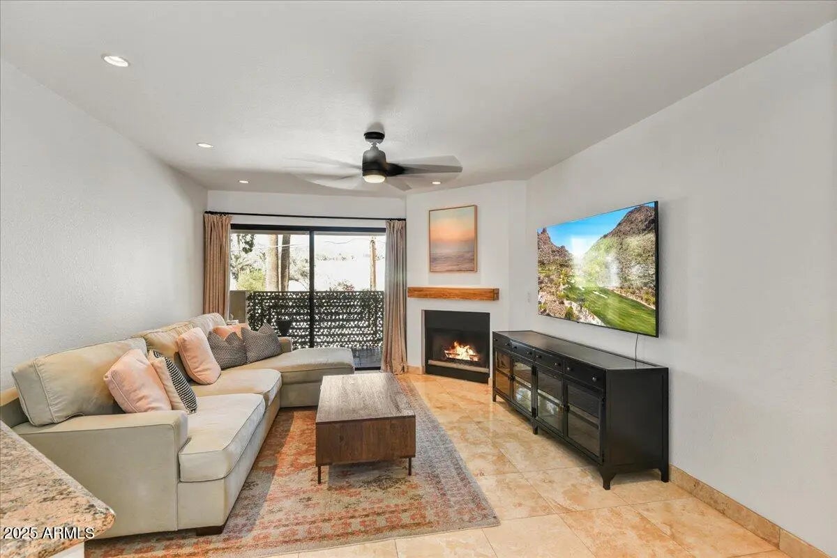 Fantastic Location in Biltmore area at 32nd & Camelback. Gated secure access with great views of Camelback Mountain and Piestewa Peak. This perfectly situated 2 bedroom, 2 bath with laundry room was partially remodeled in 2022. Gorgeous new master bath with all new tile, plumbing fixtures, glass shower enclosure, toilet, vanity and lighting. Master Bedroom and living area have sliding door access to north facing outdoor patio area with additional storage. Bedroom closets updated with barn doors. Upgraded with recessed downlights on dimmers, ceiling fans, new fireplace mantel. New carpeting and paint throughout. A/C system maintained by the HOA. Covered dedicated parking below unit. Vacant and on lockbox