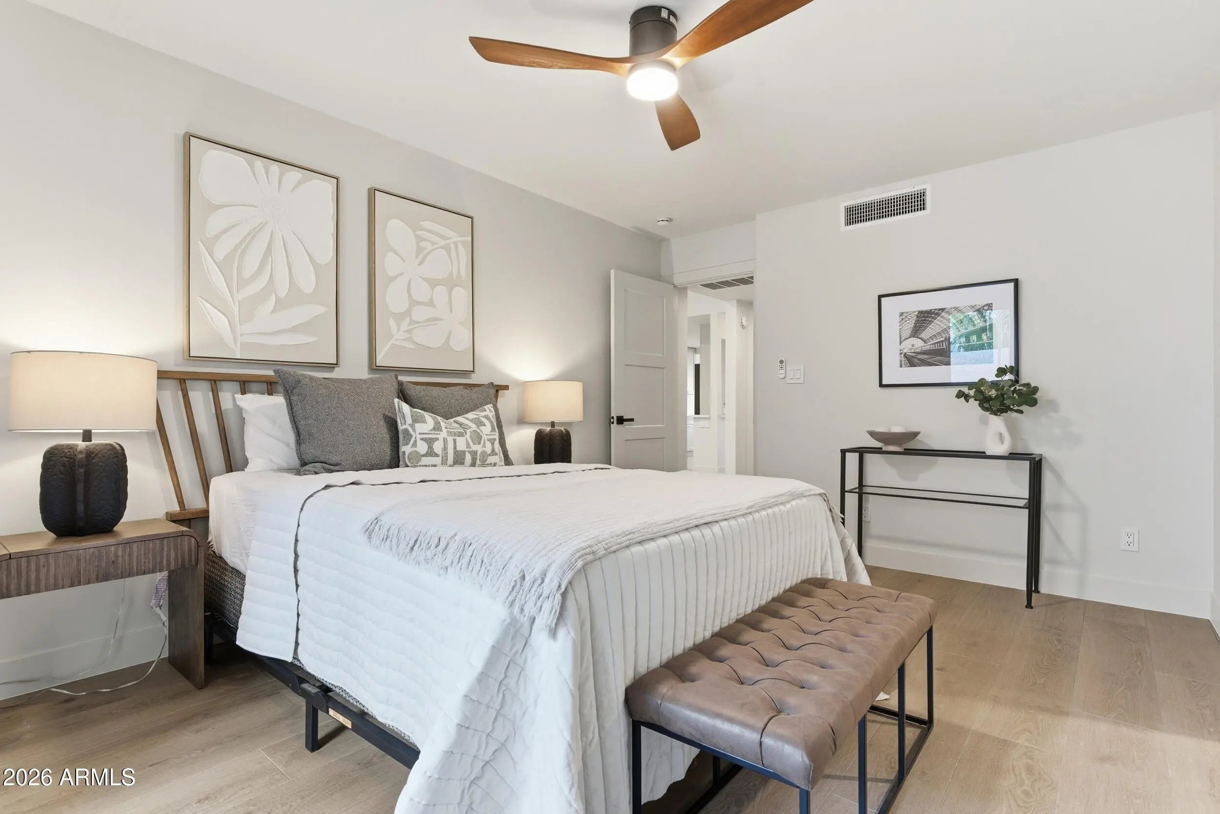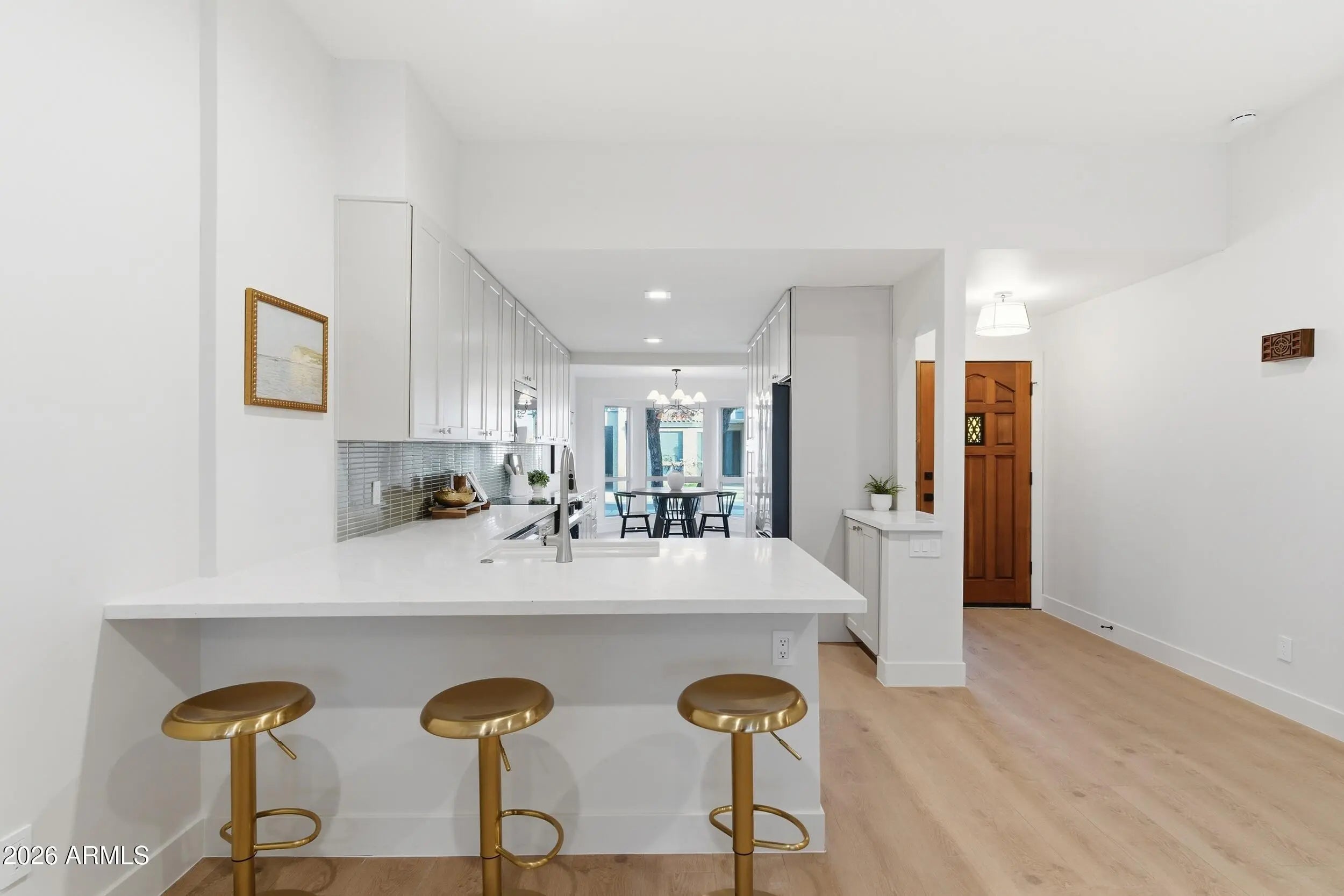 Completely remodeled Arcadia Lite patio home with nearly $100,000 in upgrades, offering a true turnkey, lock-and-leave lifestyle. Located in a charming, quiet, and intimate community, this 2-bedroom, 2-bath residence spans 1,332 square feet and feels larger thanks to dramatic 12-foot ceilings in the great room. The open-concept layout features large wood-like tile flooring throughout, smooth walls, and a stylish kitchen with taupe cabinetry, quartz countertops, and modern finishes. The expanded primary suite is a private retreat with a walk-in closet and oversized walk-in shower. Major upgrades include a new HVAC system, new hot water heater, updated interior doors, new windows, and new sliding patio doors. Enjoy a private covered back patio, attached two-car carport, and enclosed storage with washer/dryer hookups. Just ½ mile to Trevor's, Sip Coffee, Zipps, Beckett's Table, and the best of Arcadia and Biltmore dining and lifestyle destinations.