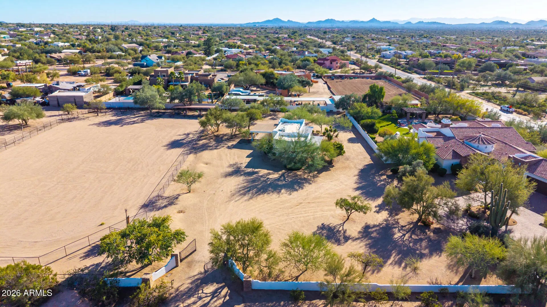 This listing is for the Main House + Guest House + Vacant Land listing only. Please see MLS#6971415 & MLS#6971383 for additional configurations for the Main House only OR the Main House + Guest House together. NESTLED on an oversized corner lot & featuring 4,666 sq ft with a stunning facade w/ tasteful stone accents, a manicured low-care landscape, a 4-car oversized garage w/ built-in cabinets, and a circular paver driveway. Come inside to discover a welcoming circular foyer, which flows seamlessly into a spacious great room showcasing high ceilings w/ exposed wood beams, a wet bar, and an impressive fireplace to keep you warm during the cold winter months. Travertine stone flooring, dazzling light fixtures, and neutral palette throughout! The gourmet kitchen is worthy of a chef, equipped w/ ample cabinetry, a walk-in pantry, granite countertops, honeycomb tile backsplash, SS appliances, and a center island w/ a breakfast bar for casual dining. The kitchen includes 2 dishwashers, 1 subzero refrigerator, and 1 Wolf double oven. If you like entertaining, you will love the dining area that is conveniently located off the kitchen where you can enjoy formal meals with family or friends in style. You'll be amazed by the grand master bedroom, with plush carpet, a huge walk-in closet with built-in shelving and washer & dryer hookups, a 2nd fireplace, and a lavish ensuite bathroom w/ dual vanities, a large tiled shower, plus a jetted tub. The secondary bedroom can be used as a mother-in-law suite or second master bedroom with a separate entrance to the backyard with its own private bathroom as well as a dry bar. The remaining 2 bedrooms are ample size with their own private bathrooms. There is a separate laundry room inside with plenty of storage and a utility sink. Outside, you will find a huge resort-style backyard includes a covered travertine patio & decking, extended seating areas, nice size grassy area for outdoor sports, a built-in BBQ area, a lovely pergola, a sparkling blue pool, and a refreshing spa. Separate guest house included in this listing features 2-bedrooms, 2-bathrooms, 2-carport spaces, plus its very own living room and kitchen w/ blue glazed tile countertops and Saltillo tile throughout. There is paver parking under the carport. The washer & dryer will convey. Interior paint (2024) & exterior paint (2026). The backyard is very spacious and is adjacent to the main house to the west & vacant land to the east. A designated septic system is included with the guest house. The vacant land included in this listing features the roping arena, a 3-stall mare motel, and (4)- 40 x 40 horse pens (turn-outs) for horses! The main house includes 4,666 square feet APN# is 211-44-070-C. The guest house includes 1,160 square feet APN# is 221-44-070-B. The vacant land includes 2.318 acres APN# is 221-44-059-A. All three MLS#6971325, 6971383, and 6971415 must be sold as specified on MLS. No portion of the listing can be sold separately other than the main house.