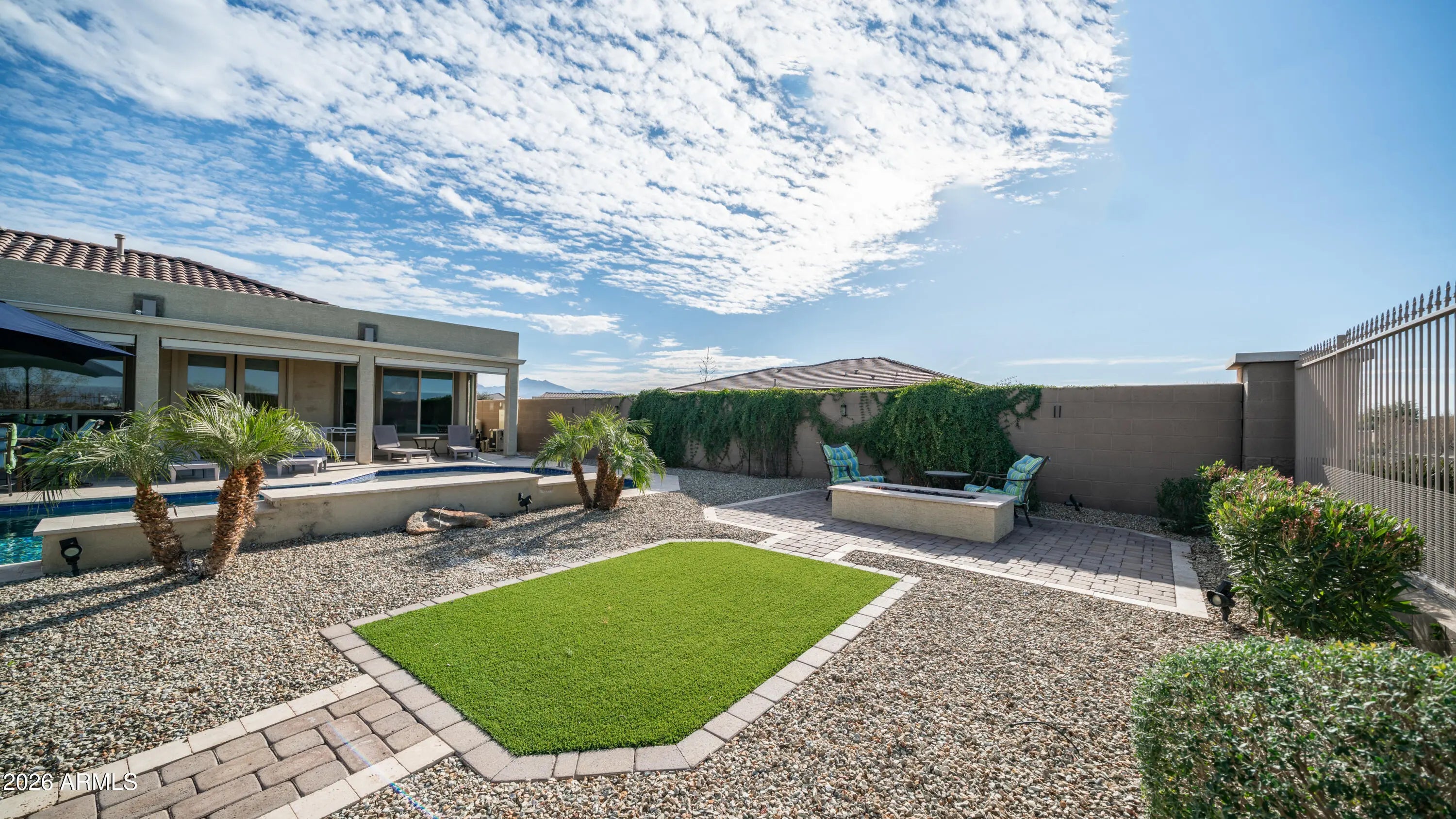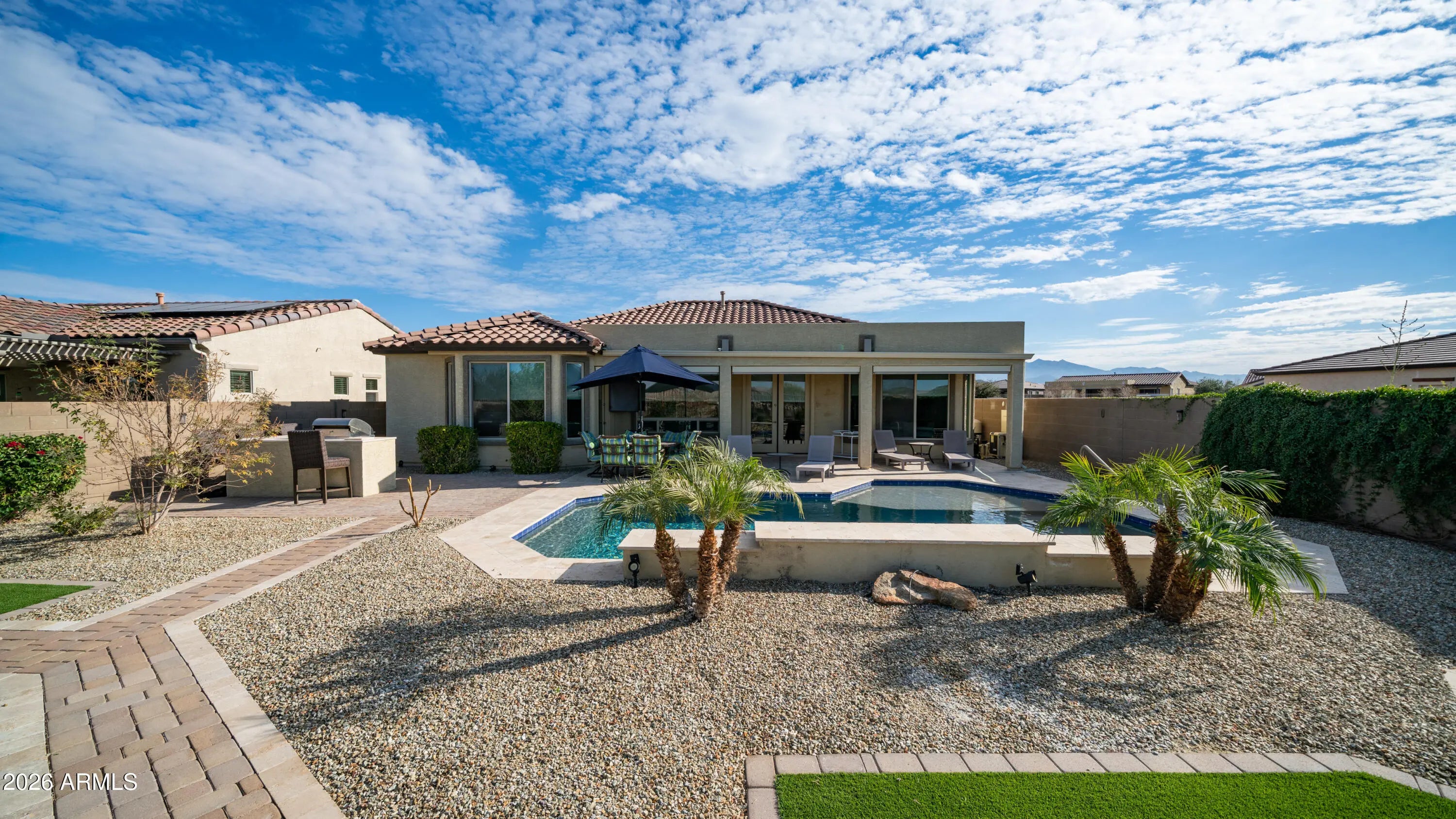This is THE ONE. Welcome to Cantamia, an award-winning, master-planned, gated community offering resort-style living under Arizona's 300+ days of sunshine. Nestled against the stunning Estrella Mountains, this highly upgraded home sits on a premium oversized end lot with panoramic mountain views and a true resort-style backyard. Designed with timeless style and an exceptional open-concept floor plan, the home features a split 2-bedroom layout plus a versatile flex space ideal for an office, den, or 3rd bedroom. High ceilings, abundant natural light, and a neutral palette create an immediate sense of warmth and comfort. The primary suite offers backyard access, dual vanities, a spacious walk-in shower, and a large walk-in closet. The chef's kitchen shines with a large center island, rich espresso cabinetry, granite countertops, elegant tile backsplash, and top-of-the-line stainless steel appliances including a double oven. The backyard is an entertainer's dream with a sparkling PebbleTec heated pool featuring a Baja shelf and waterfall, built-in outdoor kitchen, gas fire pit, oversized covered patio with automatic sunshades, travertine decking, and lush desert landscaping. Every detail impresses, from the custom front entry door and pristine landscaping to the epoxy-floored garage with abundant cabinetry. Enjoy Cantamia's unmatched amenities including lakes, pickleball and tennis courts, fitness center, clubs, classes, and a 29,000-sq-ft Village Center. Your oasis awaits.