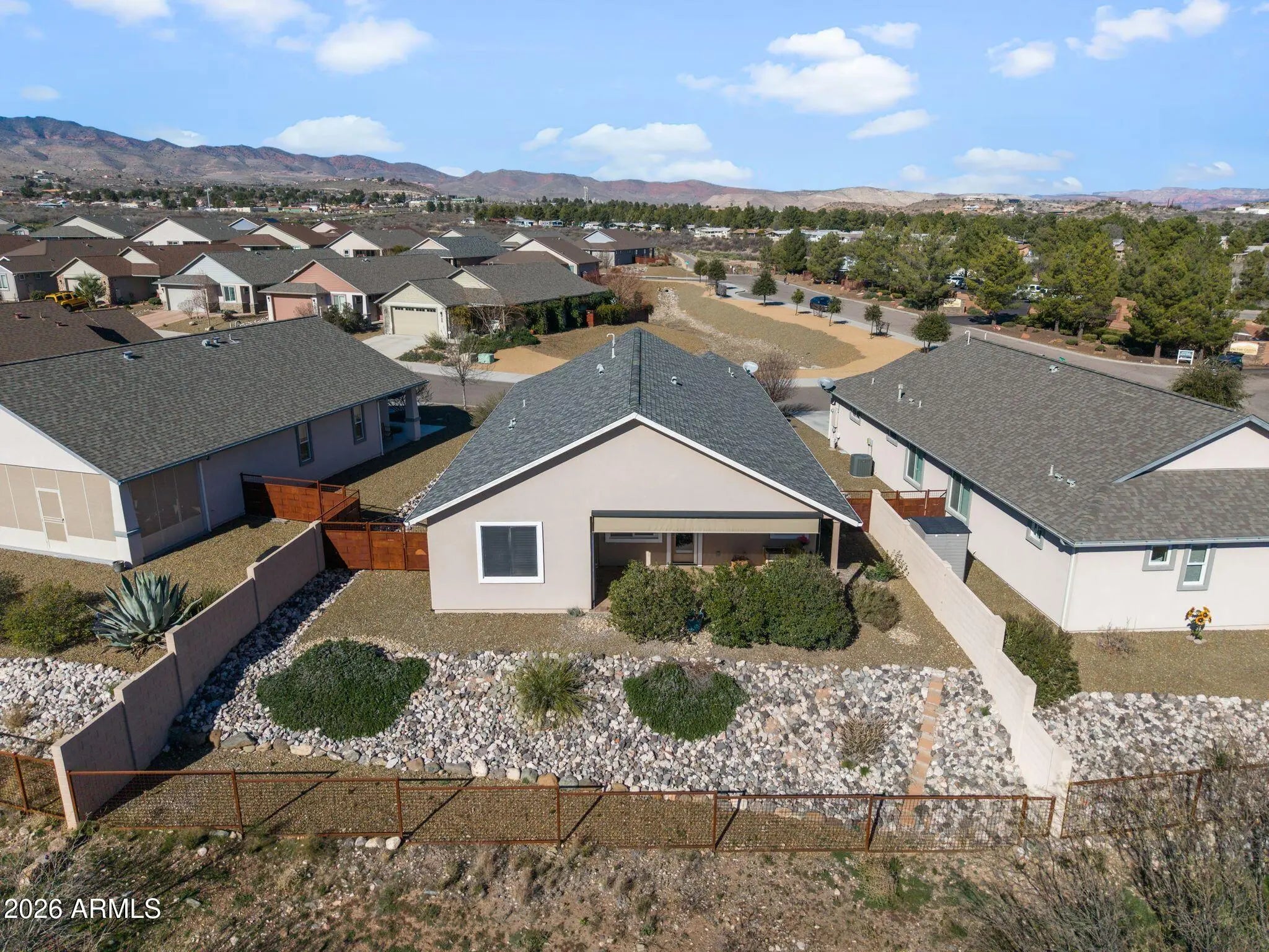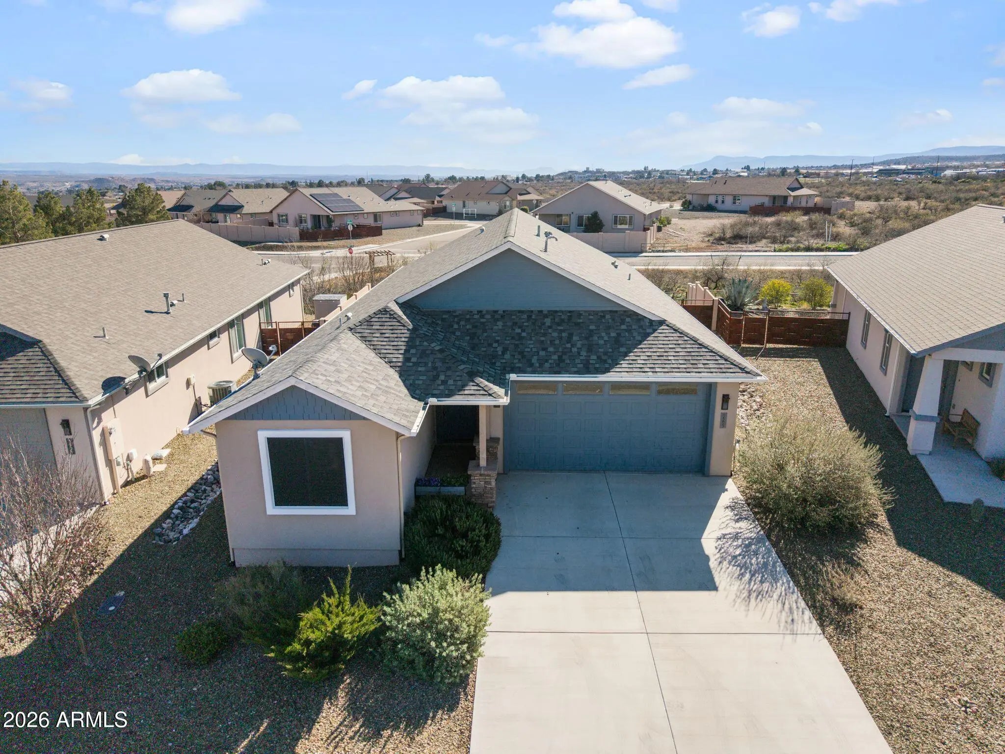 Immaculate and move-in ready, this upgraded 3-bed, 2-bath home offers modern comfort and energy efficiency in a desirable location. The open layout features vinyl plank flooring, upgraded carpet, wood shutters, and honeycomb blinds. The kitchen includes granite countertops, soft-close cabinets, a walk-in pantry, center island, and upgraded gas range. The primary suite offers patio access, dual vanities, a tiled walk-in shower, and a walk-in closet. Enjoy a tiled covered patio with ceiling fans, a shade screen, mature landscaping, and planter boxes. Additional features include screen doors, attic surge protection, and a 2-car garage. Located just minutes from Old Town Cottonwood, near dining, wineries, golf, and trails. Outdoor living shines with a tiled back patio featuring two ceiling fans with lights, a remote-controlled privacy/shade screen with lifetime warranty, mature privacy shrubs, a security screen door from the primary suite, and a planter box ready for seasonal flowers. Additional highlights include screen doors on front and back entries, a whole-home attic surge protector, and a deep two-car garage with ceiling-mounted storage.. Residents enjoy scenic high-desert surroundings, over a mile of walking trails, and proximity to a public golf course, shopping, dining, medical services, and local wineries.