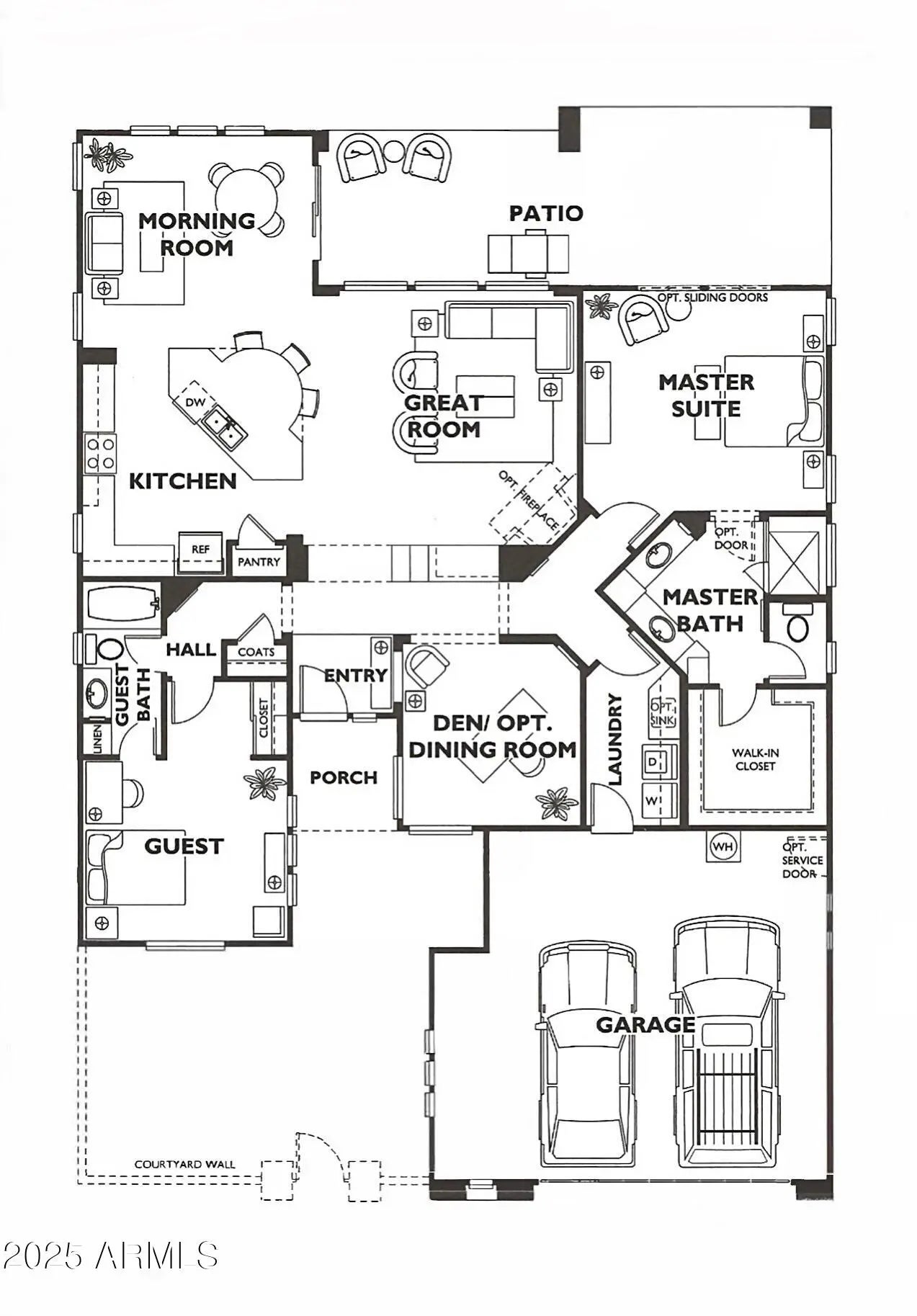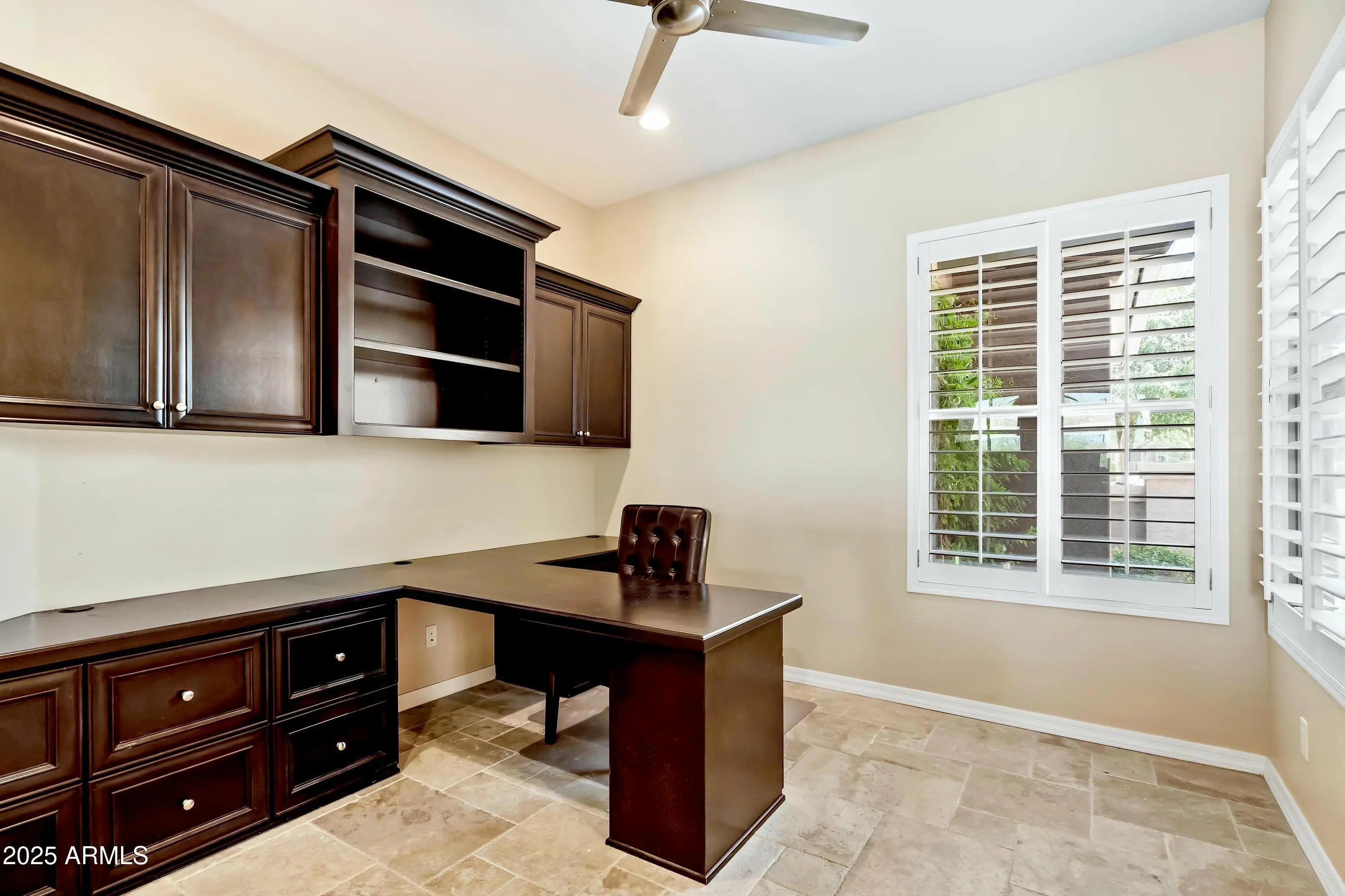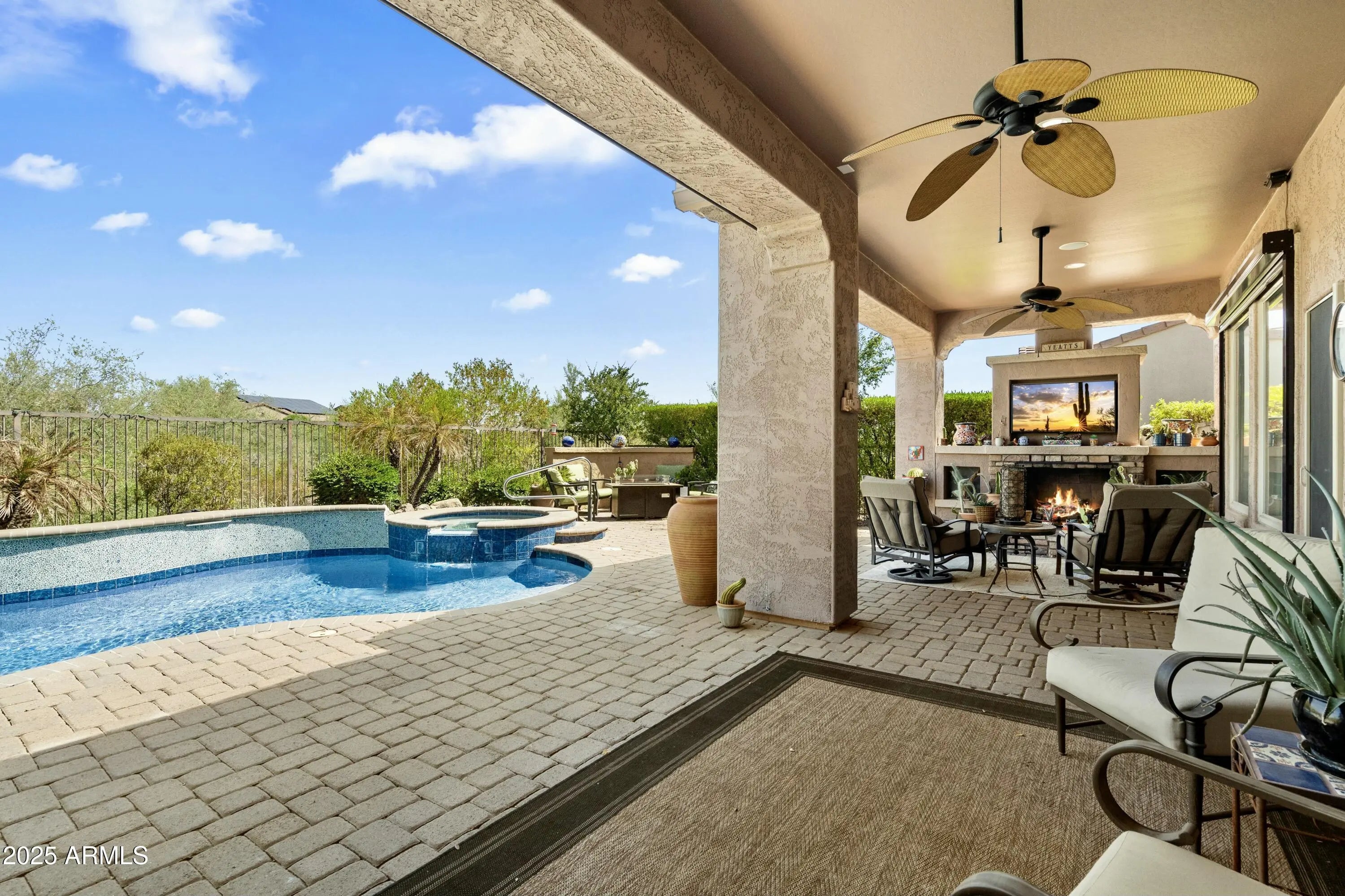 Spectacular Libertas floor plan backing pristine desert wash with a heated and cooled pool! Mature landscaping grace front and back yards with a luxurious cobblestone courtyard to welcome guests. The resort-style backyard boasts a fully equipped built-in BBQ, 400 sq ft of covered patio, an outdoor fireplace, ceiling fans & automatic sunshades. Designer travertine tile and rich hardwood flooring throughout. The gourmet kitchen features granite countertops with premium stainless-steel appliances. Custom plantation shutters accent every room for enhanced privacy and elegance. The temperature-controlled garage features high-end epoxy floors with a pop-out for extra storage & workstation. Enjoy living in a 55+ resort-style community with championship golf and country club amenities! OUTDOOR PARADISE: - Private courtyard with pavers, fountain, and new decorative wrought iron gate - Gorgeous fountain entrance with lush ferns and vine - Motorized outdoor shades for year-round comfort - Solar-heated and cooled Pebble-Tec pool with spillover spa - Built-in gas BBQ with rotisserie burner and dual storage drawers - Stone gas fireplace with new gas log set and built-in TV unit - Motorized sunshade and surround sound system - Extended paver patio and artificial turf - Landscape boulders and brand new irrigation system - Control unit for pool/jacuzzi operations DESIGNER INTERIOR: - Gorgeous travertine tile flooring throughout main areas - Hardwood floors in bedrooms - Custom built-ins in the den/office, guest bedroom, and great room - Electric fireplace in the great room with decorative tile hearth - Zebra sheer roller shades and plantation shutters throughout - Southwest blinds and ceiling fans - Recent interior painting GOURMET KITCHEN: - Granite slab countertops with rich, staggered cabinetry - Luxury stainless-steel appliance package - Built-in appliances including new microwave - Kinetico reverse osmosis water system - Menmax ice maker PREMIUM GARAGE & UTILITY: - 2-car garage with 4-foot bump-out extension - New split HVAC for climate control - Epoxy flooring with wall-mounted built-in cabinets - Custom built-in workstation - Loew's washer and dryer - Utility sink ADVANCED SYSTEMS & TECHNOLOGY: - Solar panel system for energy efficiency - New HVAC system - New water heater - New Kinetico water softener system - New Reverse osmosis system - Smart pool/jacuzzi control unit