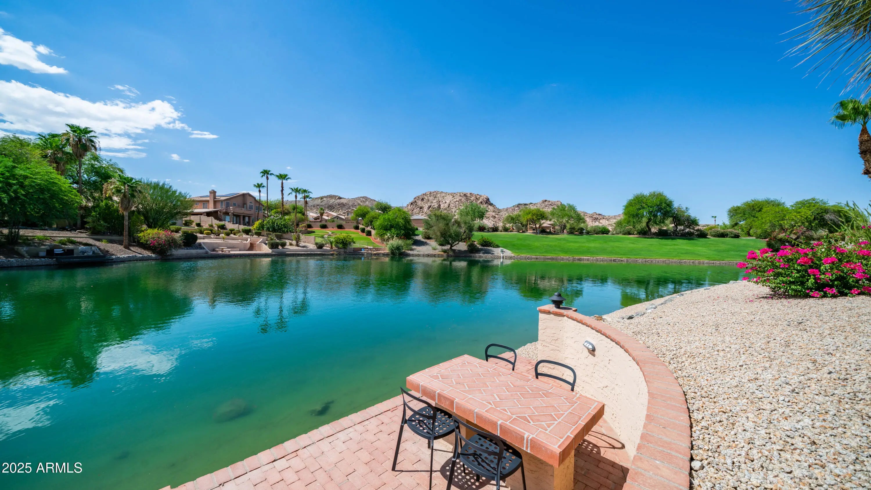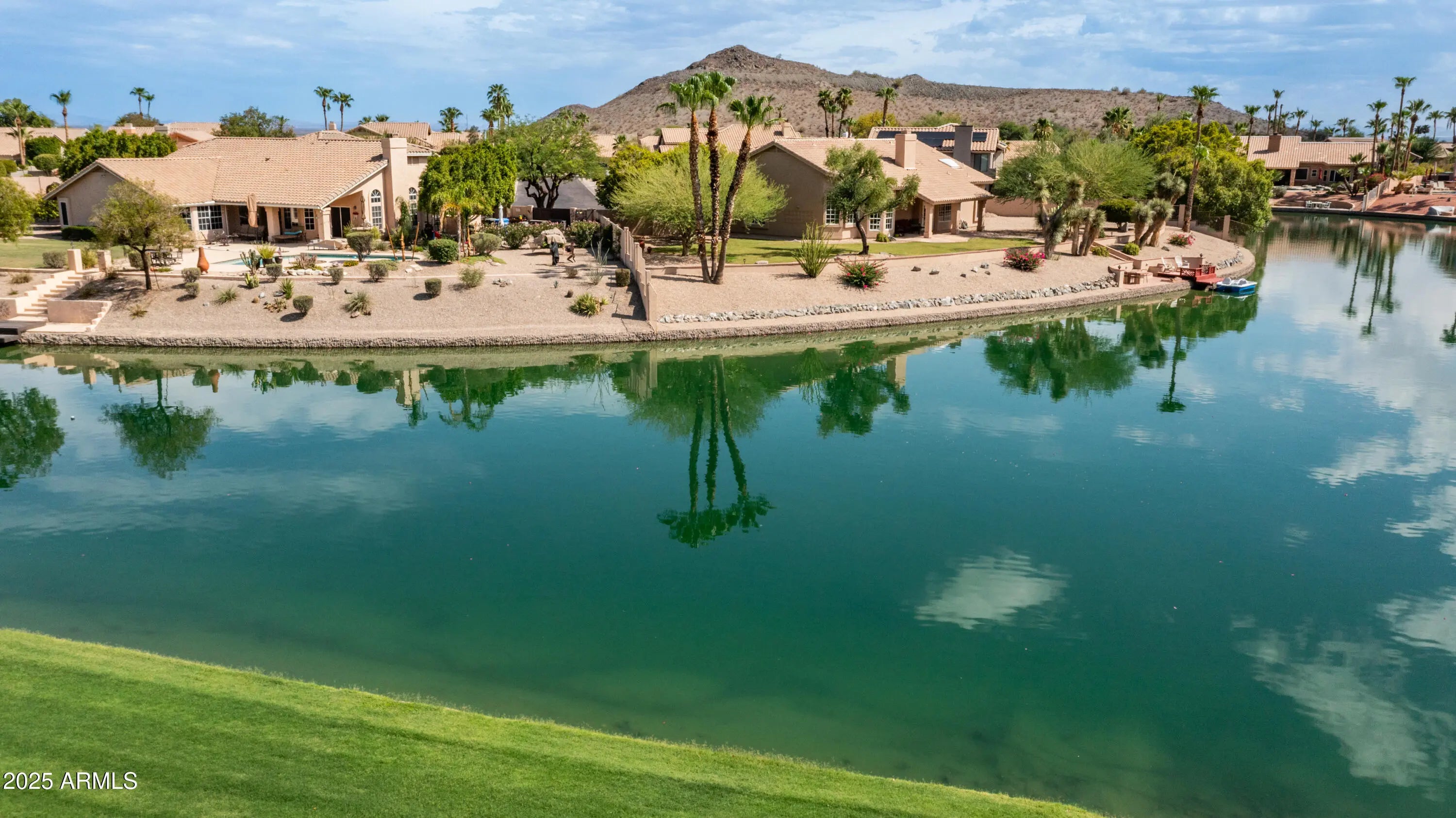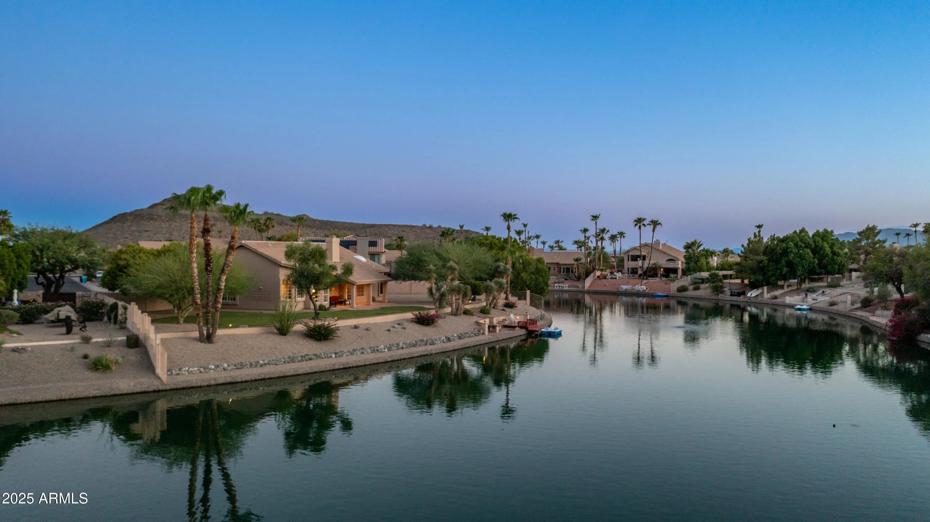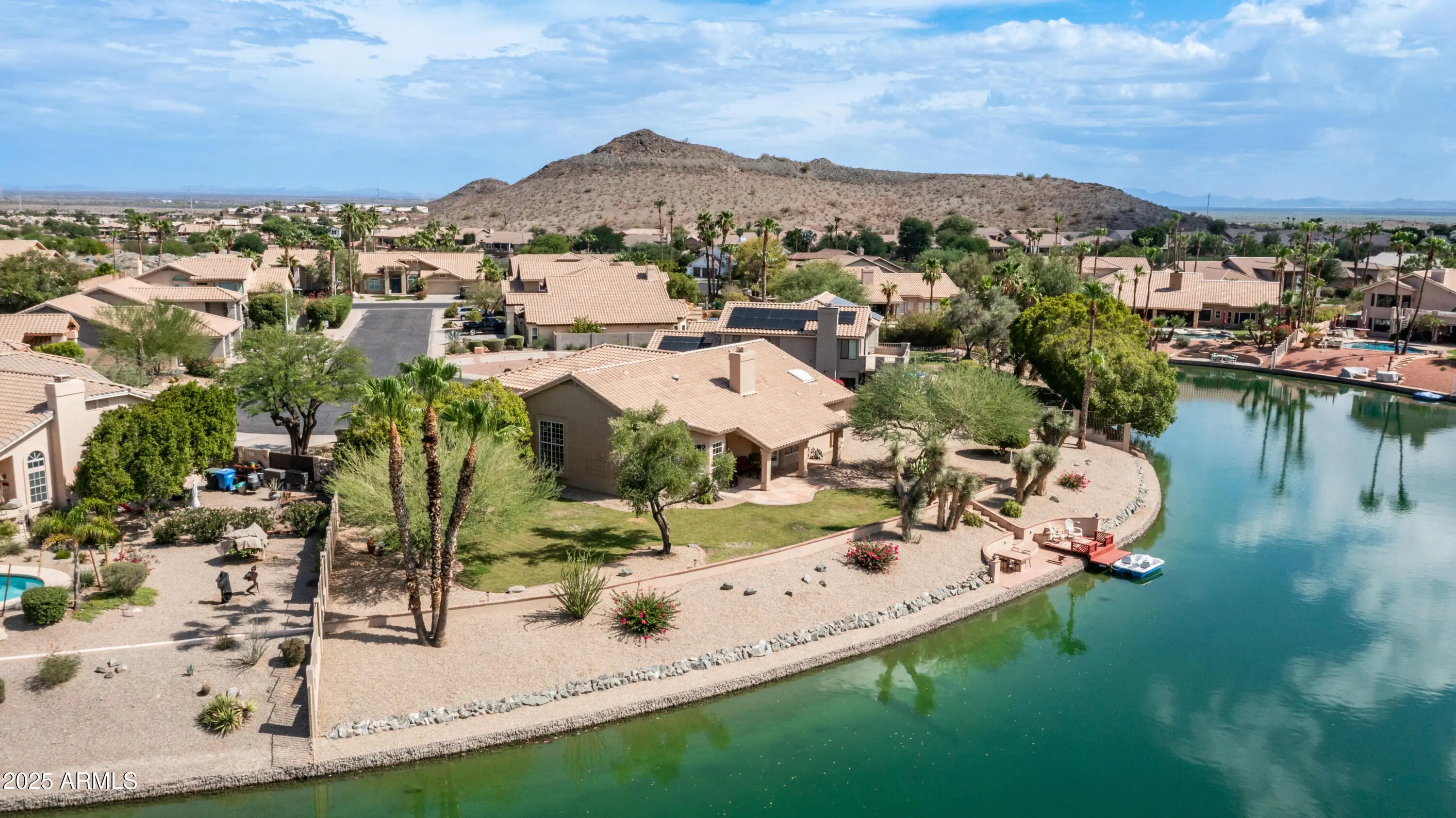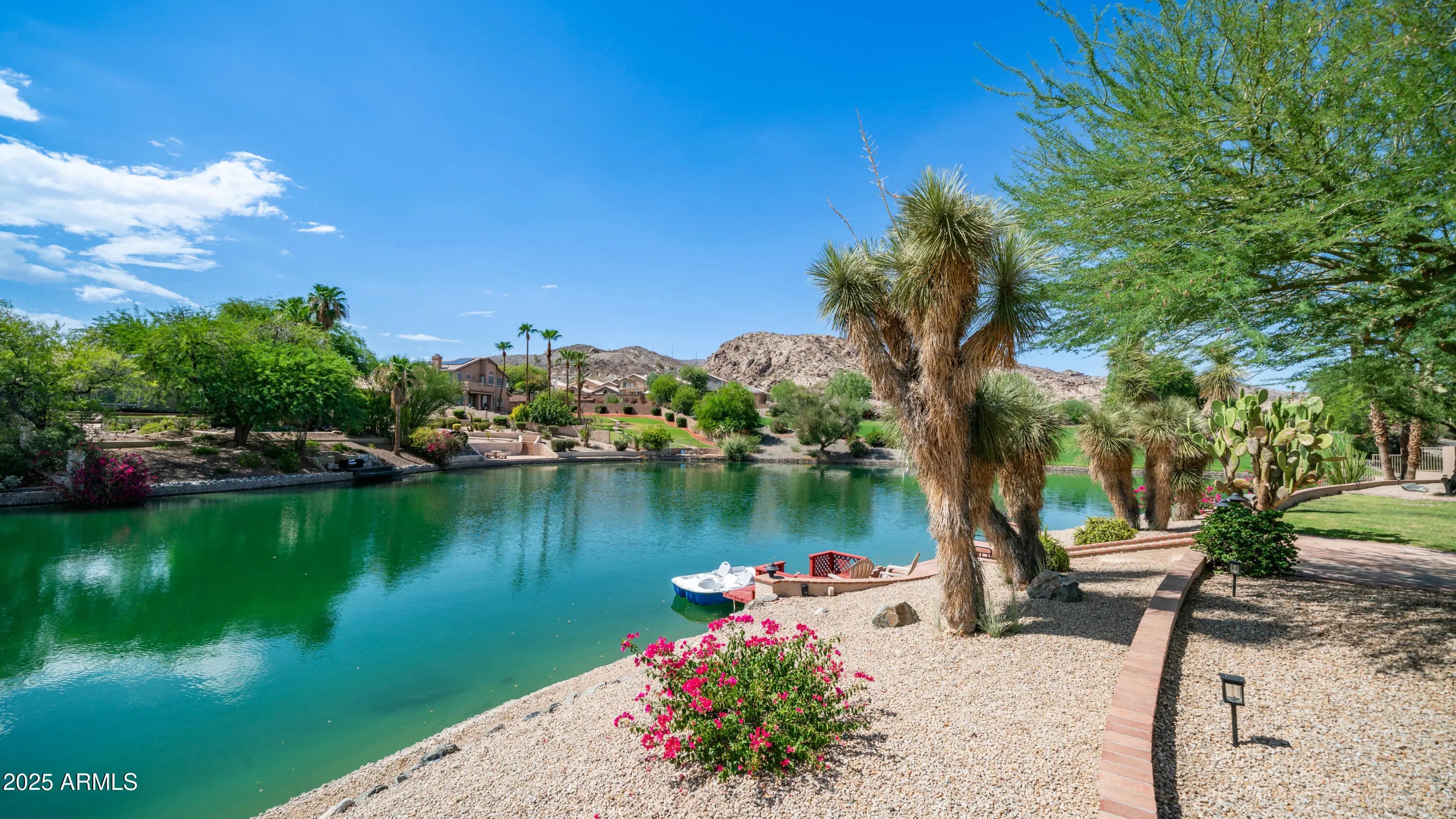 Discover a once-in-a-lifetime opportunity to own one of the largest lakefront lots in Canyon Springs. This exceptional single-story home is immaculately maintained and nestled on an expansive cul-de-sac lot, offering serene waterfront views, unmatched privacy, and exclusive access to a lakeside lifestyle. Step outside to your private dock, complete with a fire pit and a pedal boat, providing effortless access to tranquil waters and the ultimate lake experience. Enter a world of luxury and comfort in this thoughtfully designed home. Neutral tile floors flow seamlessly through the main living areas, while plush carpeting adds warmth to select spaces. The heart of the home features an updated kitchen that dazzles with custom cabinetry, gleaming Corian countertops, and a spacious island with abundant storageperfect for casual dining or sophisticated entertaining. The primary suite serves as a private retreat, offering direct access to the backyard and an updated bathroom that boasts custom cabinetry, dual vanities, sleek countertops, and a spa-like oversized shower. The fully outfitted custom closet combines thoughtful organization with elevated design, blending form and function effortlessly. Two generously sized secondary bedrooms and an updated secondary bath, featuring a custom tiled shower and ample storage, ensure comfort for family or guests. Additional features include a large laundry room and a spacious 3-car garage, complete with cabinets and fresh epoxy-coated floors. 3rd bedroom is currently being used as a den. Pictures are virtually staged. Enjoy stunning lakefront views and incredible mountain scenery in the highly sought-after Ahwatukee Foothills area.