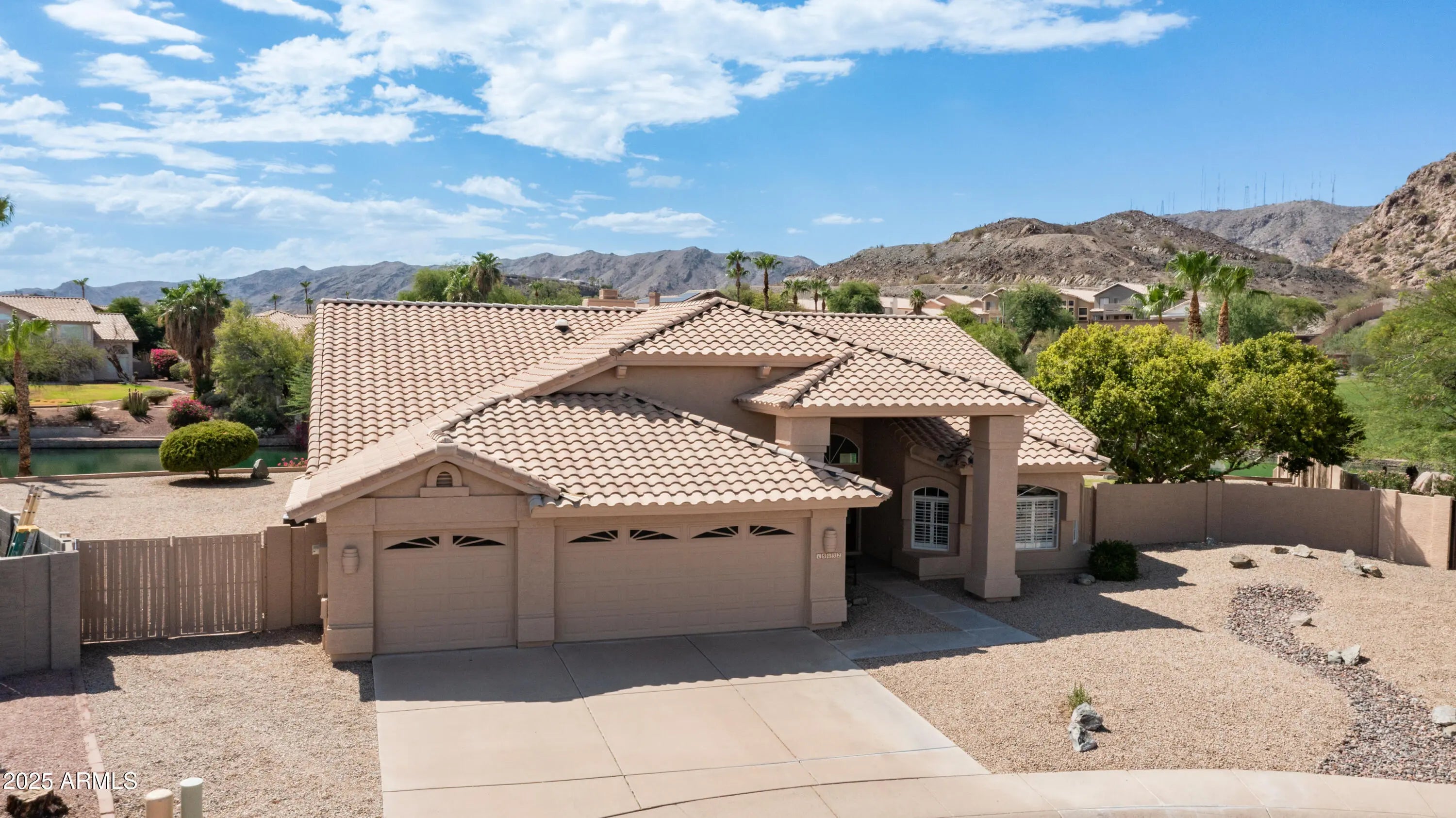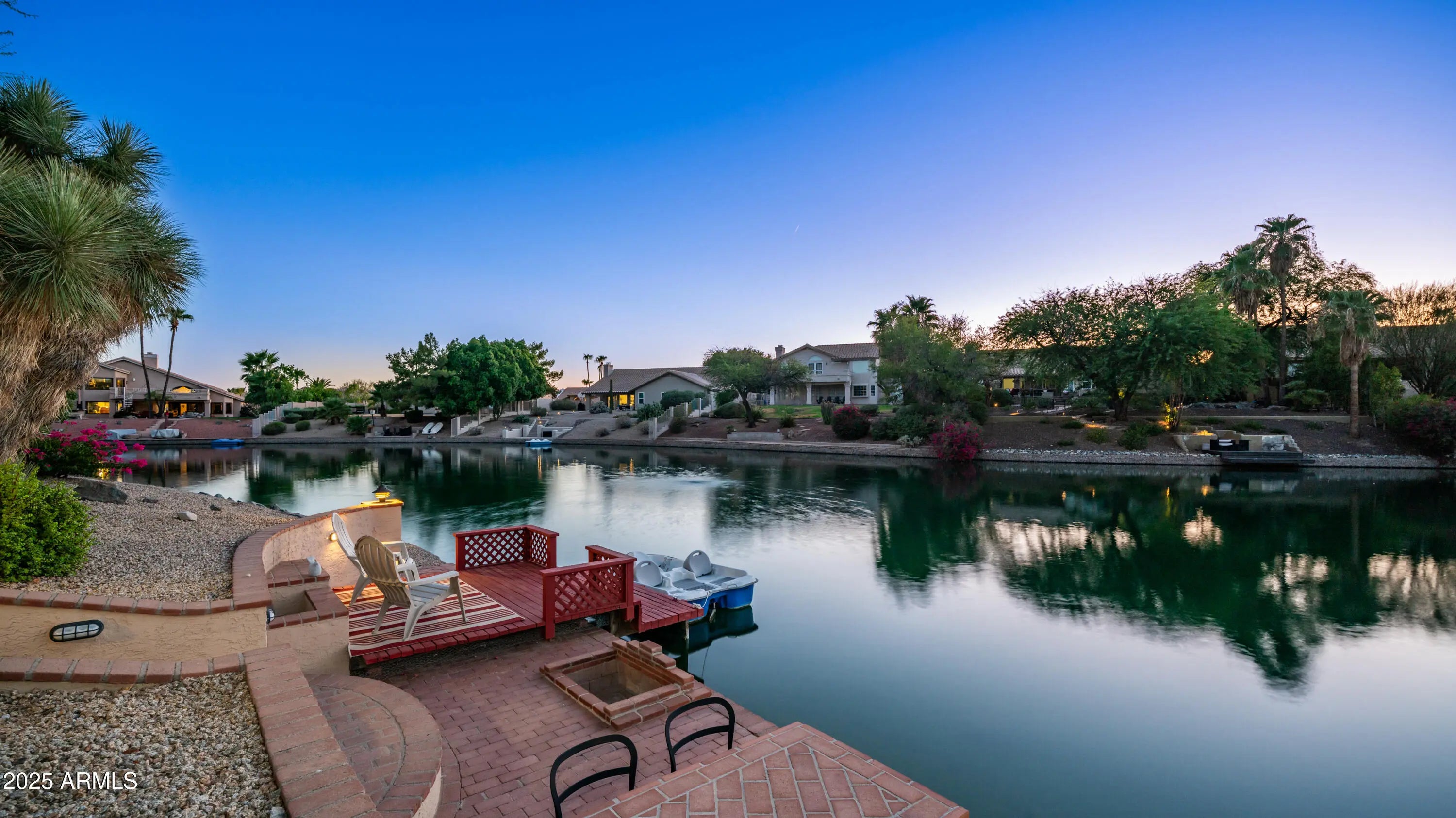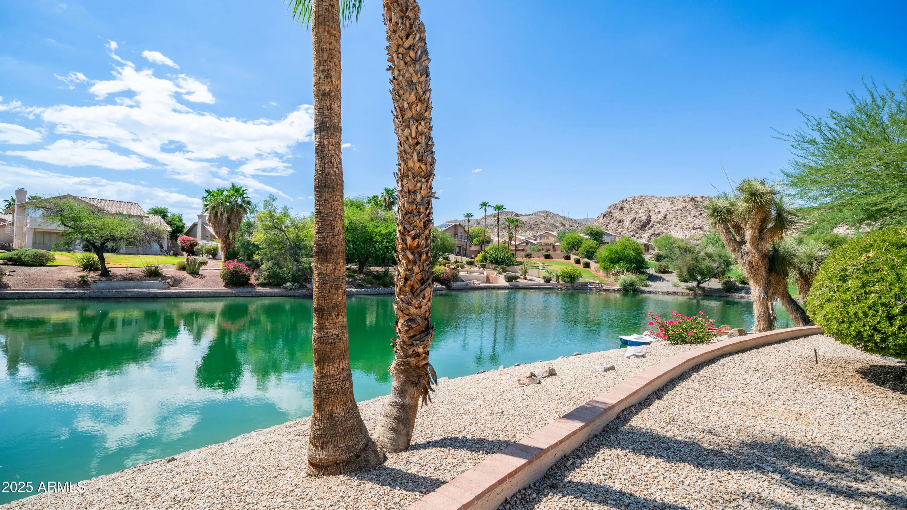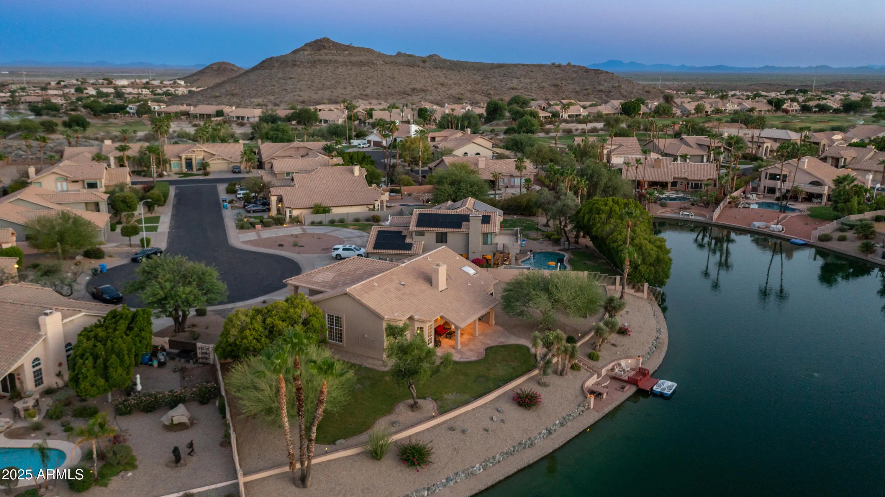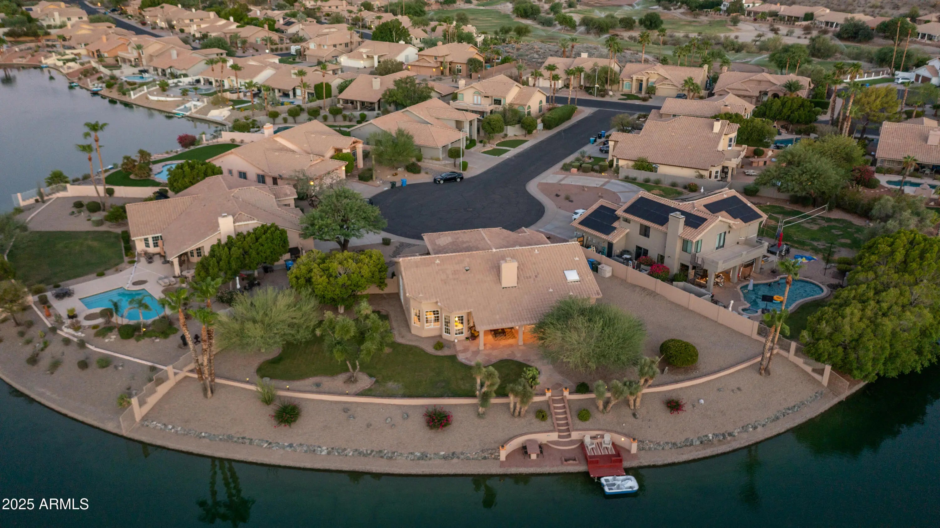 Discover a once-in-a-lifetime opportunity to own one of the largest lakefront lots in Canyon Springs. This exceptional single-story home is immaculately maintained and nestled on an expansive cul-de-sac lot, offering serene waterfront views, unmatched privacy, and exclusive access to a lakeside lifestyle. Step outside to your private dock, complete with a fire pit and a pedal boat, providing effortless access to tranquil waters and the ultimate lake experience. Enter a world of luxury and comfort in this thoughtfully designed home. Neutral tile floors flow seamlessly through the main living areas, while plush carpeting adds warmth to select spaces. The heart of the home features an updated kitchen that dazzles with custom cabinetry, gleaming Corian countertops, and a spacious island with abundant storageperfect for casual dining or sophisticated entertaining. The primary suite serves as a private retreat, offering direct access to the backyard and an updated bathroom that boasts custom cabinetry, dual vanities, sleek countertops, and a spa-like oversized shower. The fully outfitted custom closet combines thoughtful organization with elevated design, blending form and function effortlessly. Two generously sized secondary bedrooms and an updated secondary bath, featuring a custom tiled shower and ample storage, ensure comfort for family or guests. Additional features include a large laundry room and a spacious 3-car garage, complete with cabinets and fresh epoxy-coated floors. 3rd bedroom is currently being used as a den. Pictures are virtually staged. Enjoy stunning lakefront views and incredible mountain scenery in the highly sought-after Ahwatukee Foothills area.