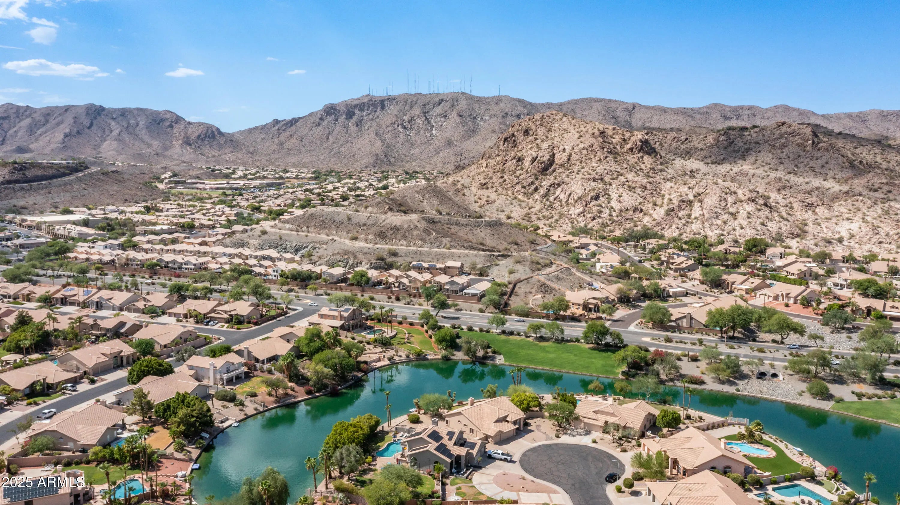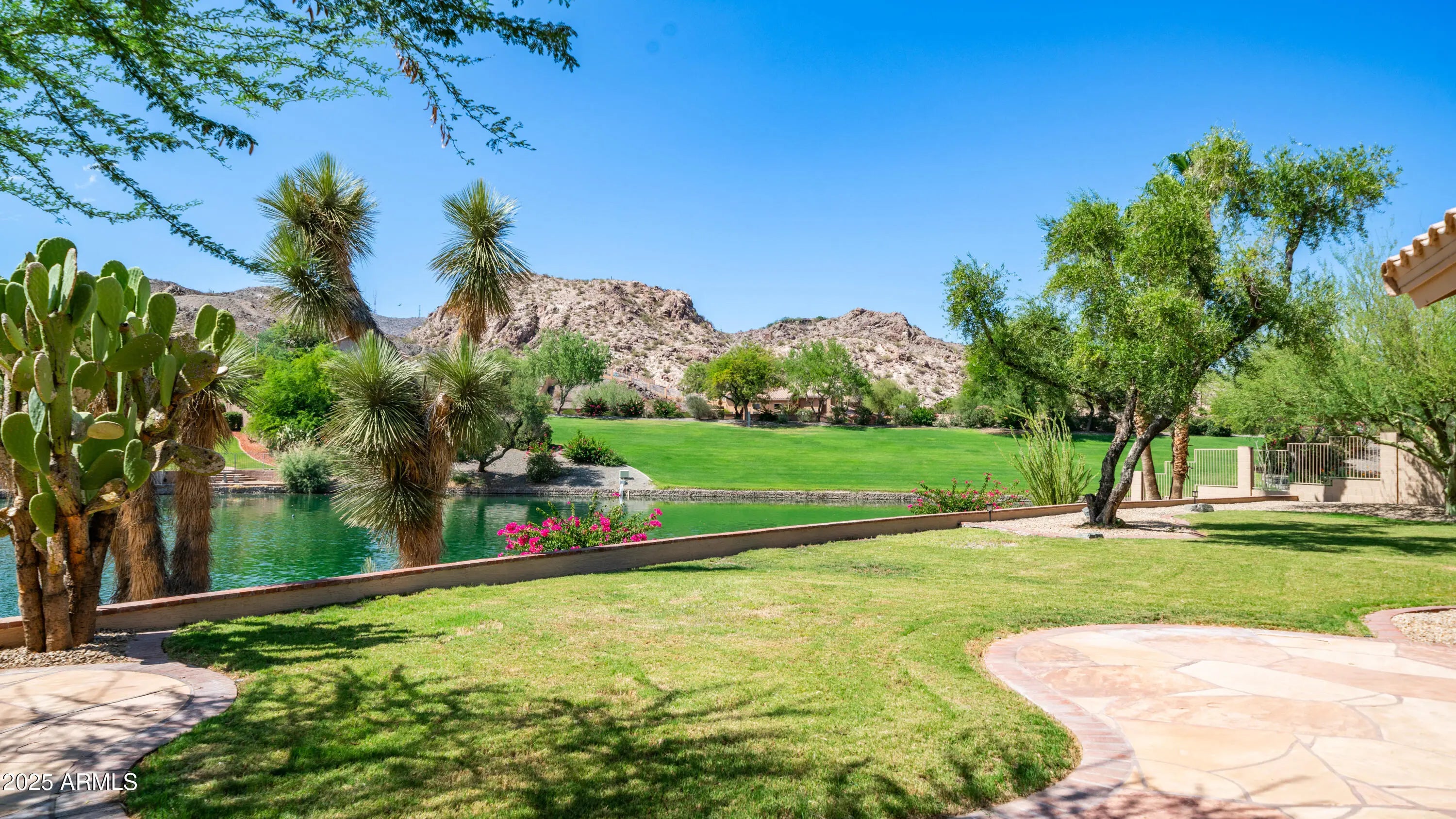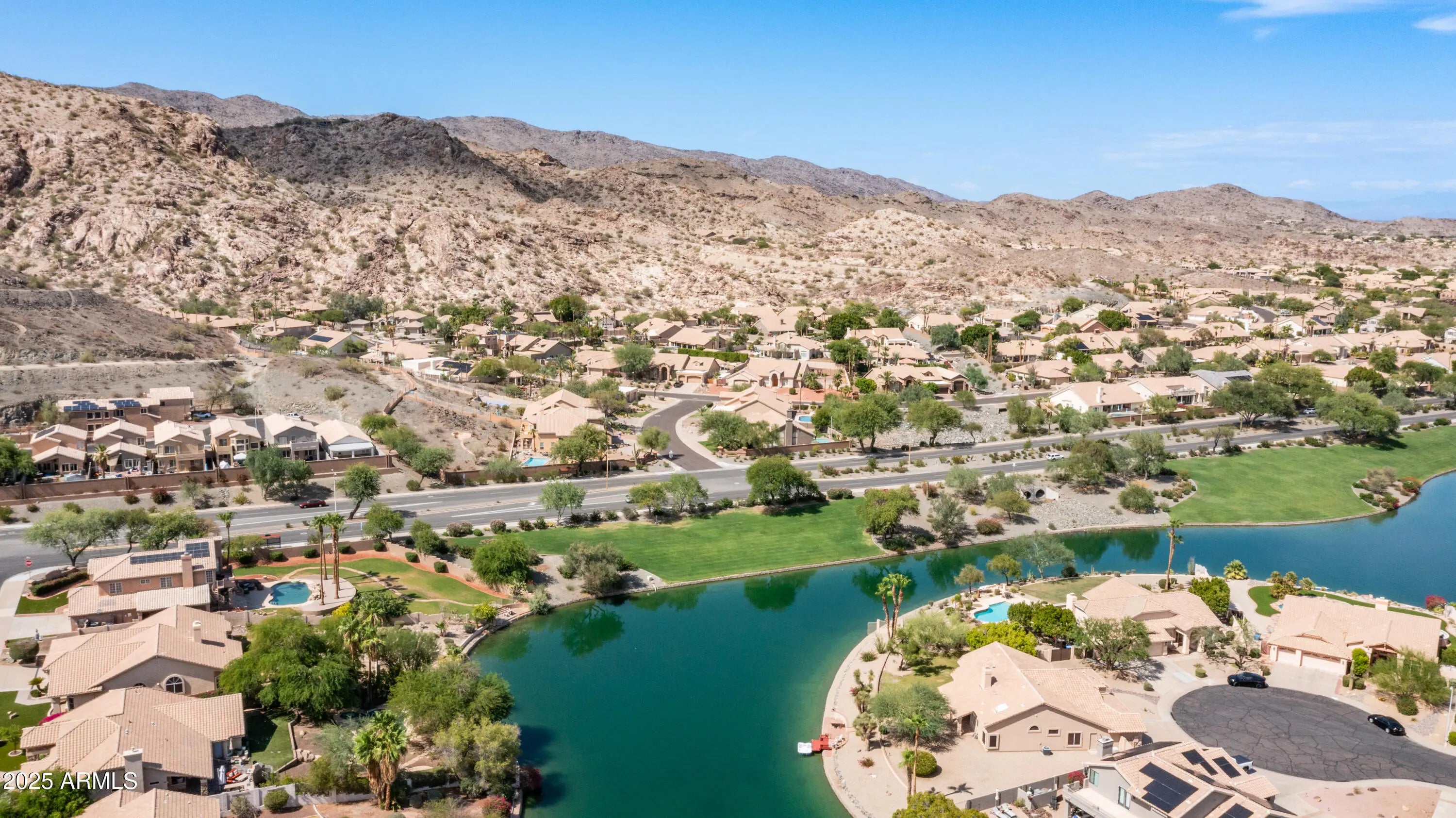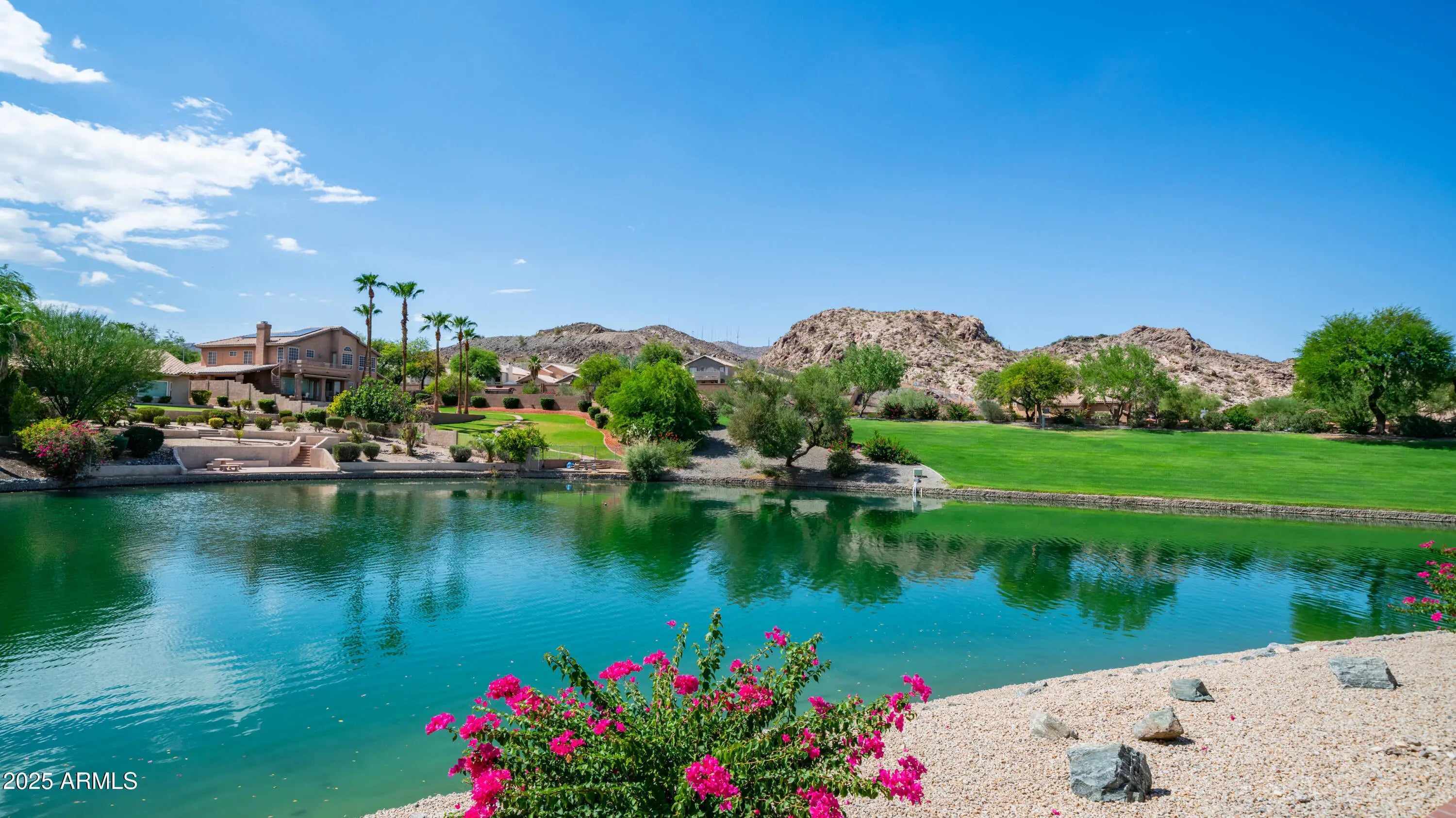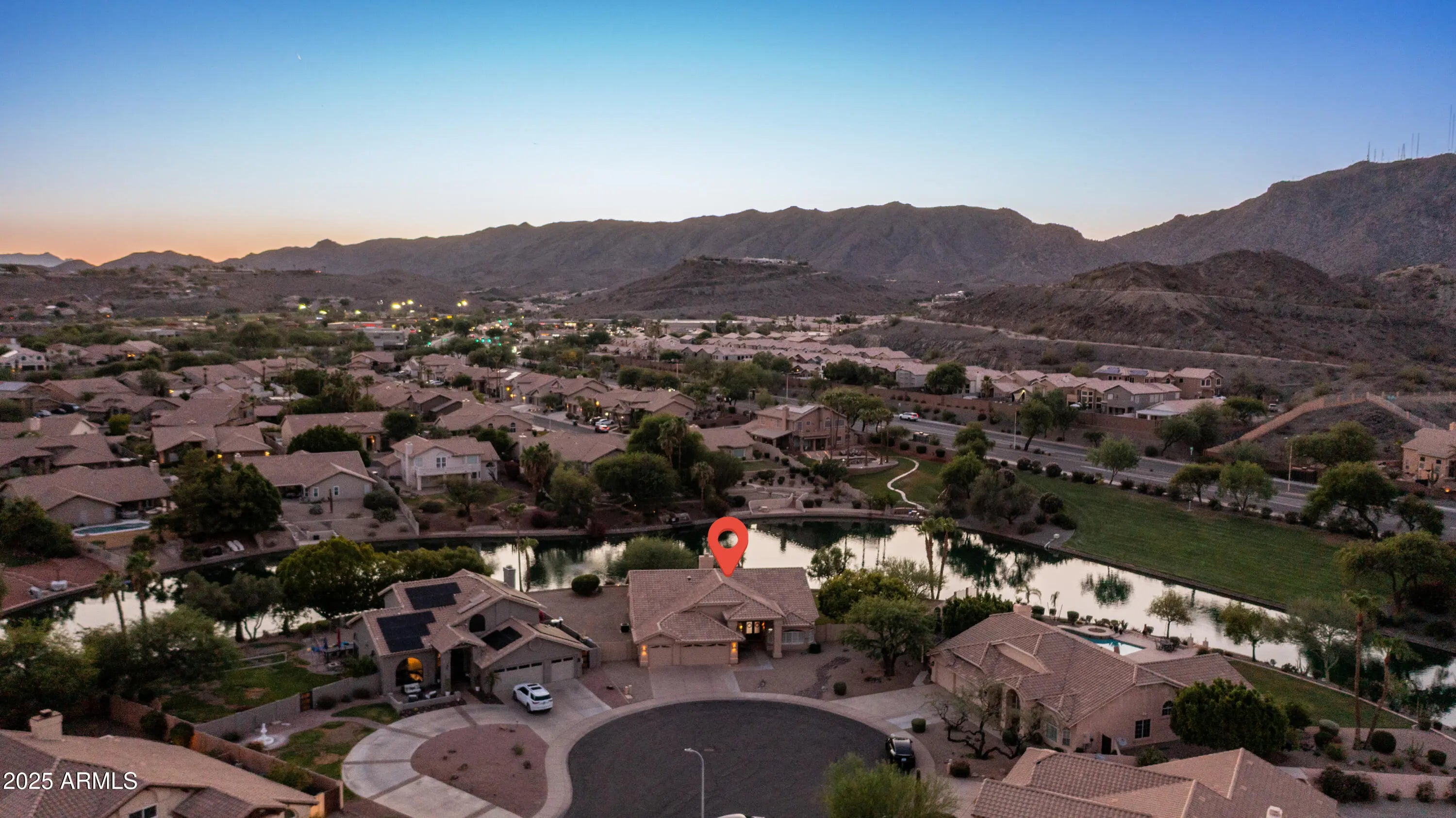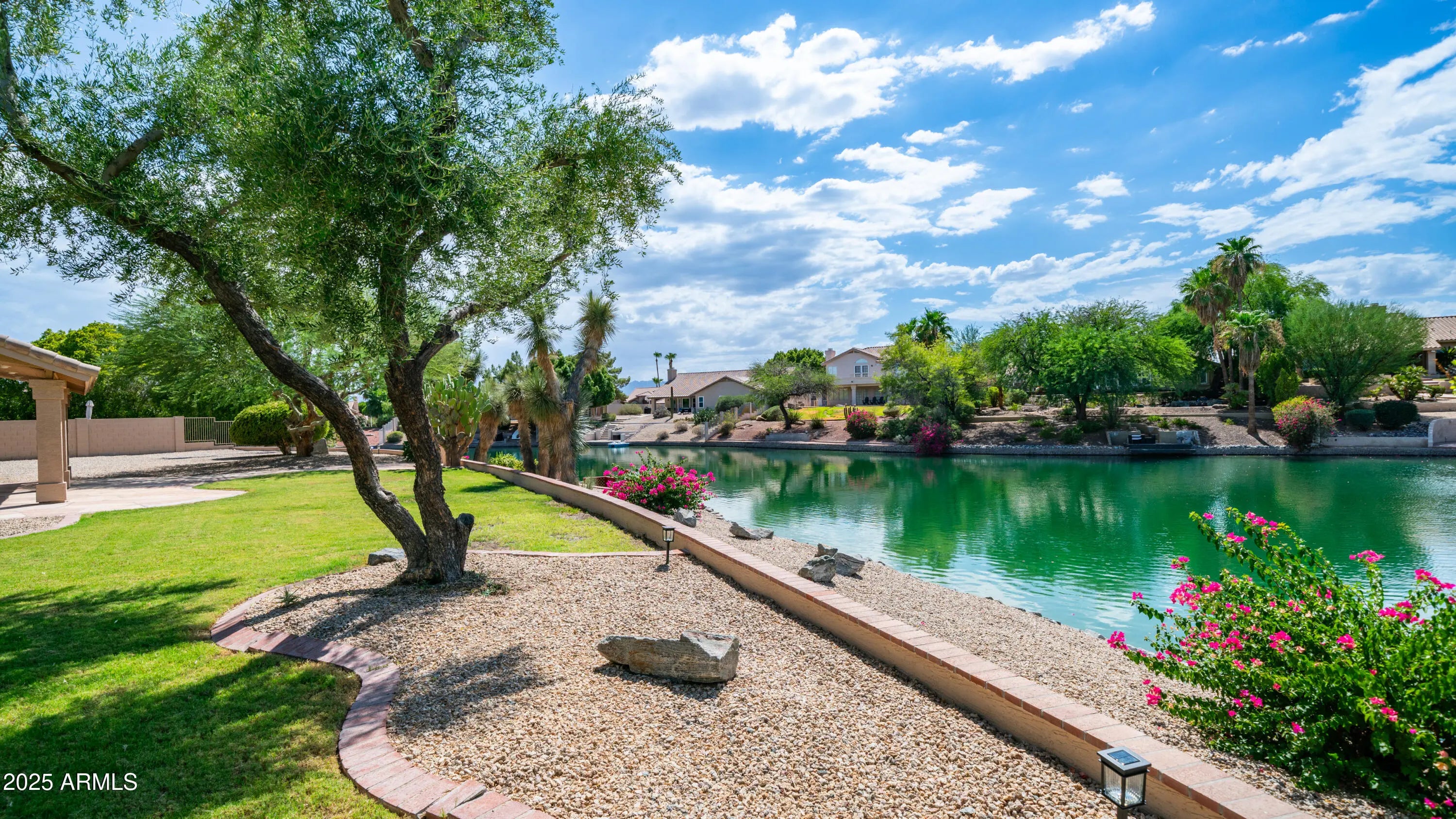 Discover a once-in-a-lifetime opportunity to own one of the largest lakefront lots in Canyon Springs. This exceptional single-story home is immaculately maintained and nestled on an expansive cul-de-sac lot, offering serene waterfront views, unmatched privacy, and exclusive access to a lakeside lifestyle. Step outside to your private dock, complete with a fire pit and a pedal boat, providing effortless access to tranquil waters and the ultimate lake experience. Enter a world of luxury and comfort in this thoughtfully designed home. Neutral tile floors flow seamlessly through the main living areas, while plush carpeting adds warmth to select spaces. The heart of the home features an updated kitchen that dazzles with custom cabinetry, gleaming Corian countertops, and a spacious island with abundant storageperfect for casual dining or sophisticated entertaining. The primary suite serves as a private retreat, offering direct access to the backyard and an updated bathroom that boasts custom cabinetry, dual vanities, sleek countertops, and a spa-like oversized shower. The fully outfitted custom closet combines thoughtful organization with elevated design, blending form and function effortlessly. Two generously sized secondary bedrooms and an updated secondary bath, featuring a custom tiled shower and ample storage, ensure comfort for family or guests. Additional features include a large laundry room and a spacious 3-car garage, complete with cabinets and fresh epoxy-coated floors. 3rd bedroom is currently being used as a den. Pictures are virtually staged. Enjoy stunning lakefront views and incredible mountain scenery in the highly sought-after Ahwatukee Foothills area.