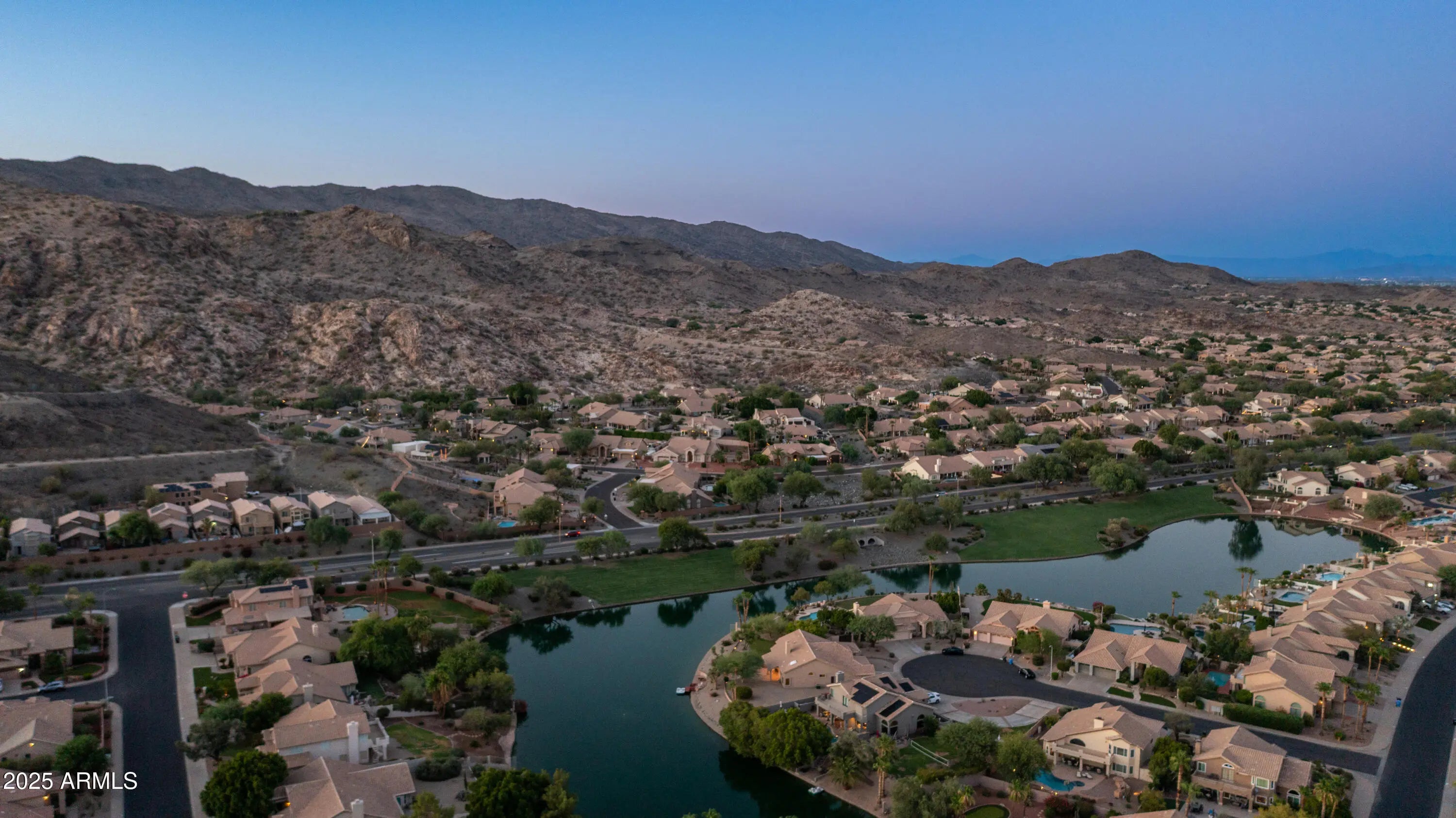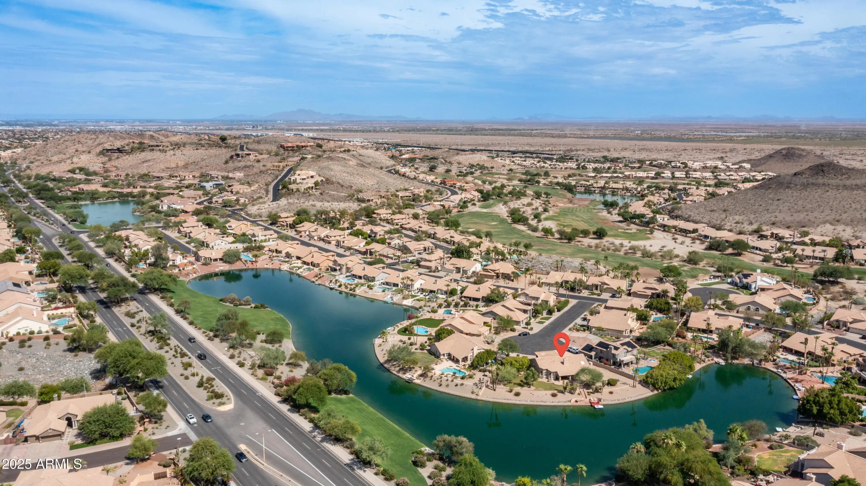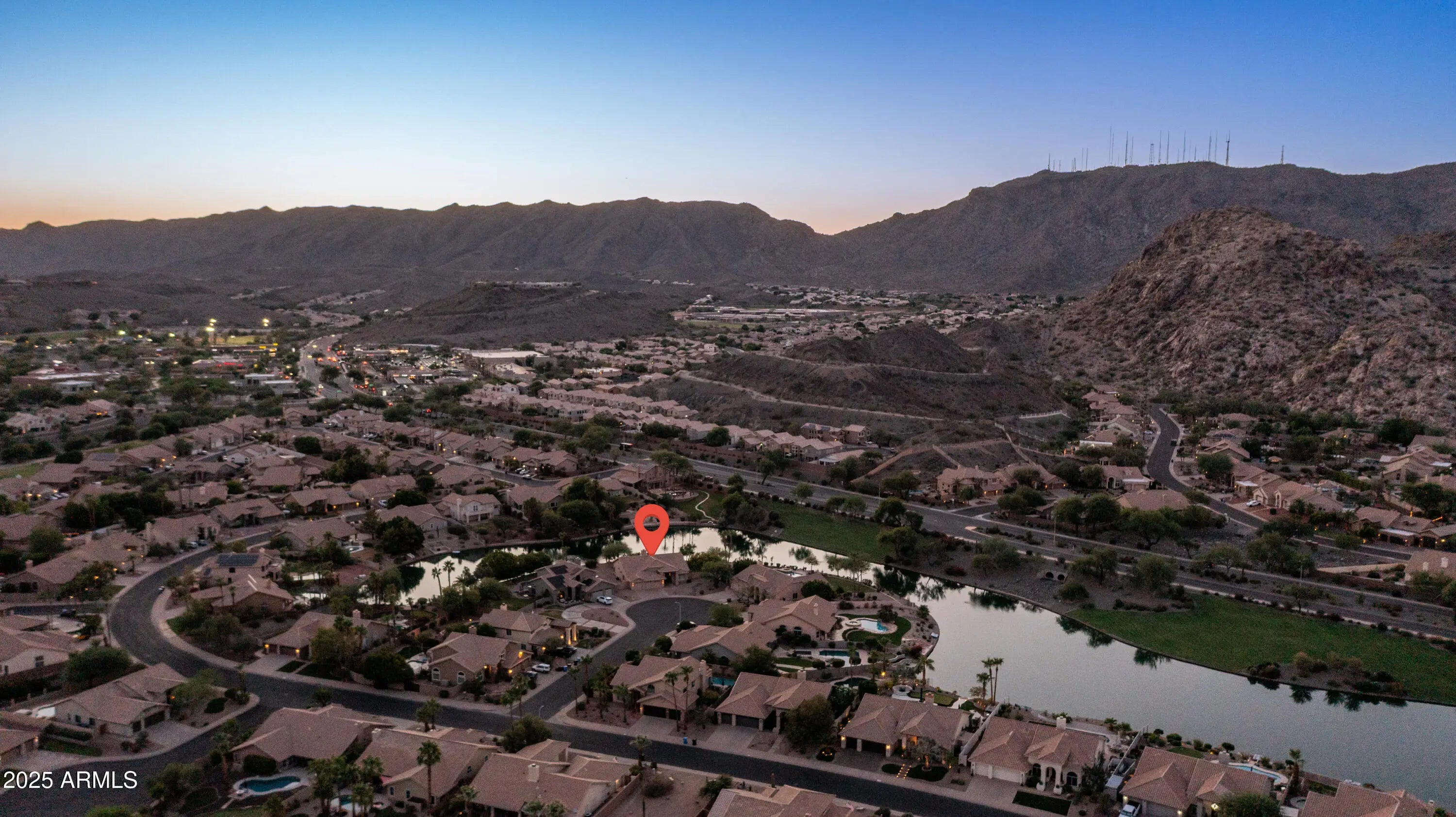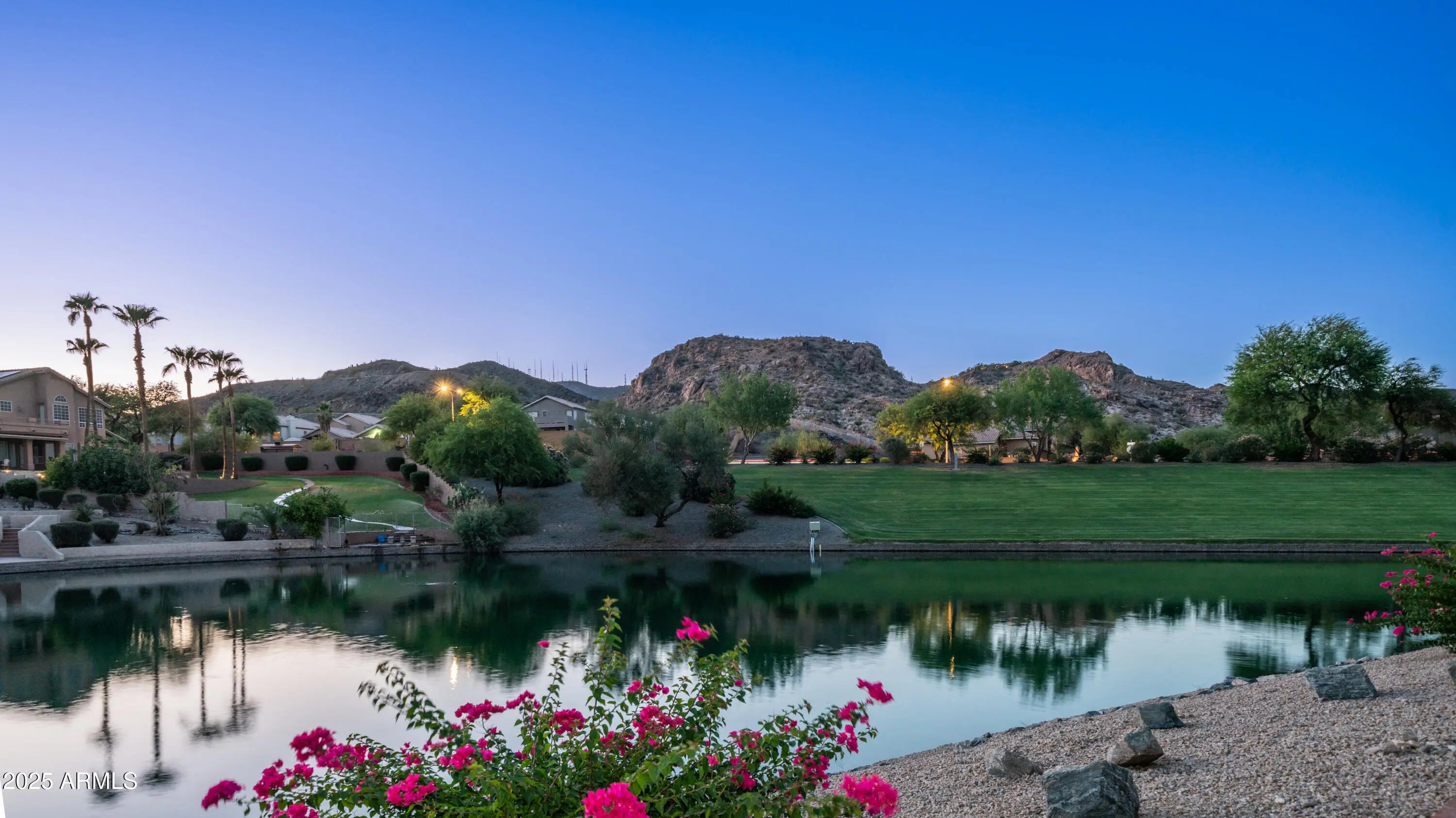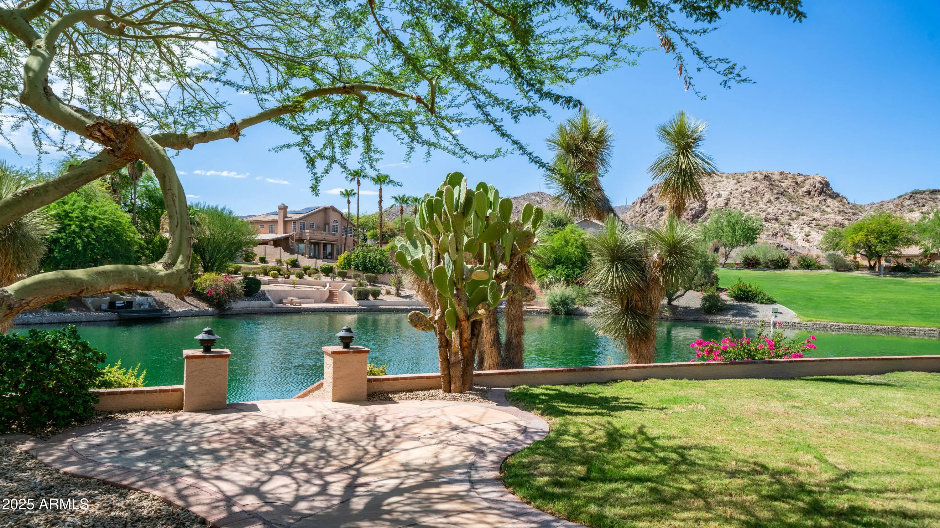 Discover a once-in-a-lifetime opportunity to own one of the largest lakefront lots in Canyon Springs. This exceptional single-story home is immaculately maintained and nestled on an expansive cul-de-sac lot, offering serene waterfront views, unmatched privacy, and exclusive access to a lakeside lifestyle. Step outside to your private dock, complete with a fire pit and a pedal boat, providing effortless access to tranquil waters and the ultimate lake experience. Enter a world of luxury and comfort in this thoughtfully designed home. Neutral tile floors flow seamlessly through the main living areas, while plush carpeting adds warmth to select spaces. The heart of the home features an updated kitchen that dazzles with custom cabinetry, gleaming Corian countertops, and a spacious island with abundant storageperfect for casual dining or sophisticated entertaining. The primary suite serves as a private retreat, offering direct access to the backyard and an updated bathroom that boasts custom cabinetry, dual vanities, sleek countertops, and a spa-like oversized shower. The fully outfitted custom closet combines thoughtful organization with elevated design, blending form and function effortlessly. Two generously sized secondary bedrooms and an updated secondary bath, featuring a custom tiled shower and ample storage, ensure comfort for family or guests. Additional features include a large laundry room and a spacious 3-car garage, complete with cabinets and fresh epoxy-coated floors. 3rd bedroom is currently being used as a den. Pictures are virtually staged. Enjoy stunning lakefront views and incredible mountain scenery in the highly sought-after Ahwatukee Foothills area.